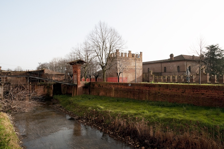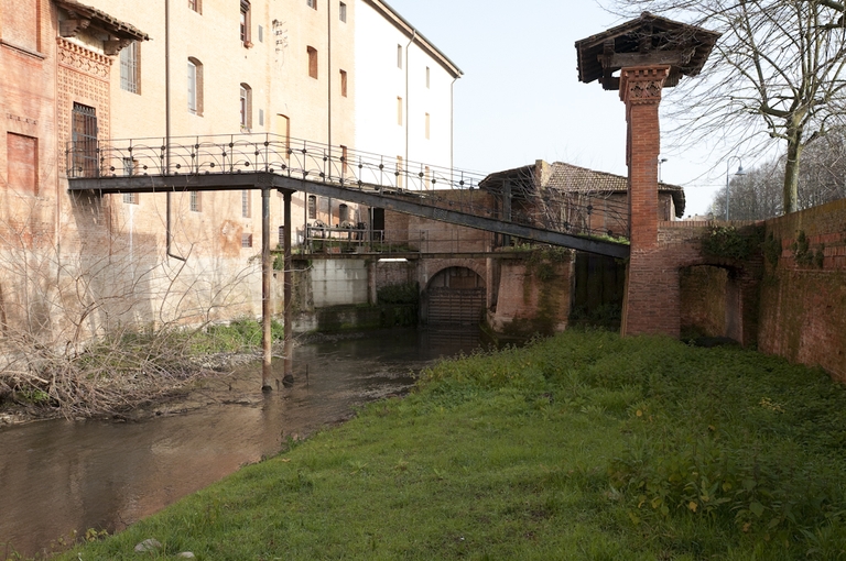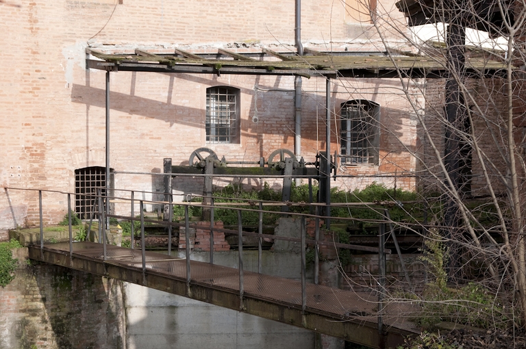 Il mulino, costruito lungo il Canale Navile nel 1358 da Guido Lambertini su concessione del Comune di Bologna, venne acquistato nel 1451 da Giovanni Bentivoglio al quale dal 1471 il Papa Sisto IV concesse la custodia della torre del Poledrano e tutti i proventi del mulino. L’opificio, realizzato a poca distanza dal Castello, ricevette un decisivo impulso alla fine dell’Ottocento con la gestione dei Pizzardi, imprenditori agrari attivi nel campo industriale, divenuti proprietari della Tenuta Bentivoglio. Nel 1890 furono portati a termine i lavori di ampliamento della struttura che venne parzialmente riedificata ed elevata di tre piani. L’opificio assunse così la sua fisionomia definitiva anche se un ultimo corpo, antistante la conca di navigazione sul canale, fu aggiunto qualche anno dopo. Intorno al 1920, con alcuni atti di donazione, Carlo Alberto Pizzardi trasferì le proprietà della Tenuta Bentivoglio, compresi gli edifici industriali, all’Amministrazione degli Ospedali di Bologna che richiese immediatamente un progetto di trasformazione del mulino e della pila all’Officina Calzoni, con l’intenzione di adattarli alle mutate esigenze dell’industria molitoria. Il nuovo impianto entrò in funzione solo nel 1926 mantenendo, accanto al mulino a cilindri, anche quello a palmenti, il cui numero venne ridotto. La produzione proseguì sino al periodo bellico che condizionò le attività, senza interromperle. L’edificio, la cui ciminiera era stata abbattuta per sfuggire ai bombardamenti, venne seriamente danneggiato dalle truppe tedesche prima della liberazione di Bentivoglio. Gli anni successivi alla guerra furono segnati da crescenti difficoltà legate alla presenza di mulini dotati di moderni impianti e da un minore interesse da parte della proprietà alle sorti dell’edificio. All’inizio degli anni settanta, venne interrotta la produzione del reparto a cilindri, quindi quella a palmenti, infine terminò la compravendita di granaglie e prodotti della macinazione. Nel 1980, con il trasferimento degli immobili ospedalieri alle amministrazioni locali, il mulino è divenuto proprietà del Comune di Bentivoglio. Nel corso degli anni, seguiti alla sua dismissione, l’impianto è stato oggetto di vari interventi di manutenzione che hanno tutelato l’integrità della parte superstite dell’edificio.