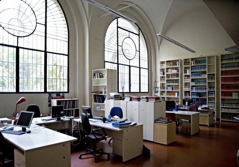 L’ambientazione e l’arredamento della Biblioteca e di una delle due aule di lezione dell'Istituto di Storia dell'Arte dell'università di Bologna conservano pregevoli esempi dell’opera di Enrico De Angeli (1900-1979), architetto bolognese dalla notevole personalità artistica: a questo artista De Angeli, coadiuvato dai colleghi Leone Pancaldi e Vittorio Savi, sono dovute in particolare la realizzazione delle raffinate scaffalature in legno a ballatoio, contenenti dei cassetti in stile destinati gli schedari; De Angeli realizzò anche gli arredi e l’ambientazione dell’originale aula di lezione (aula II) strutturata in forma teatrale (una sorta di piccola platea con palcoscenico): era dotata di un sistema di proiezione di immagini funzionale ai corsi di storia dell’arte che qui videro attivi – tra gli altri – celebri Maestri quali Roberto Longhi e Rodolfo Pallucchini. Pancaldi realizzò la sala riunioni, completa di tutti gli arredi.