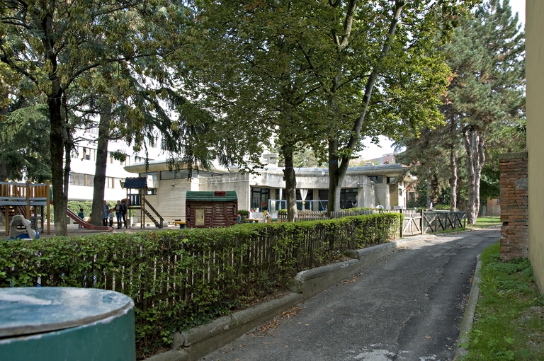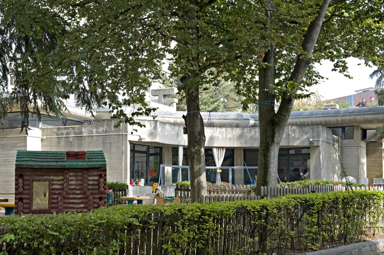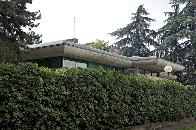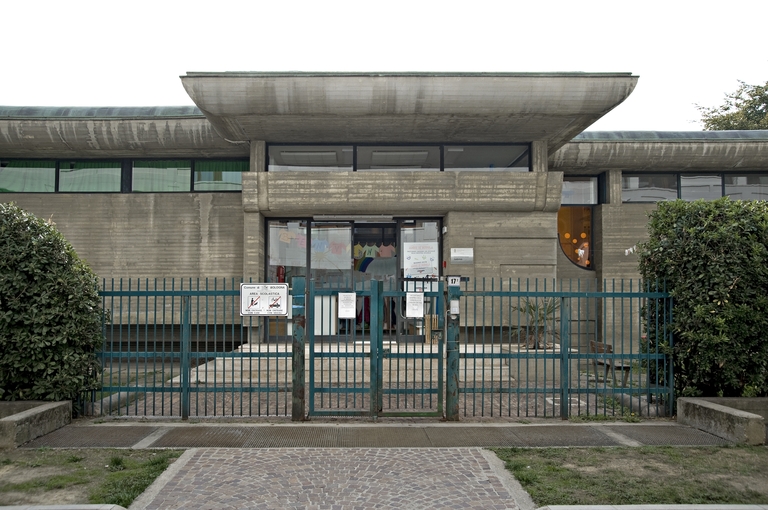 A fianco dell’edificio direzionale che ospiterà la sede della Regione, Pancaldi realizza questa struttura educativa, che presenta un assetto alquanto originale. All’interno la luce naturale proviene in gran parte dall’alto, attraverso finestre a nastro che delimitano nettamente le pareti a ridosso dei soffitti, concentrando le visuali esterne a specifiche aperture, rivolte al giardino di pertinenza. L’edificio mostra all’esterno un corpo in cemento armato a vista alquanto compatto, che esprime un forte senso di protezione rispetto a quanto ospita all’interno. Un tema che ricorda il coevo progetto della nuova Galleria d’Arte Moderna. Il tetto è sorretto da un grande cornicione sagomato e aggettante fino a costituire protezione alle facciate e agli spazi sottostanti. Le foto d’epoca mostrano arredi altrettanto originali, in parte appositamente progettati.