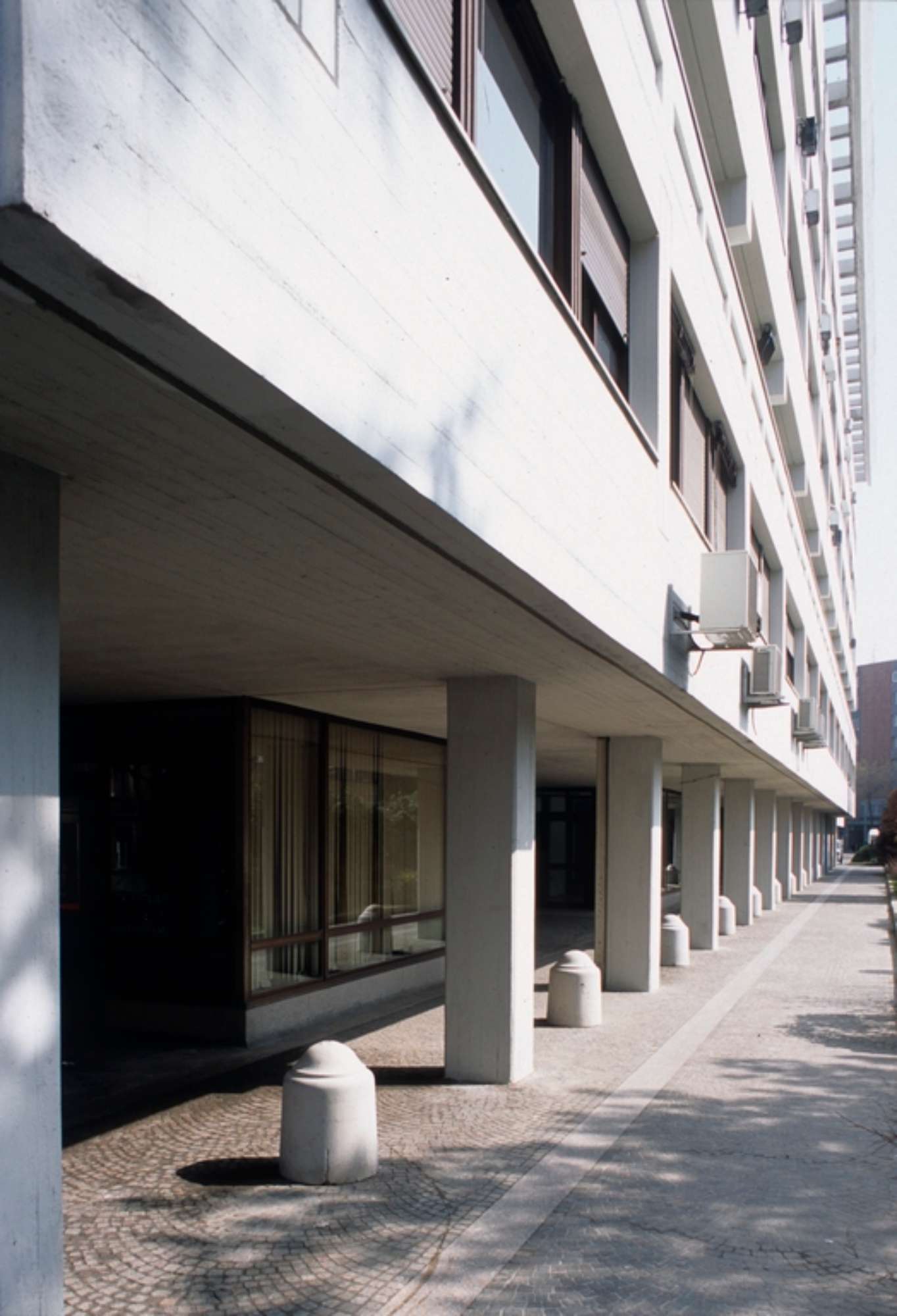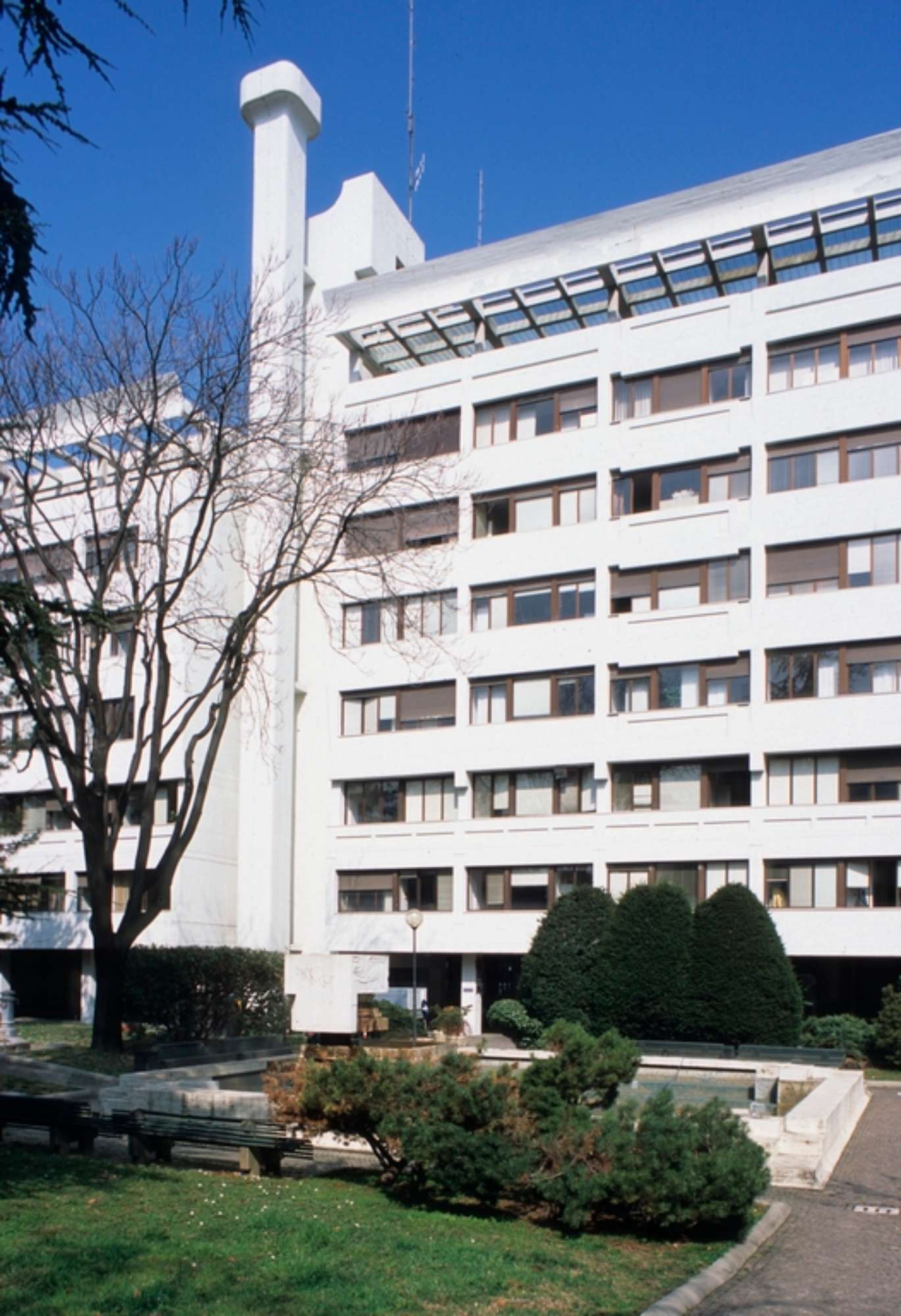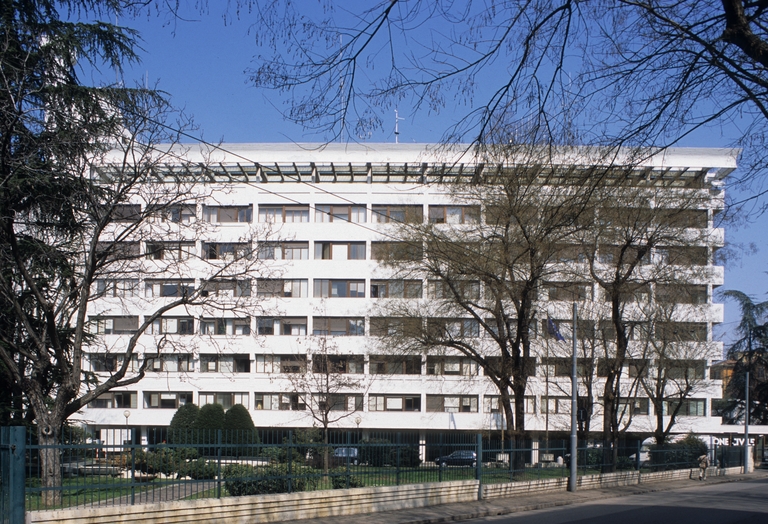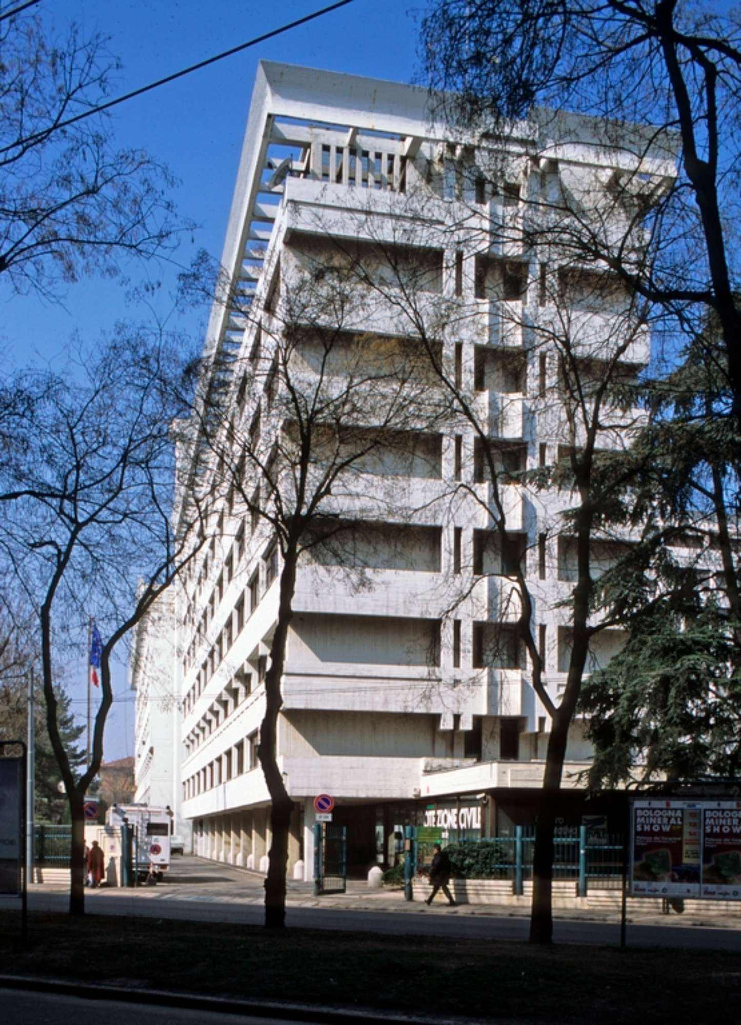 Questo edificio ha accolto la Regione Emilia-Romagna a partire dai primi anni ’70, poco dopo la sua istituzione, risalente al giugno 1970. Il progetto aveva evidentemente una iniziale destinazione residenziale, come si può dedurre da alcune sistemazioni interne, che mostrano distribuzioni e finiture consone all’uso domestico. Per accogliere la nuova istituzione, nel 1971 viene realizzata la sala del consiglio. Tale modifica segue di pochi mesi il compimento dell’edificio secondo l’iniziale progetto. Altre integrazioni verranno eseguite in vari anni a seguire, fino al progressivo trasferimento dei vari settori nell’attuale Fiera District, attivata a partire dal 1985. Il progetto mostra chiari riferimenti alle poetiche del Brutalismo architettonico che sperimenta la capacità espressiva del cemento armato a vista, che qui viene impiegato per definire l’intera volumetria dell’edificio, con particolare riguardo ai coronamenti di sommità, che costituiscono di fatto le parti più visibili nell’intorno della città costruita. Un sistema di terrazzi attrezzati e di pergolati, anche questi in calcestruzzo, rende sfruttabili le coperture, offrendo un panorama di grande bellezza. In epoca recente le facciate sono state oggetto di un restauro manutentivo, che ha parzialmente replicato il caratteristico colore bianco dell’impasto cementizio originario. Le aree verdi al piede degli edifici sono accessibili al pubblico e collegano con efficacia le strade adiacenti, accogliendo sistemazioni e arredi a cui Pancaldi ha dedicato una speciale attenzione; in particolare si segnala la fontana, sormontata da un leone di San Marco a bassorilievo, emblema delle Assicurazioni Generali, società proprietaria dell’immobile.