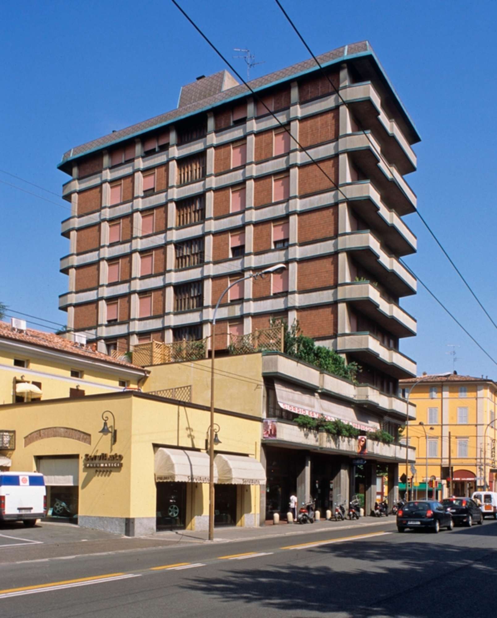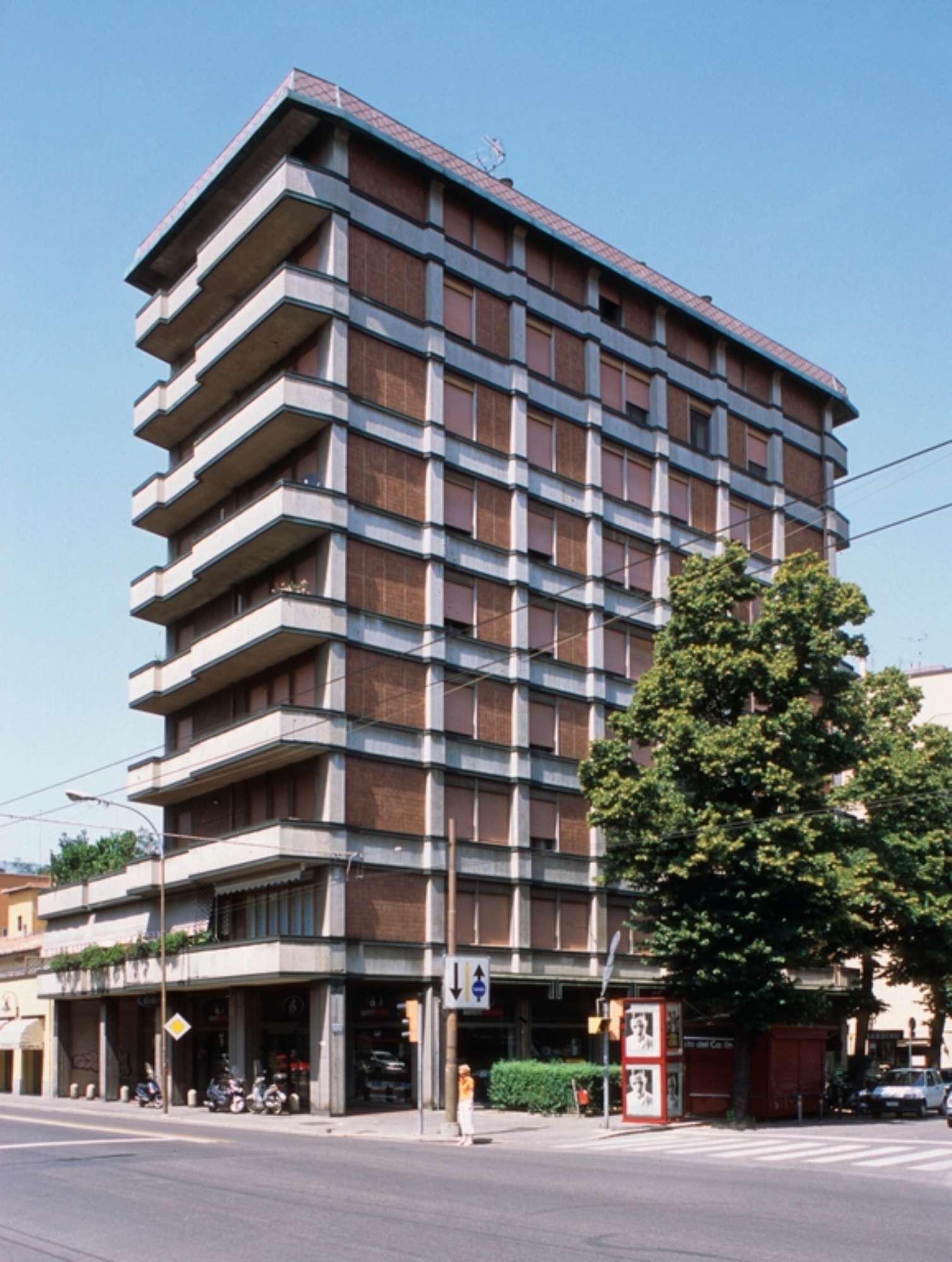 Alto e leggero edificio residenziale con galleria di negozi a piano terra e portico. Realizzato in cemento a vista nelle modanature e rivestimento rosso mattone. Si tratta di una costruzione molto leggera, che si sviluppa in altezza e riprende nei paramenti il tipico colore rosso Bologna.