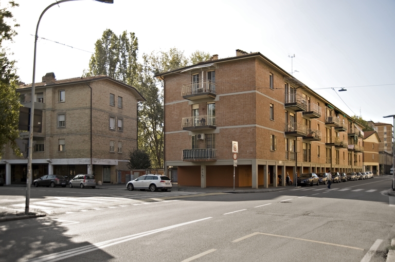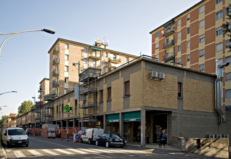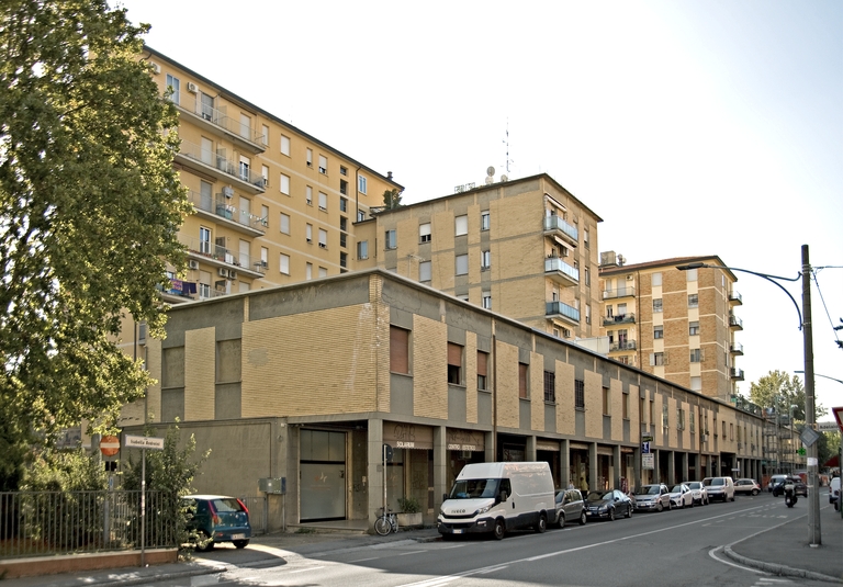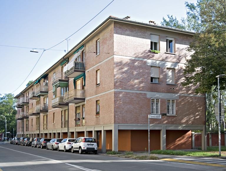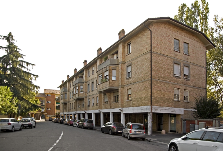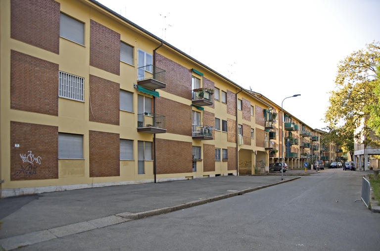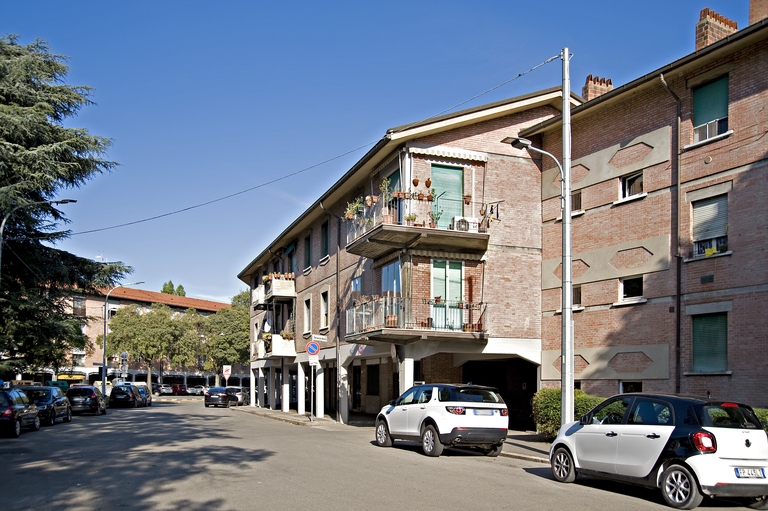 L’insediamento INA Casa ideato dalla celebre cooperativa professionale di Reggio Emilia (la prima di tale genere in Italia), sviluppa uno schema del tutto libero che registra e affianca comunque le preesistenze, rappresentate dalla via Andreini e dal rilevato ferroviario della Cintura merci. La disposizione sinuosa degli edifici, tutti di altezza contenuta e dotati di varchi passanti di collegamento, genera una serie di spazi urbani assimilabili a piazze-giardino, che rappresentano la connessione tra l’ambito pubblico e quello semi-privato delle case; analoga funzione è svolta dai bassi porticati che costeggiano le strade d’ambito, e che costituiscono un elemento del tutto originale e inconsueto nella tradizione progettuale dell’INA Casa.Facciate in mattoni a vista, bow-window e logge, comignoli particolarmente strutturati, muri e cancellate di recinzione costituiscono gli elementi architettonici distintivi di questo villaggio, che mostra chiaramente l’influsso della cultura progettuale britannica e nord europea. All’interno dell’abitato, in una ampia area a verde, è accolta e protetta la struttura scolastica appositamente realizzata per il villaggio.