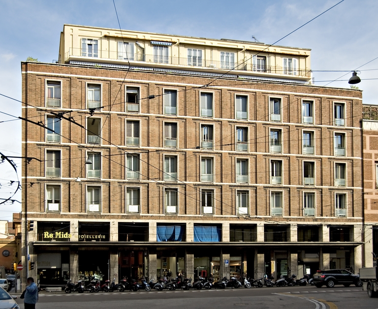 Nel 1949 è bandito un concorso nazionale per la sistemazione del lato di levante di via Roma (poi Marconi), corrispondente ad una parte dell'antico Borgo delle Casse. Comprende anche la progettazione dell'edificio di testata, opposto al Palazzo del Gas.