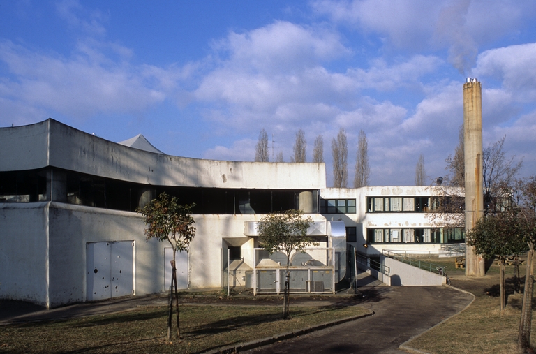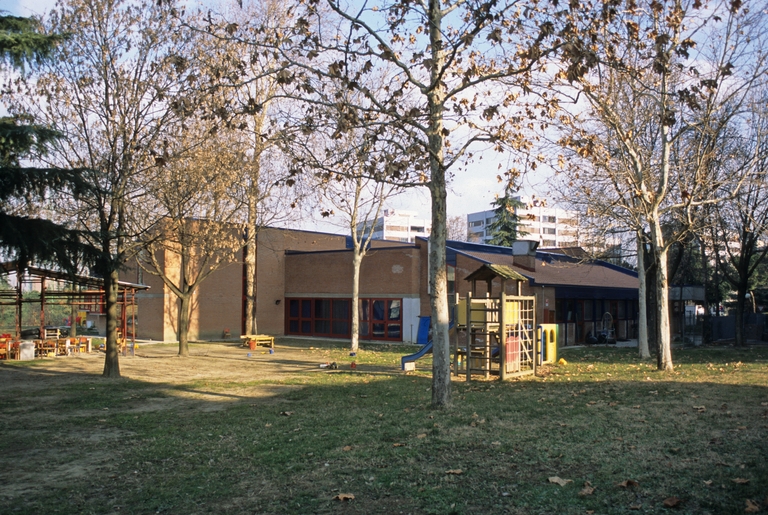 Lullini e Boschi progettano questo polo scolastico concependo una serie di edifici in cemento con pareti curvilinee, concave e convesse, con ampie finestre che interrompono le superfici murarie e inondano di luce le aule.