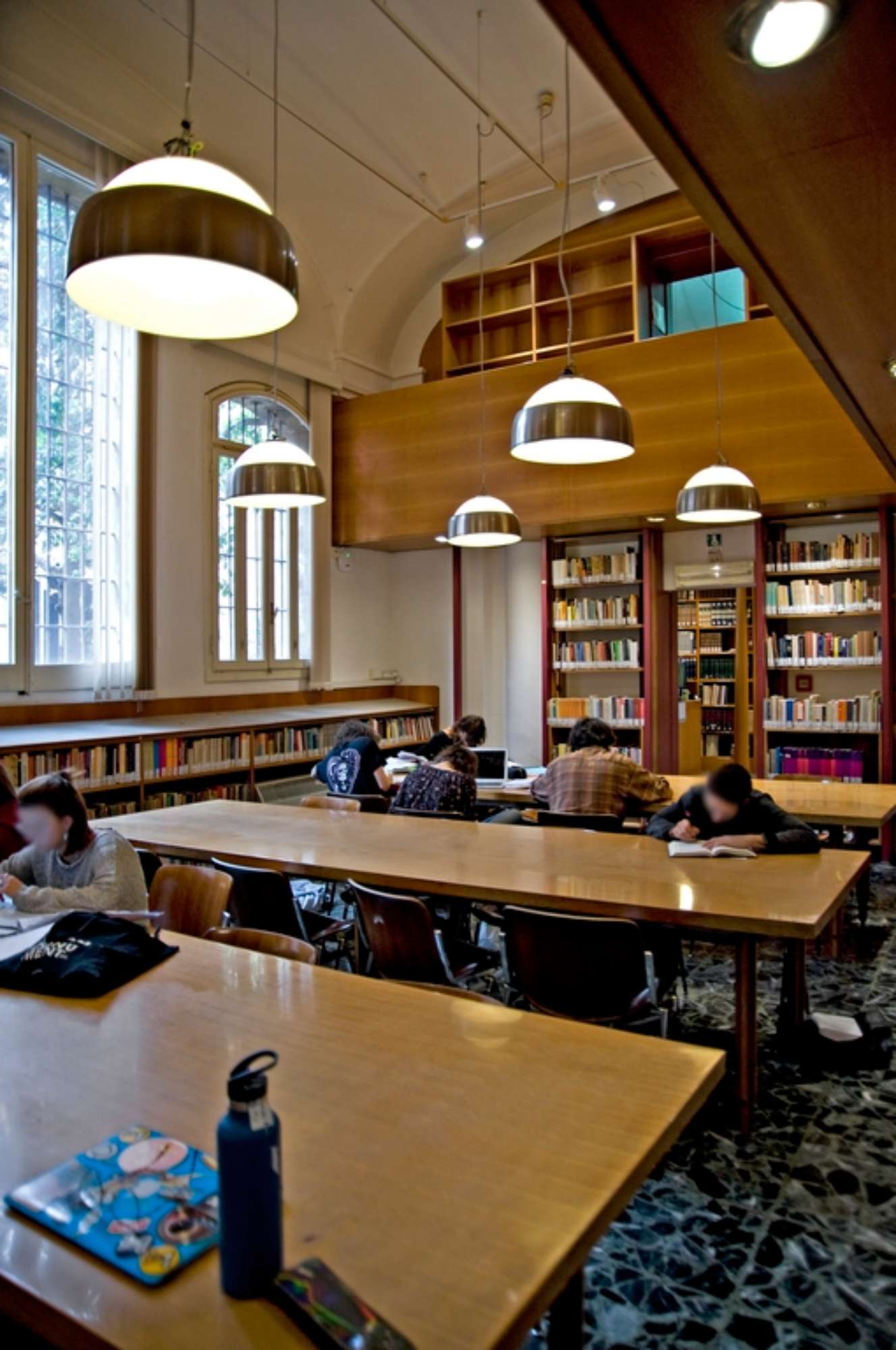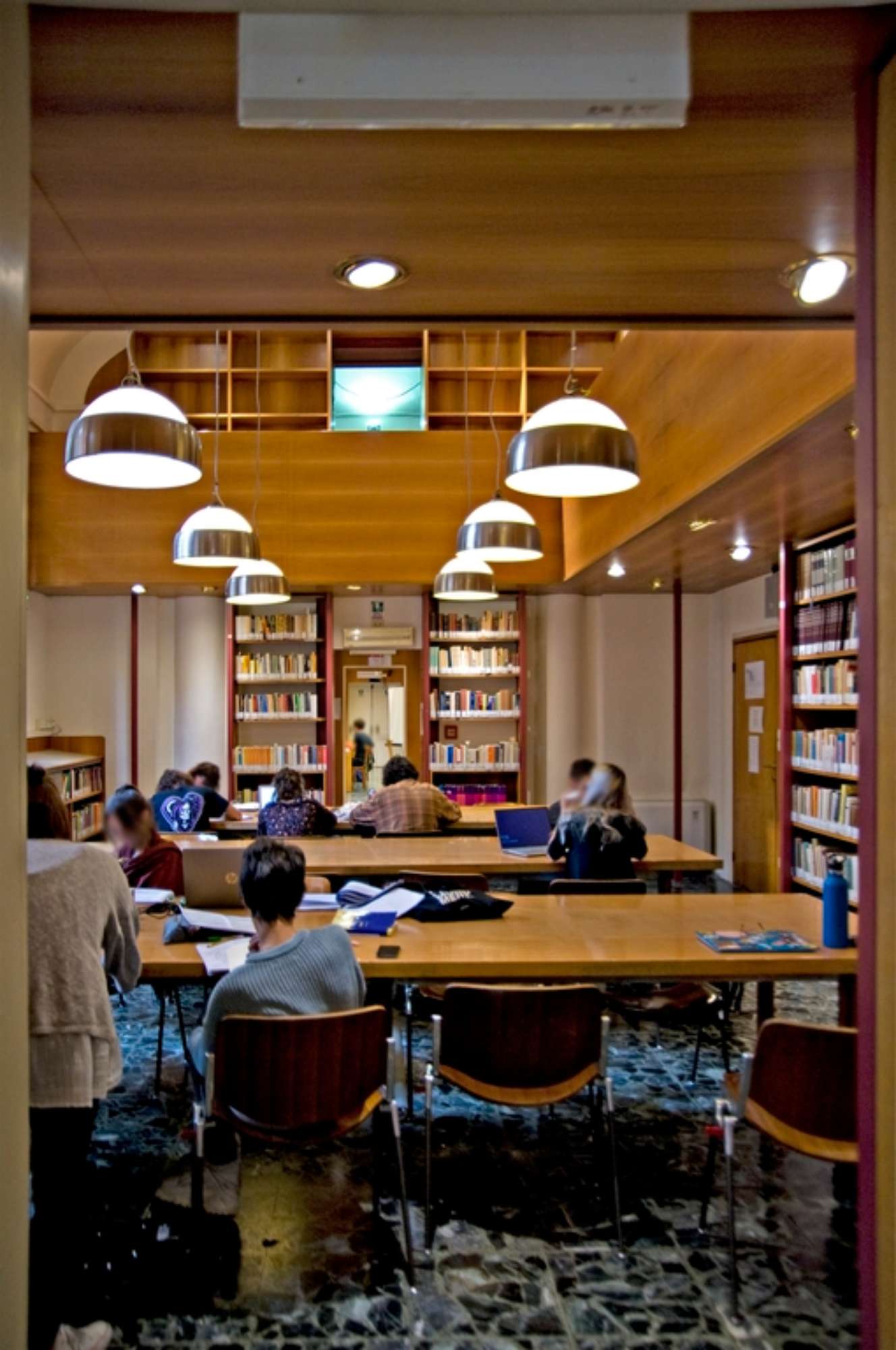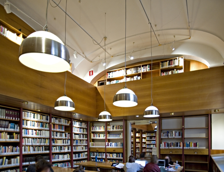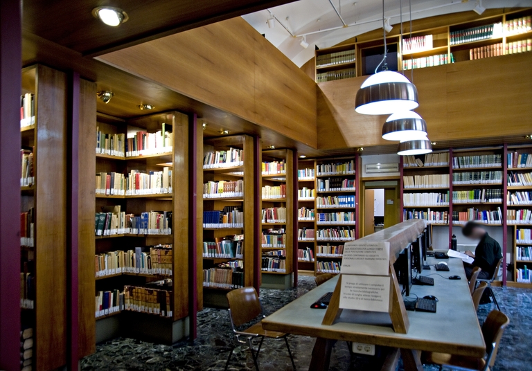 L’ambientazione e l’arredamento della Biblioteca e di una delle due aule di lezione conservano pregevoli esempi dell’opera di Enrico De Angeli (1900-1979), architetto bolognese dalla notevole personalità artistica. A questo artista, coadiuvato dai colleghi Leone Pancaldi e Vittorio Savi, sono dovute in particolare la realizzazione delle raffinate scaffalature in legno a ballatoio contenenti dei cassetti in stile destinati gli schedari, gli arredi e l’ambientazione dell’originale aula di lezione (aula II) strutturata in forma teatrale (una sorta di piccola platea con palcoscenico) e dotata di un sistema di proiezione di immagini funzionale ai corsi di storia dell’arte che qui videro attivi, tra gli altri, celebri Maestri quali Roberto Longhi e Rodolfo Pallucchini. Del 1990-91 è il progetto di ampliamento della biblioteca a cura di Vittorio Savi e Guglielmo Renzi.