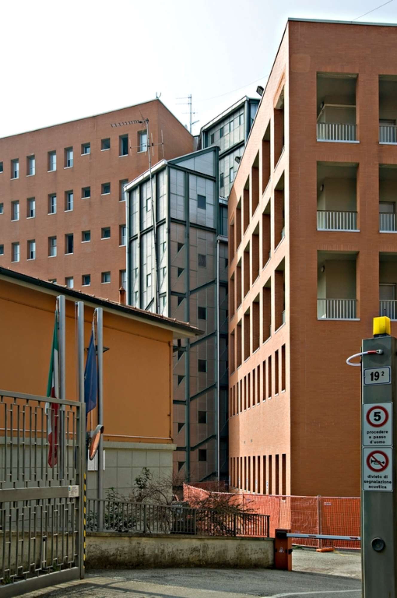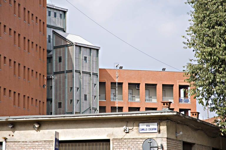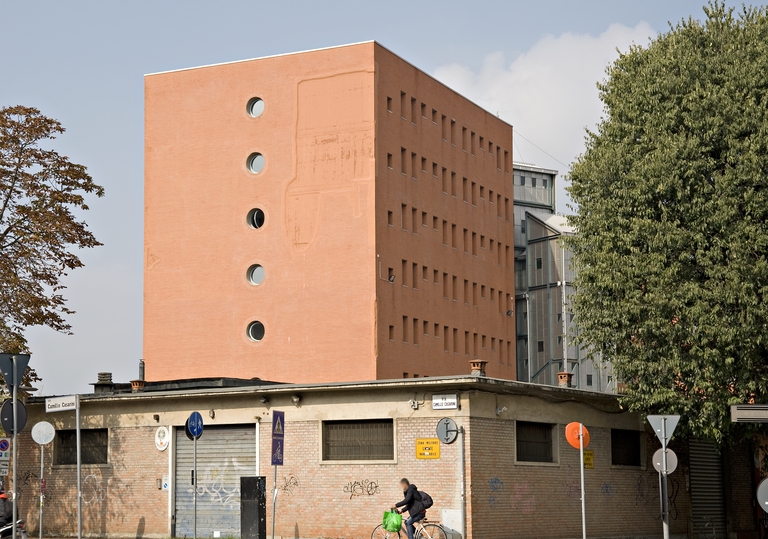 Il nuovo corpo di fabbrica presenta un’impronta a terra di 12 per 56 m ed è alto cinque piani – per un’altezza totale di 20 m, esclusi i vani tecnici in copertura. L’ambito di intervento in cui si inserisce il nuovo edificio della Guardia di Finanza si trova a ridosso di un areale ferroviario. Coerentemente con le indicazioni del Demanio, il corpo di fabbrica si sviluppa sull’asse est-ovest in corrispondenza del sedime del magazzino da demolire, con una profondità di 12 metri che riprende, prolungandolo, il corpo a 2 piani della palazzina uffici esistente. Il volume degli uffici si sviluppa con arretramenti – o setback – della volumetria lungo l’asse longitudinale. In tal modo si passa da 56 m (piano terra) a 30 m di sviluppo longitudinale (piano quarto). Tale sviluppo a setback è ulteriormente enfatizzato dall’arretramento del vano tecnico in copertura, dove trovano alloggio le apparecchiature a servizio dell’edificio. In corrispondenza degli arretramenti, sempre sui tetti sono realizzate terrazze verdi. Questa impostazione permette di realizzare delle vedute verso la città storica di Bologna e di relazionarsi volumetricamente con la palazzina a est, mentre la parte più alta dell’edificio, a ovest, trovandosi più prossima agli areali ferroviari gode di una vista panoramica, verso la pianura, oltre i binari.