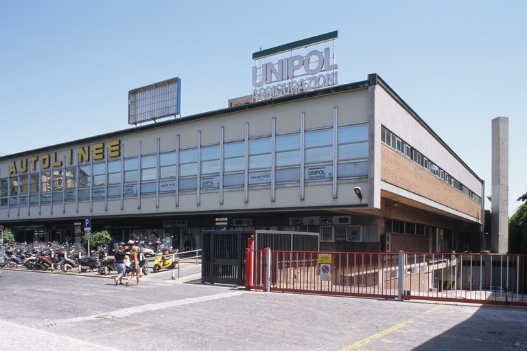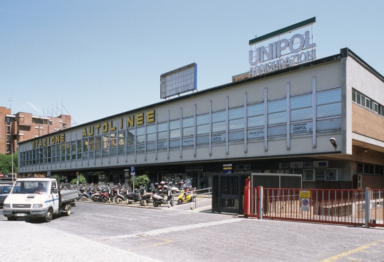 L’autostazione, una delle più grandi di Europa, è stata inaugurata nel 1967; il progetto, vincitore del concorso nazionale del 1956, dedicò particolare attenzione allo studio delle parti strutturali, con soluzioni ancora oggi notevoli. I grandi sporti della pensilina di ingresso e della tettoia dell’area partenze propongono un’ideale apertura verso la città. Il vasto piazzale di manovra, a quota rialzata, è in realtà la copertura dell’altrettanto ampio garage seminterrato, per un ottimale sfruttamento del lotto. Fulcro tra centro e periferia, I’edificio è nato in luogo della Casa della GIL (Gioventù Italiana del Littorio), danneggiata dai bombardamenti del ‘43.