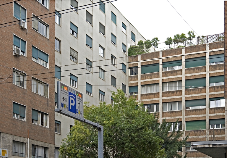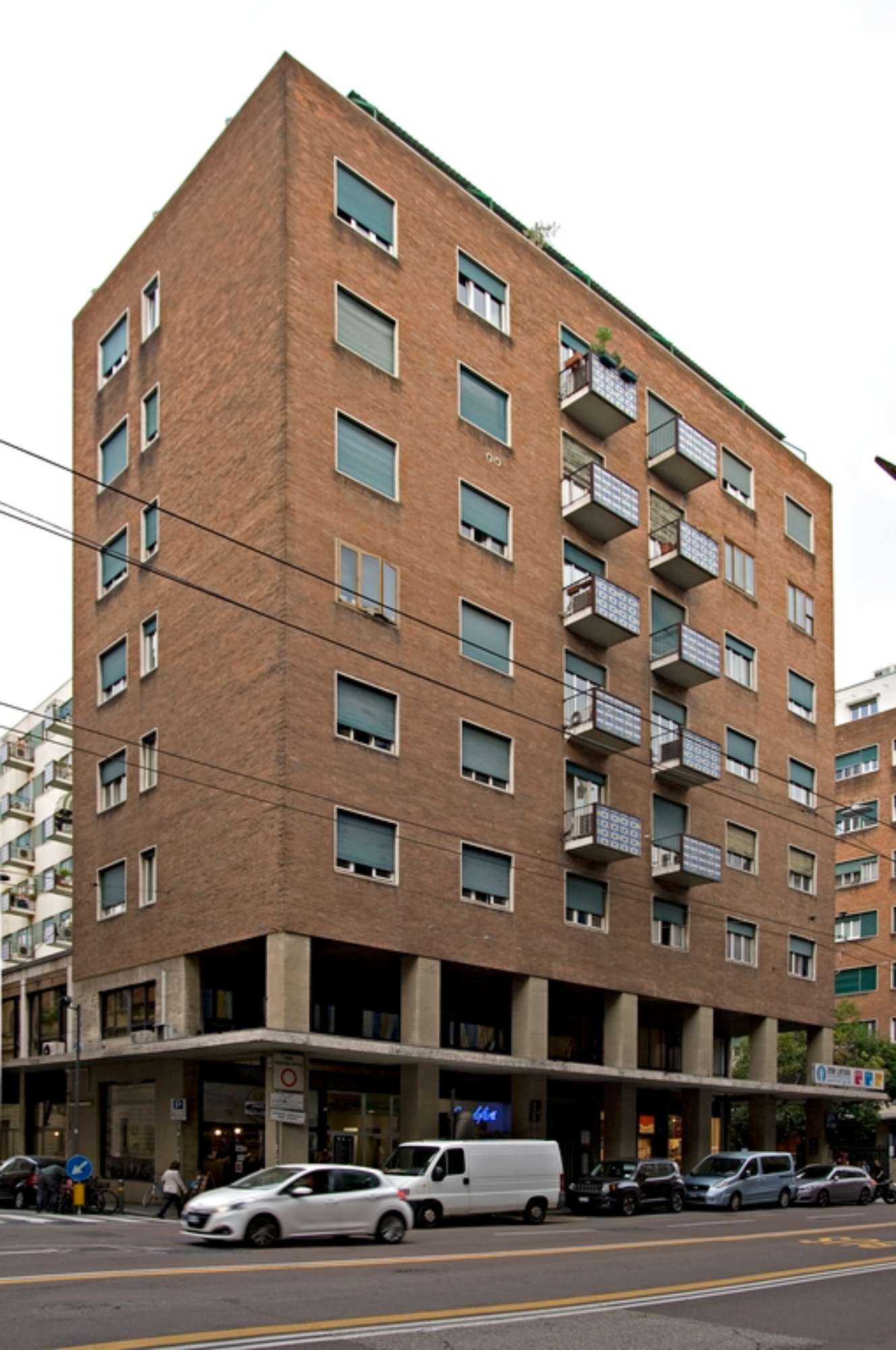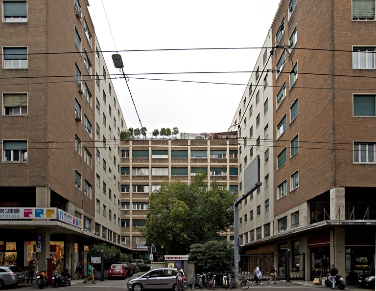 Una prova di bravura questi edifici in cui Santini manipola con calibrata disinvoltura volumi architettonici di notevole dimensione, articolandoli in profondità rispetto al fronte stradale, proponendo visuali prospettiche inaspettate in edilizia intensiva di questo genere. La sobrietà delle varie soluzioni di facciata viene affiancata da un apparato decorativo fatto di mosaici policromatici, che rivestono secondo moduli affini ma sempre diversi i frontali dei balconi, ed anche il soffitto del portico a doppia altezza. Alcune recenti sovrapposizioni (insegne sulla pensilina e tettoie al piano attico) deprimono vistosamente la pulizia del fabbricato.