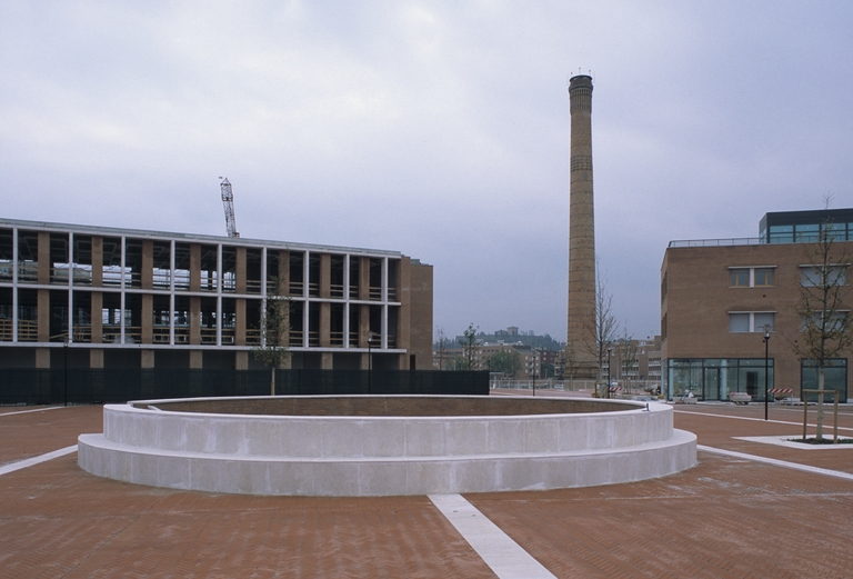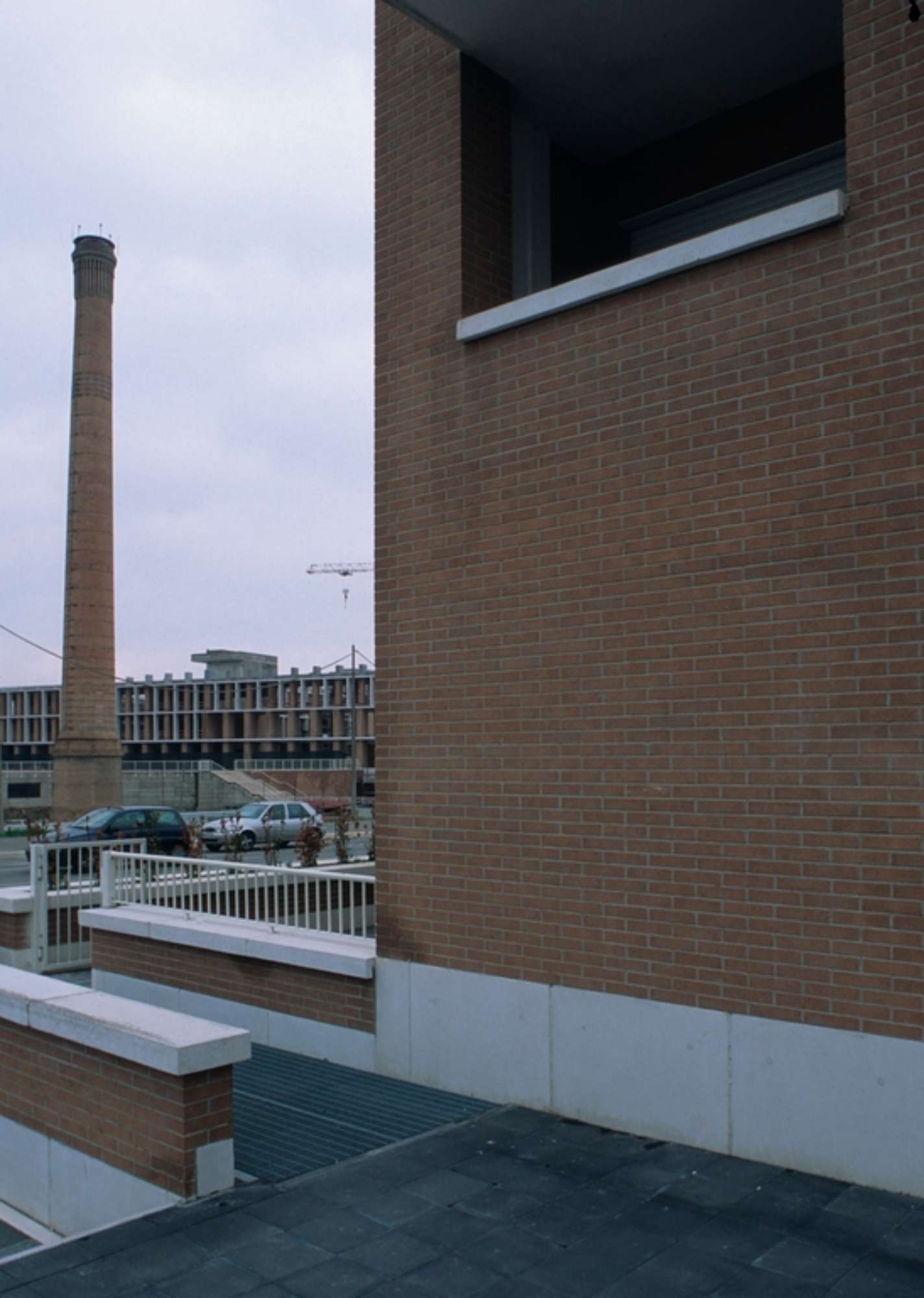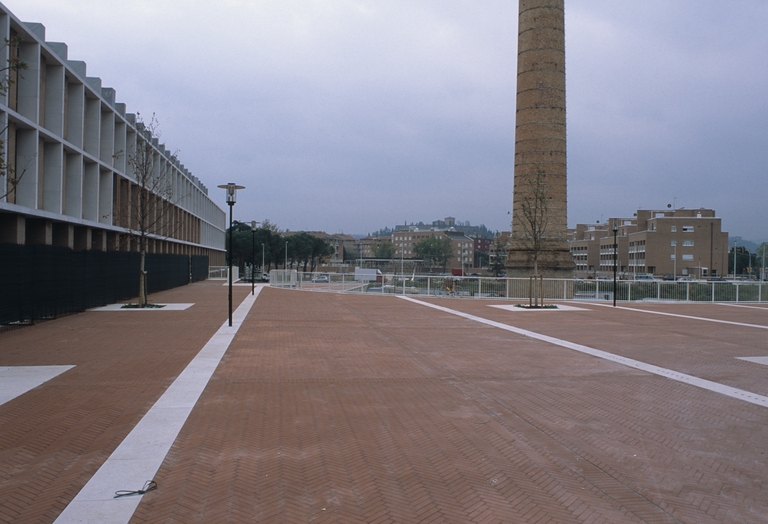 Passando sul versante che caratterizza la forma costruita verso il fiume Savio, la seconda sequenza inizia con una piazza semicircolare realizzata attorno alla ciminiera della vecchia fabbrica, conservata al centro di questo spazio a testimonianza della storia del sito che diventa, nel progetto di riqualificazione, segnale urbano di riconoscibilità. Da questa si sale alla seconda piazza centrale, che a sua volta permette di accedere allo spazio aperto antistante la Facoltà di Architettura. Questa particolare zona appartenente all’area dell’ex-Zuccherificio si apre su due fronti: da un lato verso il fiume e verso un edificio a destinazione mista, dall’altro verso la piazza ribassata dalla quale si accede alla galleria del centro commerciale.