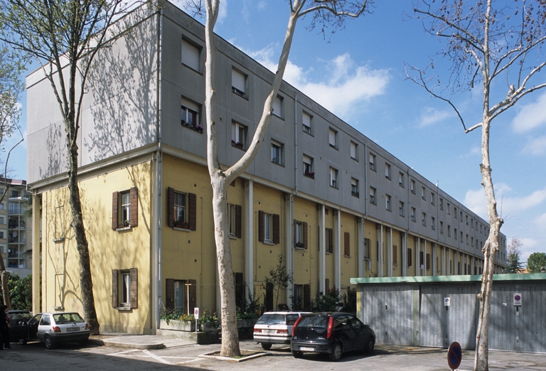 L’intervento rappresenta l’esito del concorso bandito dall’Amministrazione Comunale di Cesena nel 1978, per la ristrutturazione e sopraelevazione di due edifici in linea, nell’ambito della legge 457 del 1978 sul recupero edilizio. I due blocchi di lunghezza complessiva di 260 m, situati parallelamente alla prima circonvallazione est della città, fanno parte di un gruppo di case popolari di proprietà comunale edificato nel 1923, all’epoca della costruzione isolato tra città e campagna in seguito poi, negli anni ’60 e ’70, oggetto di un’espansione urbana. Il progetto nasce in un’ipotesi di crescita edilizia controllata intesa come razionalizzazione dell’esistente, visibile anche nello sfruttamento delle opere di urbanizzazione primaria e secondaria già presenti.