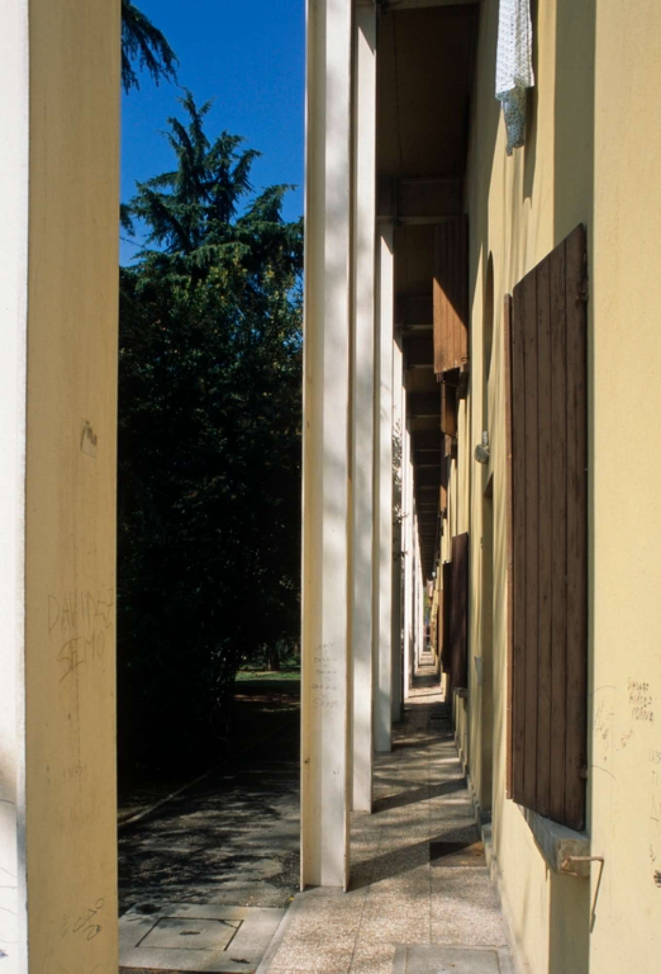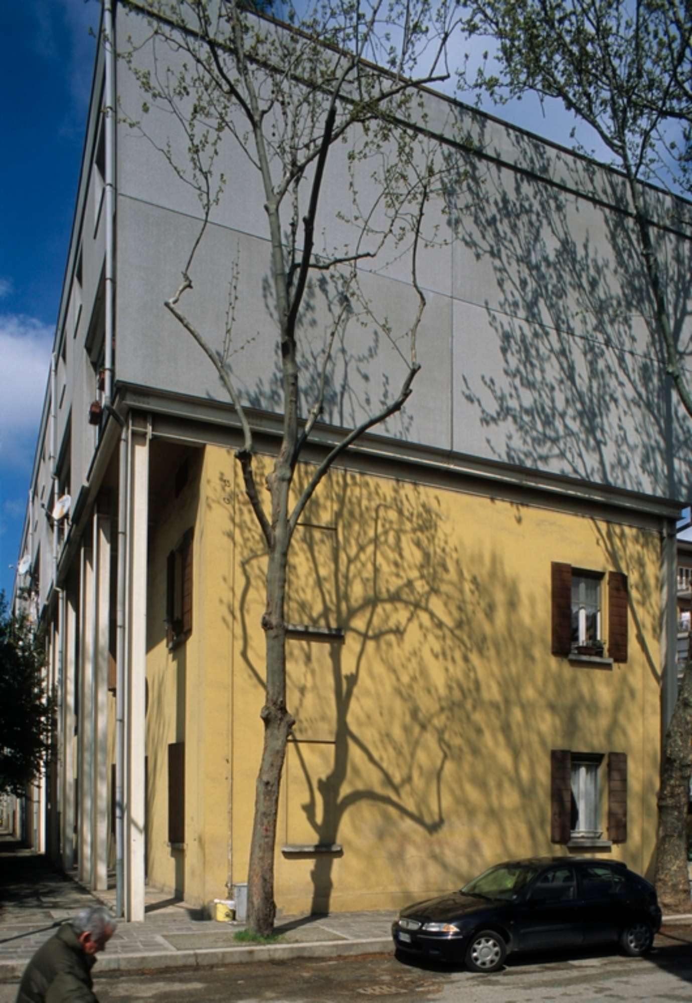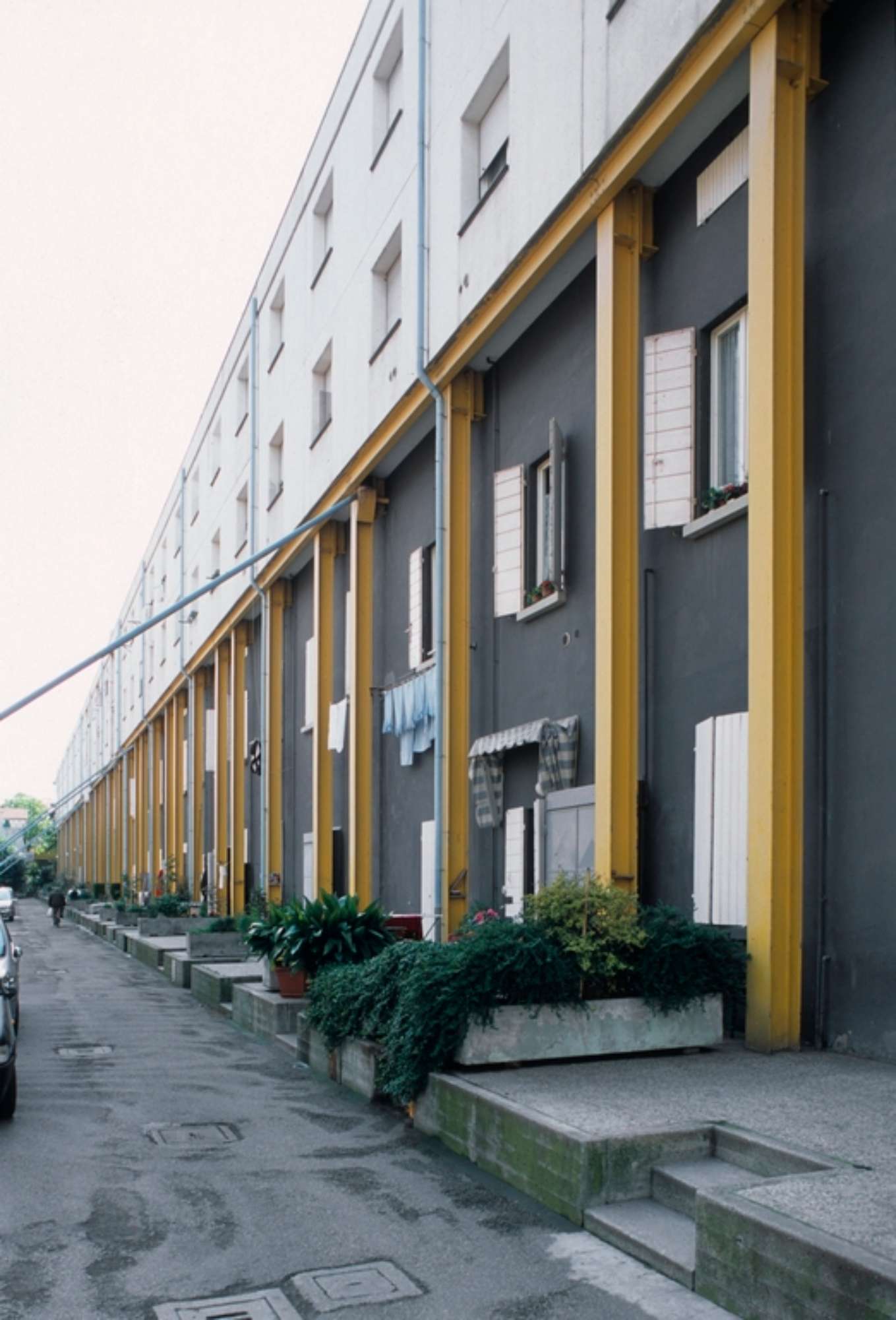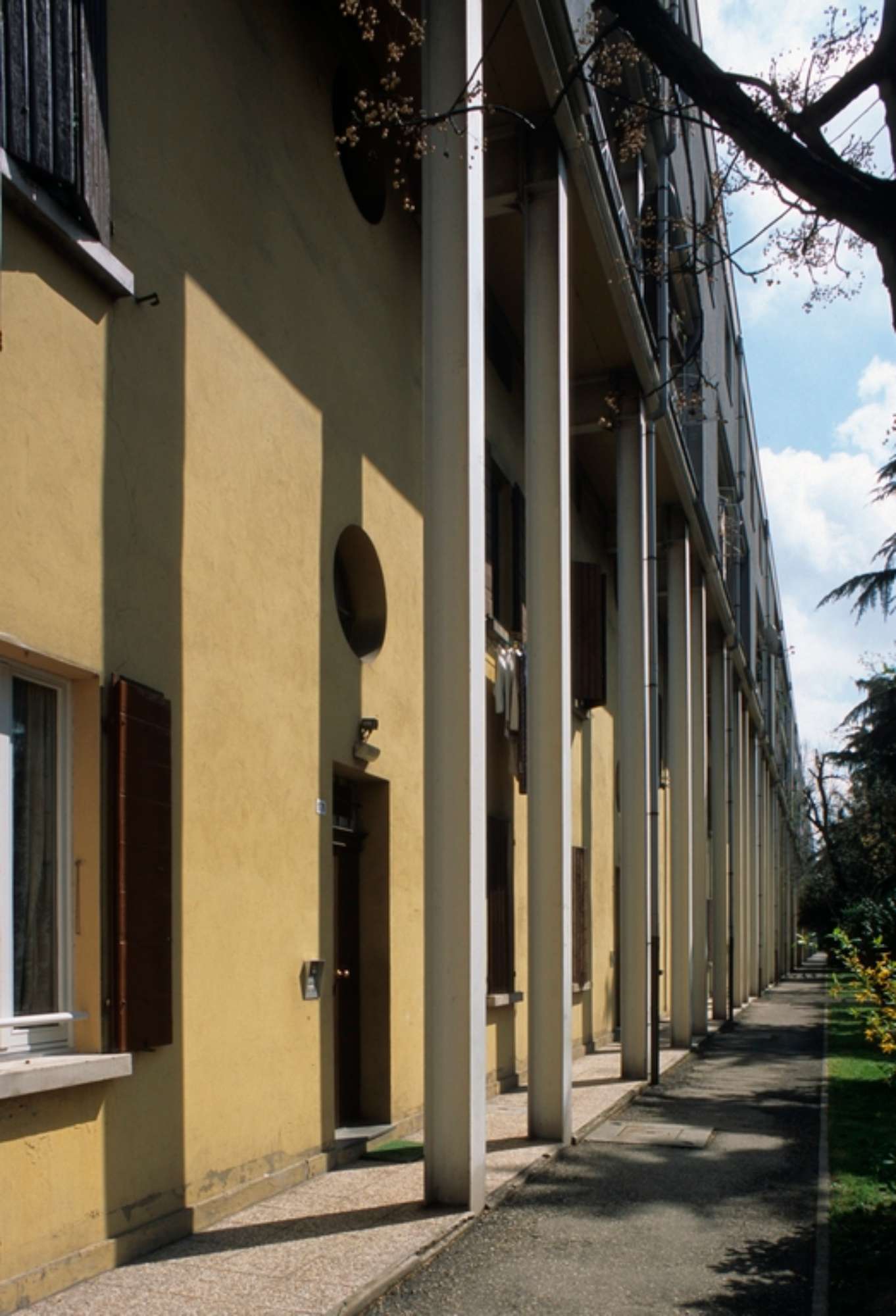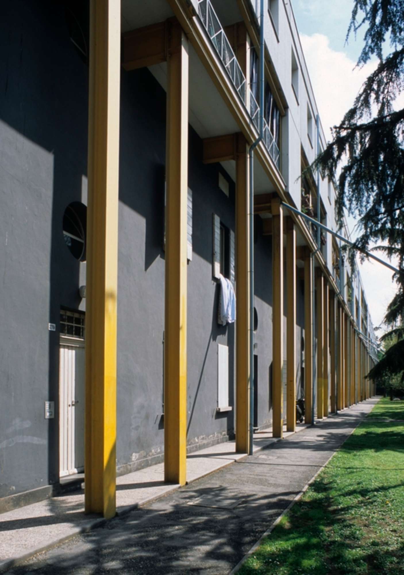 Tale valenza urbana determina la scelta di non aggiungere volumetria fuori dal sedime dei blocchi esistenti, ma di mantenerne l’impronta a terra costruendo il nuovo volume sopra il piano di copertura. Il principio di mantenimento del blocco esistente, poi, non impedisce di operare secondo una netta distinzione delle due parti che fa risultare la nuova parte autonoma dal punto di vista figurative, pur riproponendo gli stessi principi formali di quella sottostante. Il fronte principale dell’edificio è scandito da un porticato formato da ampi portali in ferro, utilizzati per non far gravare il peso della parte nuova sulle fondazioni dell’edificio esistente. I pilastri si distanziano in maniera proporzionata dal fronte e creano un portico davanti ai piani del vecchio edificio. La nuova porzione di edificio è realizzata attraverso tamponamenti in cemento armato prefabbricato per garantire una veloce esecuzione a secco della parte aggiunta, sostenuta da profili verticali HE e IPE in acciaio lasciati in vista. La copertura è anch’essa realizzata in pannelli prefabbricati, ed era inizialmente prevista a botte ribassata. La scansione delle aperture in facciata rispecchia nuovamente il rapporto tra il preesistente e l’ampliamento che governa tutto il progetto, mediante l’adozione di finestre in asse con quelle esistenti sottostanti e l’introduzione di una serie di logge intermedie che uniscono le due parti e modulano la grande altezza dell’edificio. Anche la scelta cromatica utilizzati per l’esterno segue i principi progettuali fin qui descritti: per la parte esistente è stato ripristinato (in uno solo dei due corpi), l’originale giallo vivo per le pareti, bianco per gli infissi e terra di siena per le persiane. Il secondo blocco, invece, presenta ai primi due piani una colorazione grigio scura che stacca nettamente con il giallo dei pilastri in metallo. In entrambi gli edifice, invece, la sopraelevazione presenta le ringhiere dipinte di bianco avorio come gli avvolgibili e gli interni delle logge, mentre i tamponamenti sono grigio cemento. I nuovi alloggi presentano una tipologia a duplex permessa dalla possibilità di non introdurre ascensori. Il lavoro sui collegamenti verticali diventa pertanto un altro tema progettuale fondamentale. I vani scala esistenti vengono prolungati dal primo piano al terzo piano, con l’aggiunta di rampe leggere in ferro e lamiera, mentre il quarto livello è collegato internamente ad ogni singolo alloggio.