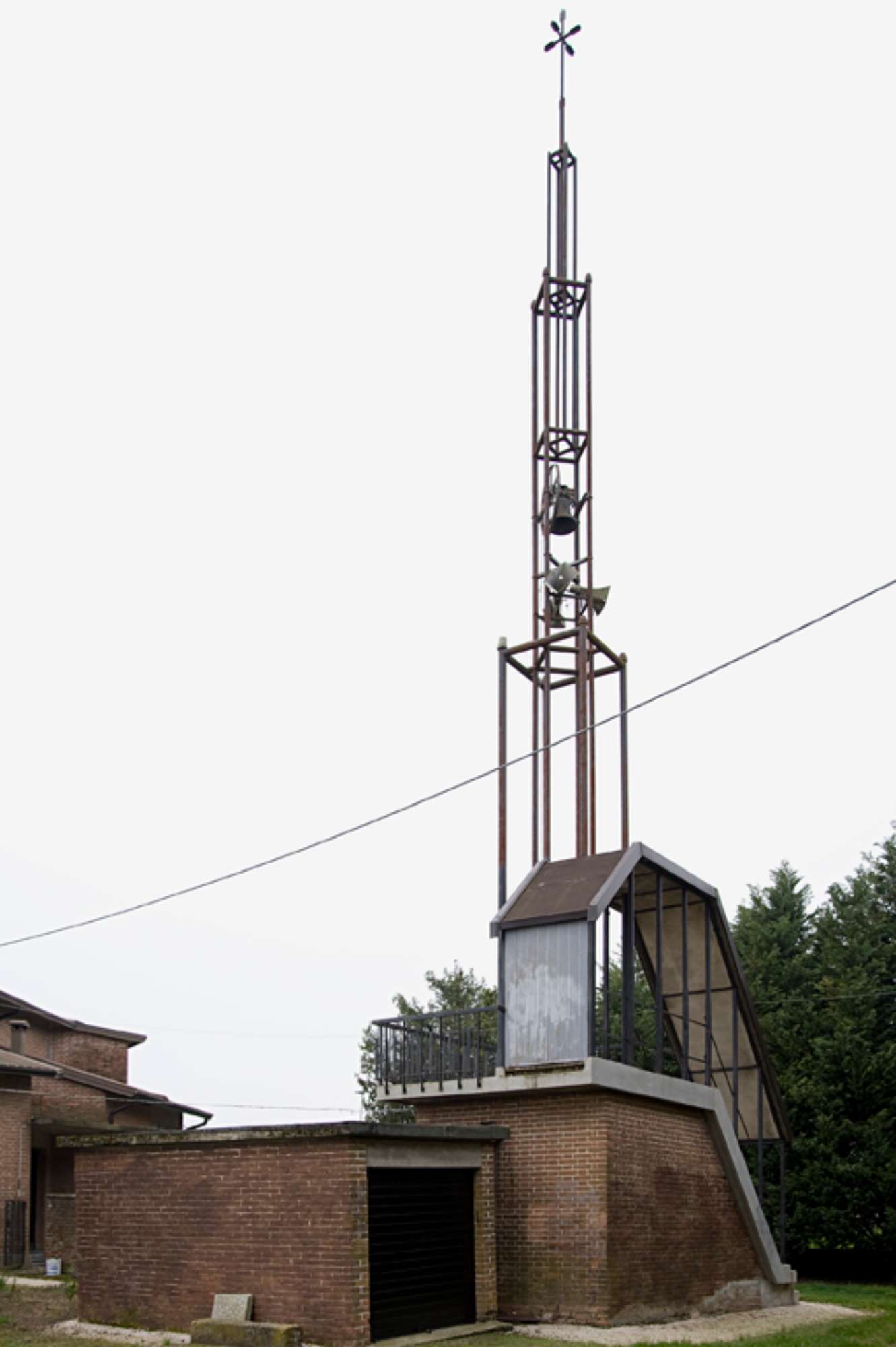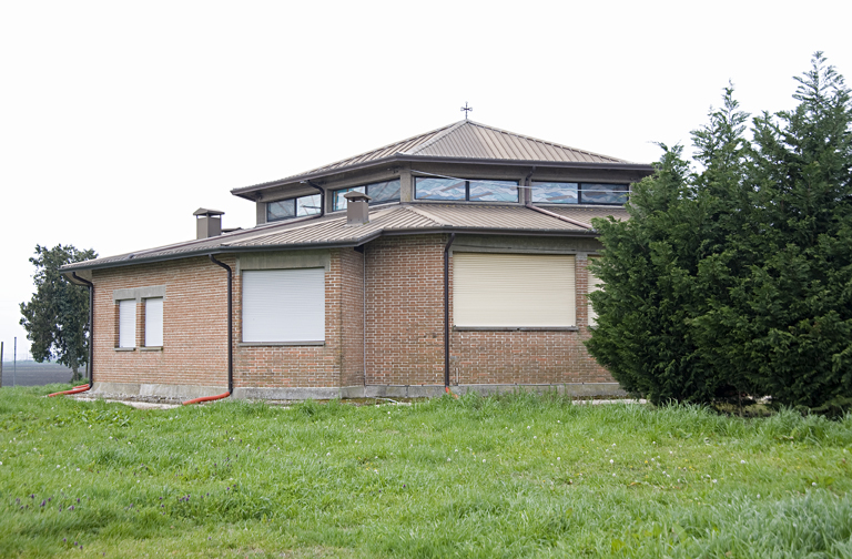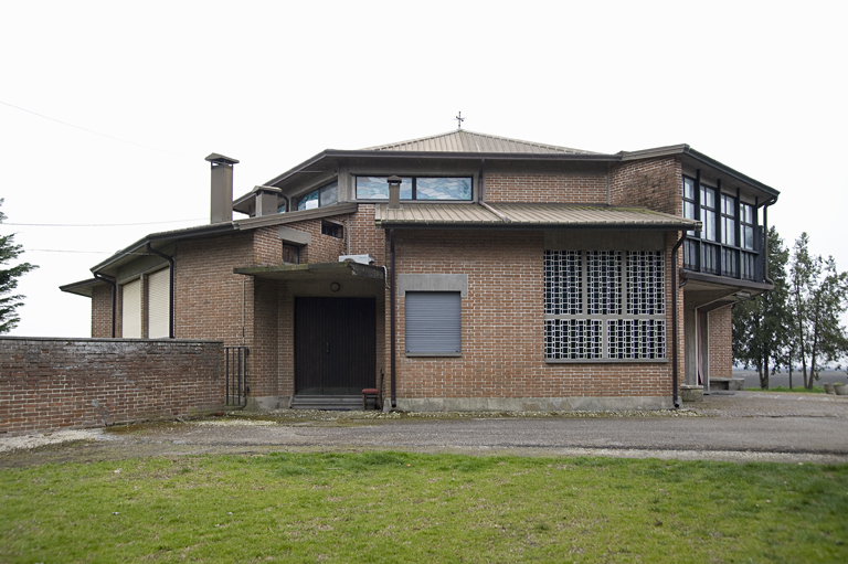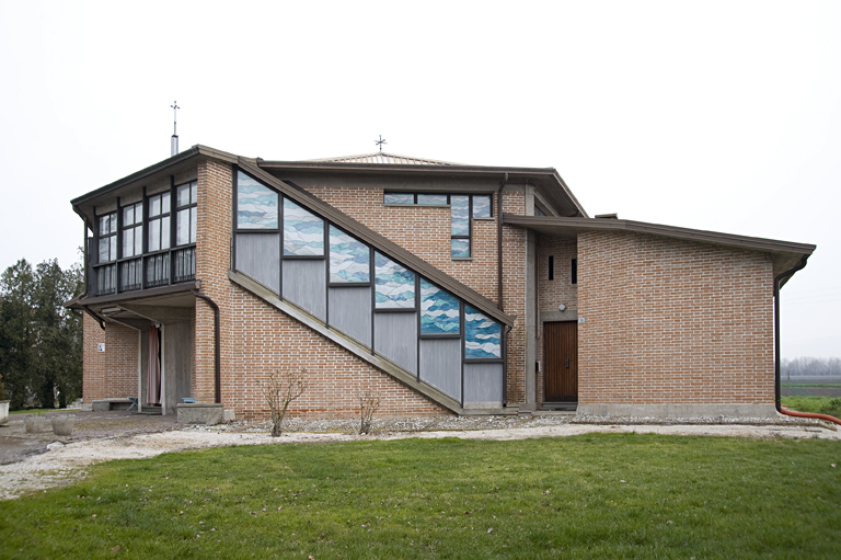 Il progetto non muta la consueta tipologia impiegata da Giordani; tutti gli edifici (in questo caso chiesa, canonica, ambulatorio, circolo di ritrovo e asilo) e il campo sportivo sono disposti intorno ad una piazza e i loro volumi appaiono in mattoni a vista. All’omogeneità dei materiali e contrapposto un andamento dei volumi che ricalca alcuni elementi formali dell’architettura rurale come accade nel centro di ritrovo realizzato analogamente ai tanti fienili della pianura ferrarese. Seguono lo stesso principio di dialogo con il contesto le gelosie in cotto che caratterizzano i prospetti di alcuni edifici. La chiesa coperta da un tetto piuttosto inclinato rivestito di Leoklinker marrone e crema, emerge come l’elemento maggiormente monumentale del complesso mantenendo tuttavia una dimensione abbastanza contenuta.