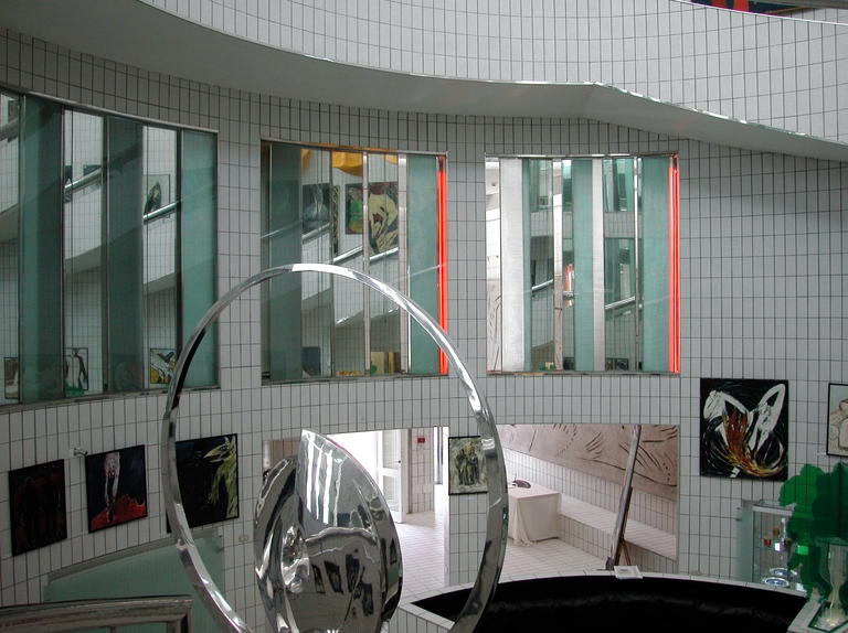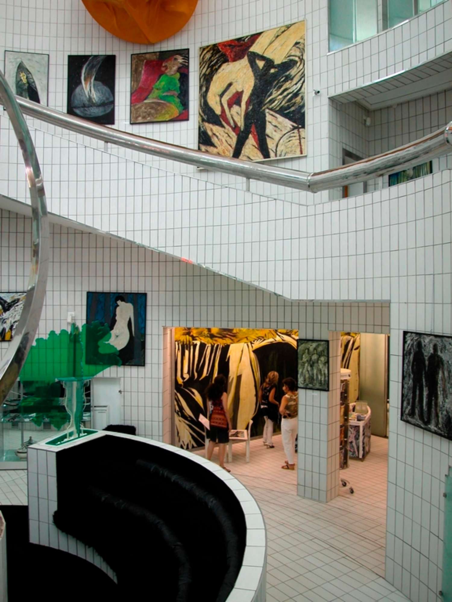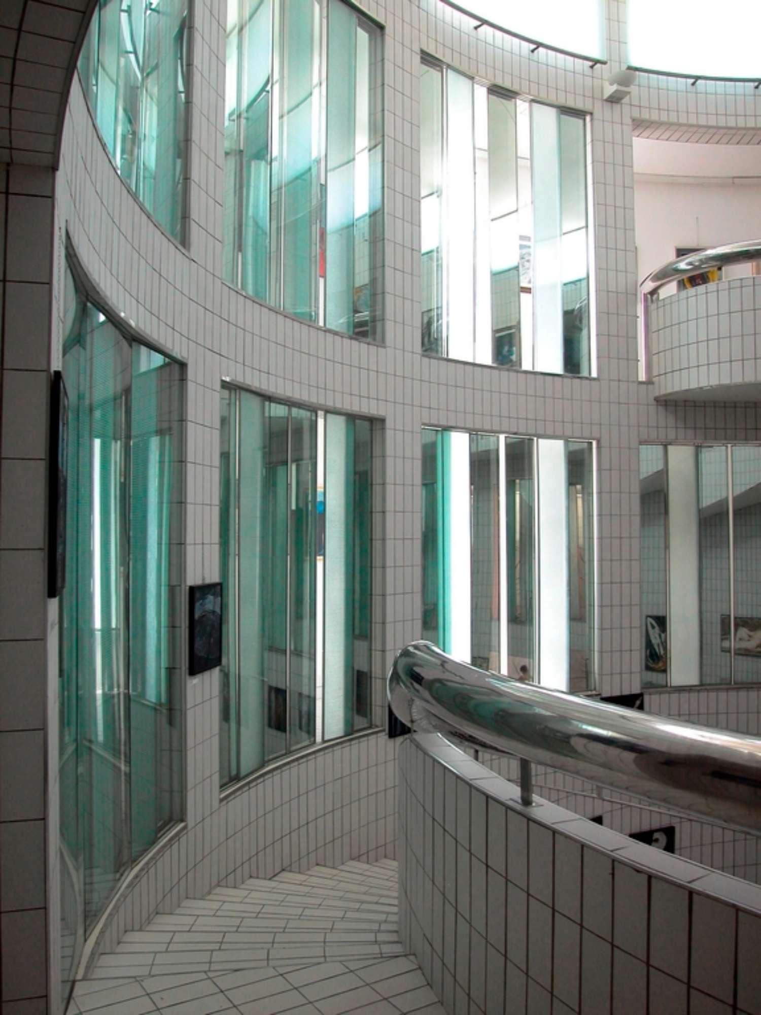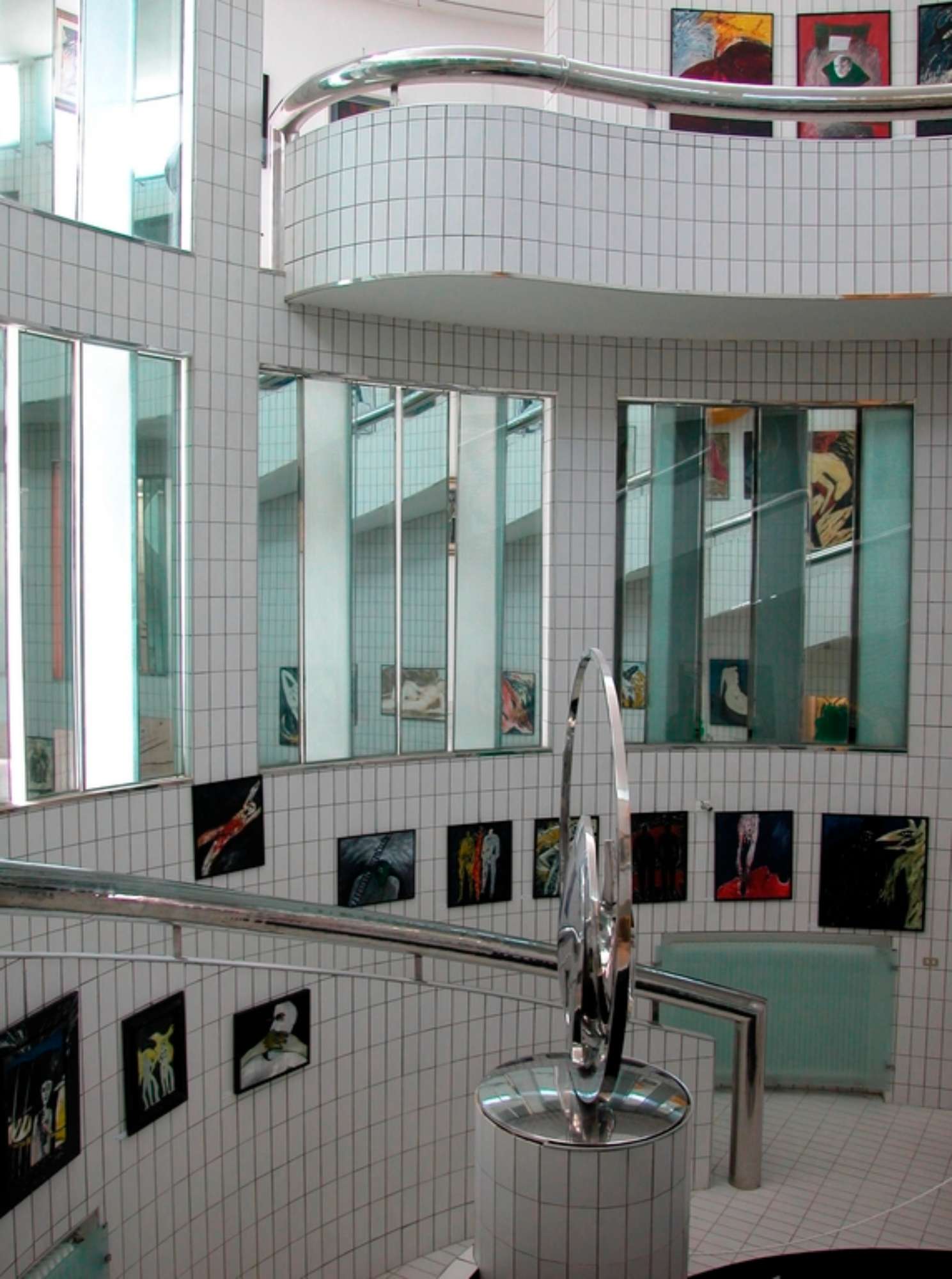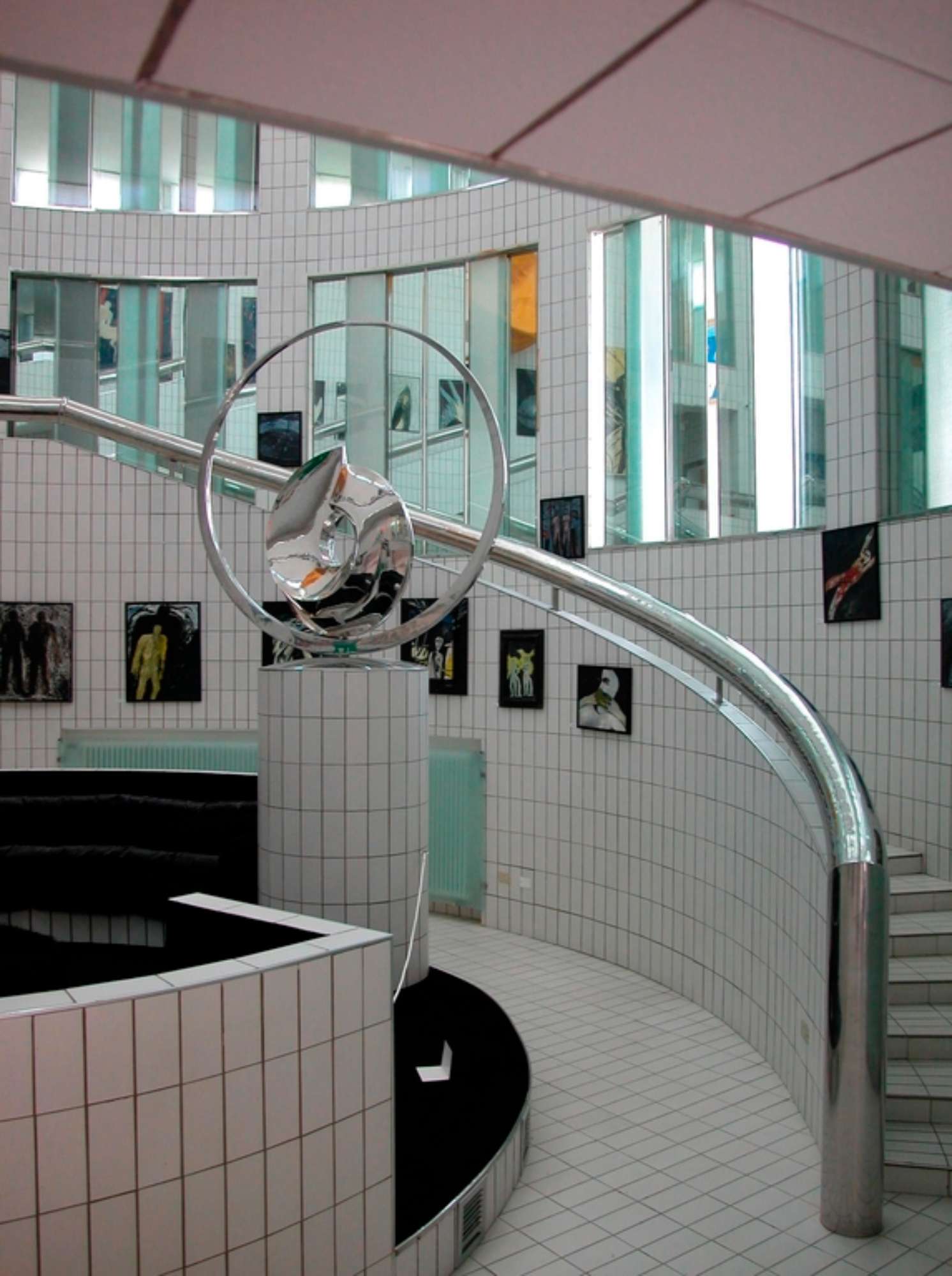 Nello spazio centrale, rivestito quasi interamente di piastrelle bianche e attraversato dal grosso corrimano cromato, la luce è diffusa da ampie vetrate in parte opaline e in parte mobili: la luce nella quale l’ambiente è immerso riverbera sui materiali lucidi che compongono l’architettura e le opere d’arte.