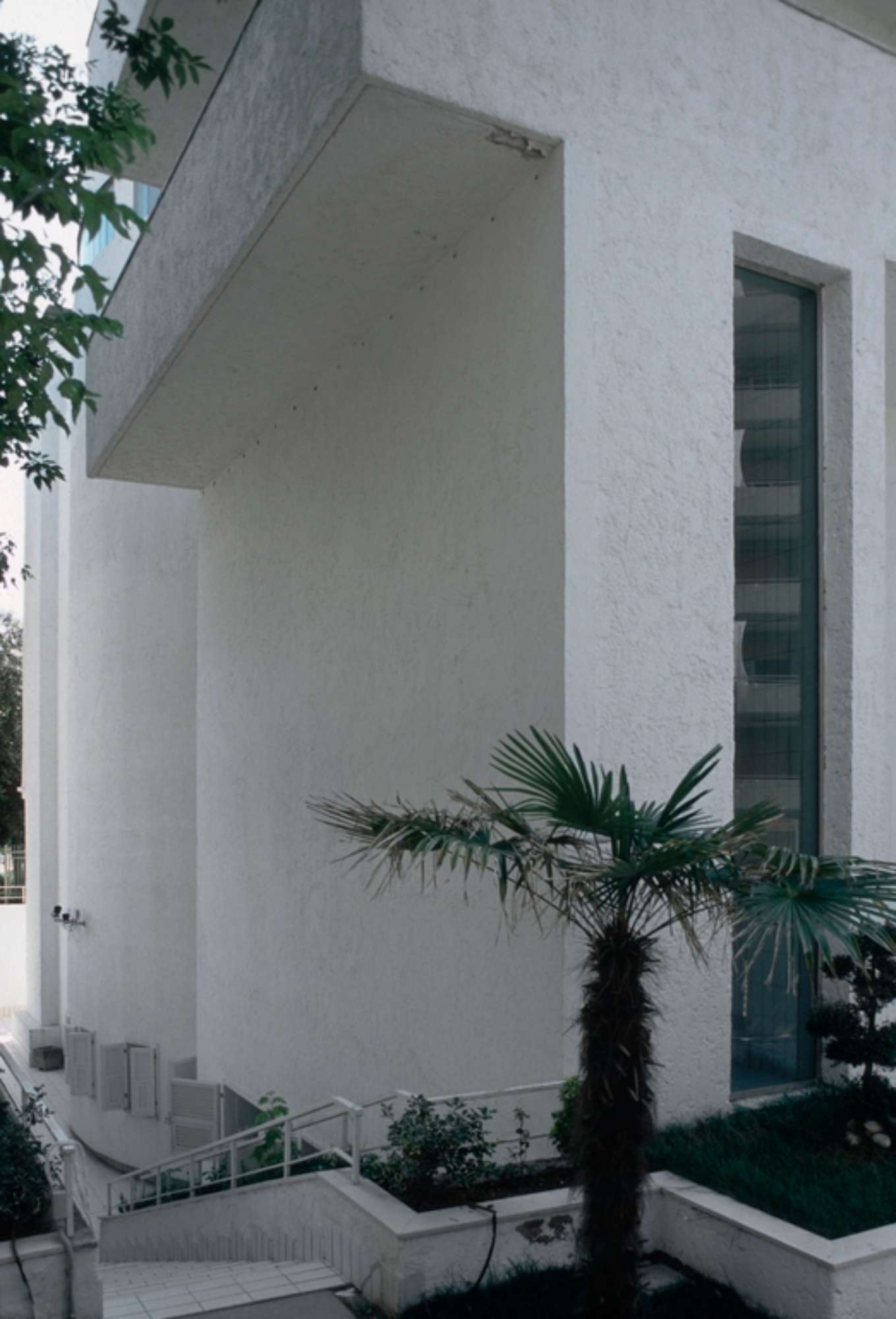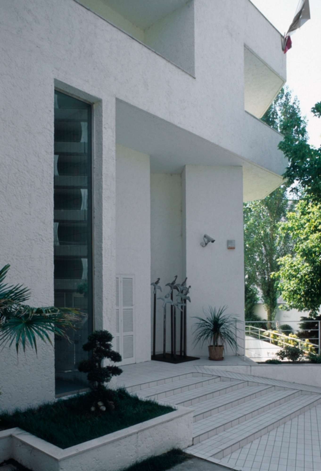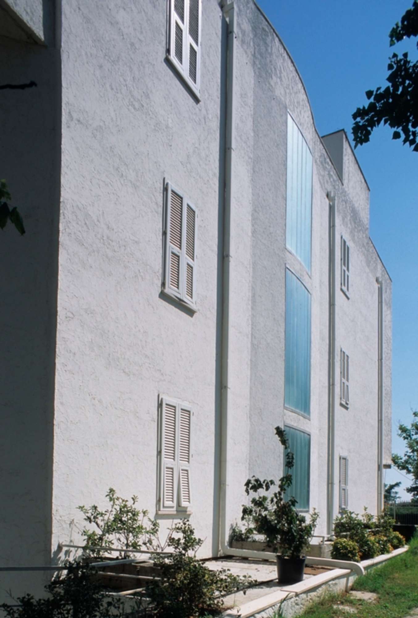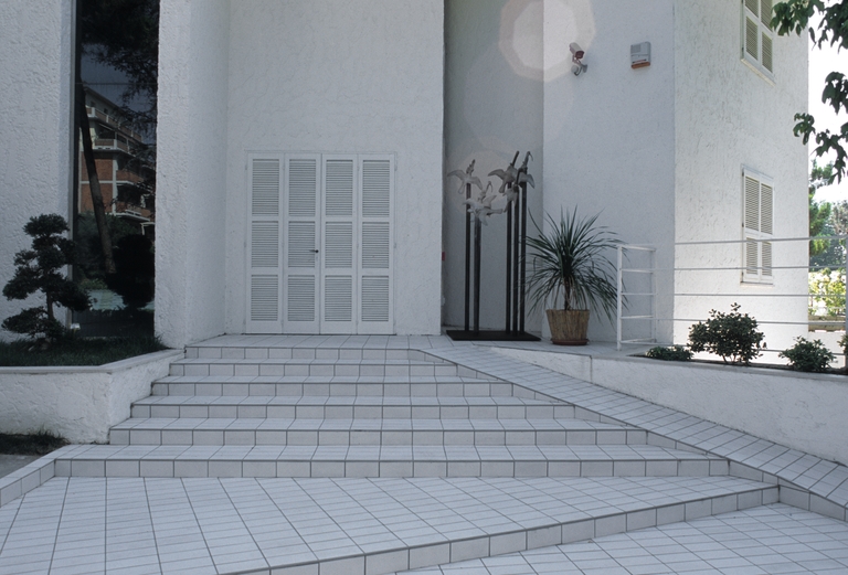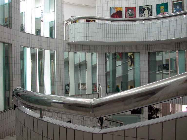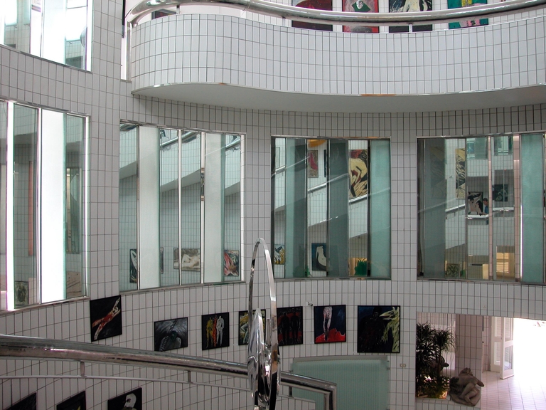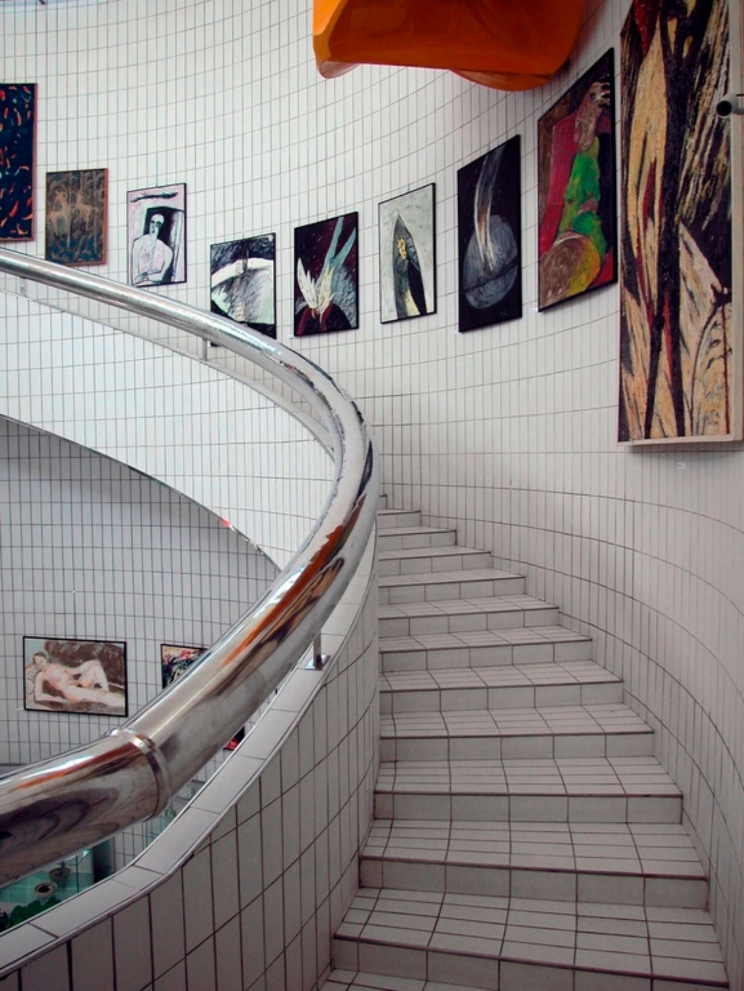 Nello spazio centrale, rivestito quasi interamente di piastrelle bianche e attraversato dal grosso corrimano cromato, la luce è diffusa da ampie vetrate in parte opaline e in parte mobili: la luce nella quale l’ambiente è immerso riverbera sui materiali lucidi che compongono l’architettura e le opere d’arte.