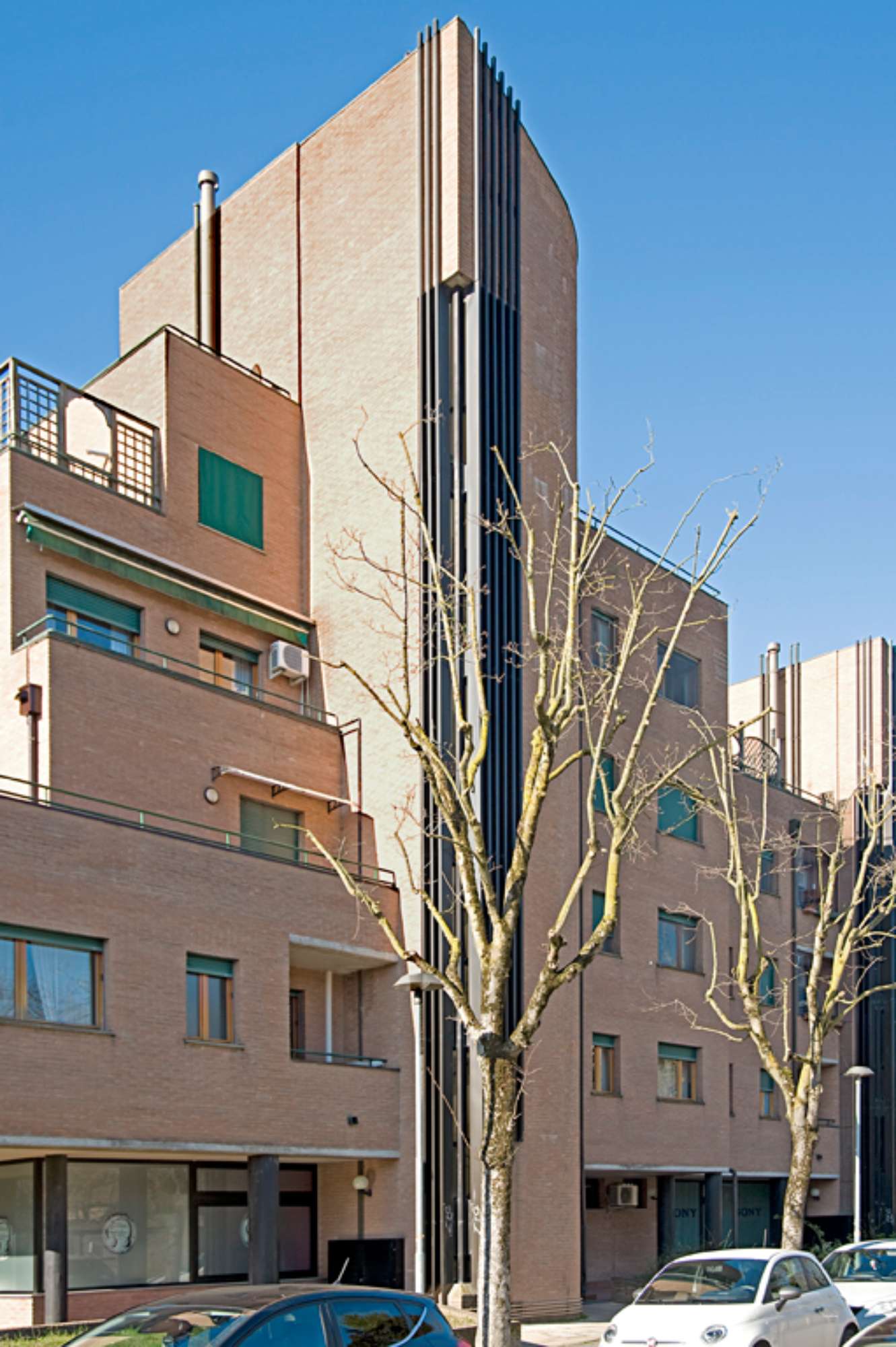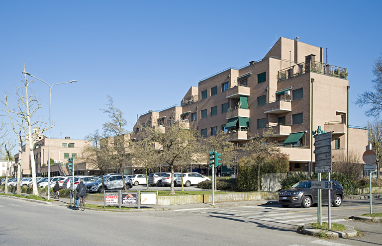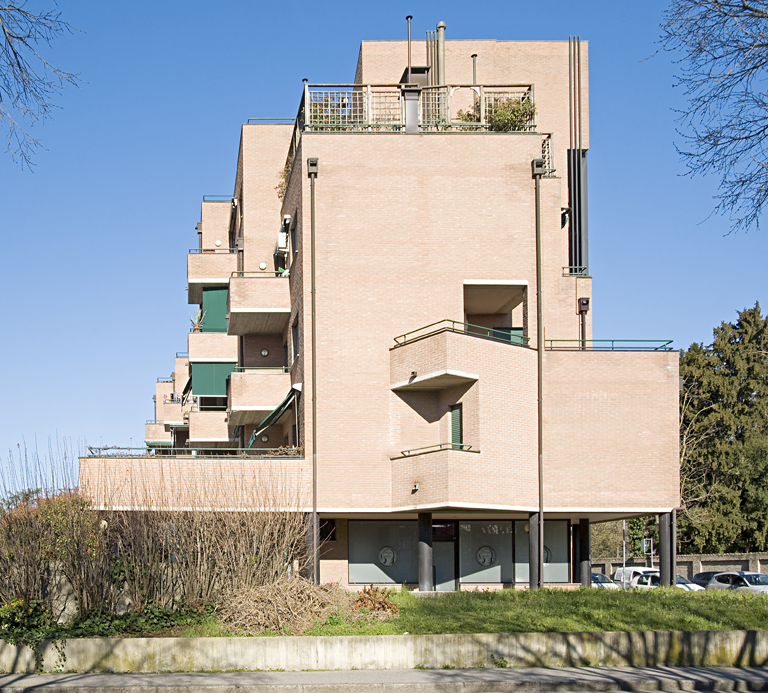 Composto da due edifici distinti secondo le funzioni – residenziali e terziarie – che trovano unione al piano terreno grazie ad un basamento porticato che al primo piano si trasforma in terrazza, i due edifici manifestano l’uso interno nell’impaginato delle facciate; mentre quello residenziale (alto tra i tre e i cinque piani) riprende un disegno del volume delle scale caratteristico di molte abitazioni pluripiano disegnate dall’autore, il volume destinato ad uffici impiega fasce orizzontali di aperture e balconi intervallati da risalti di laterizio verticali a profilo semicircolare che percorrono i quattro piani della facciata.
