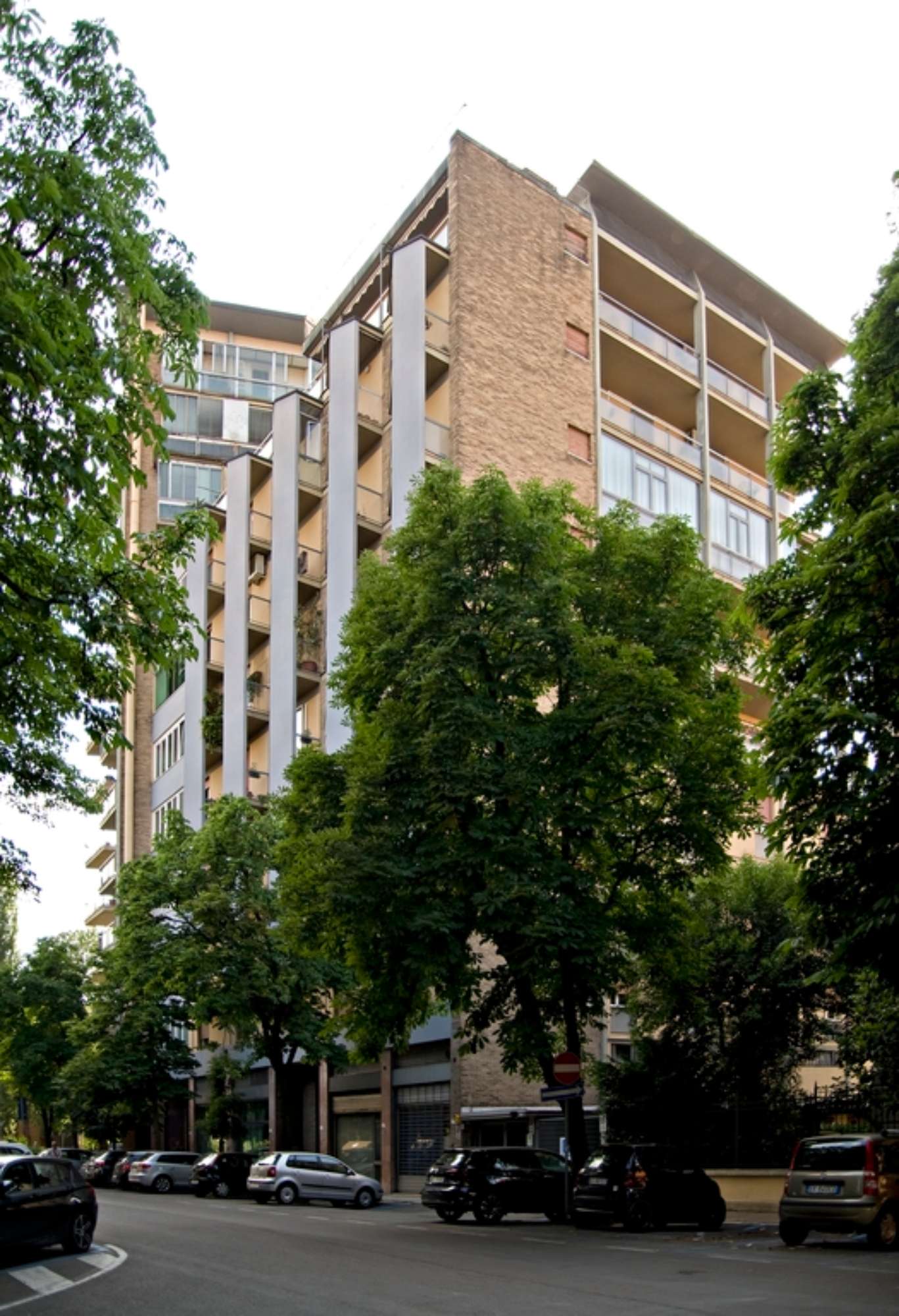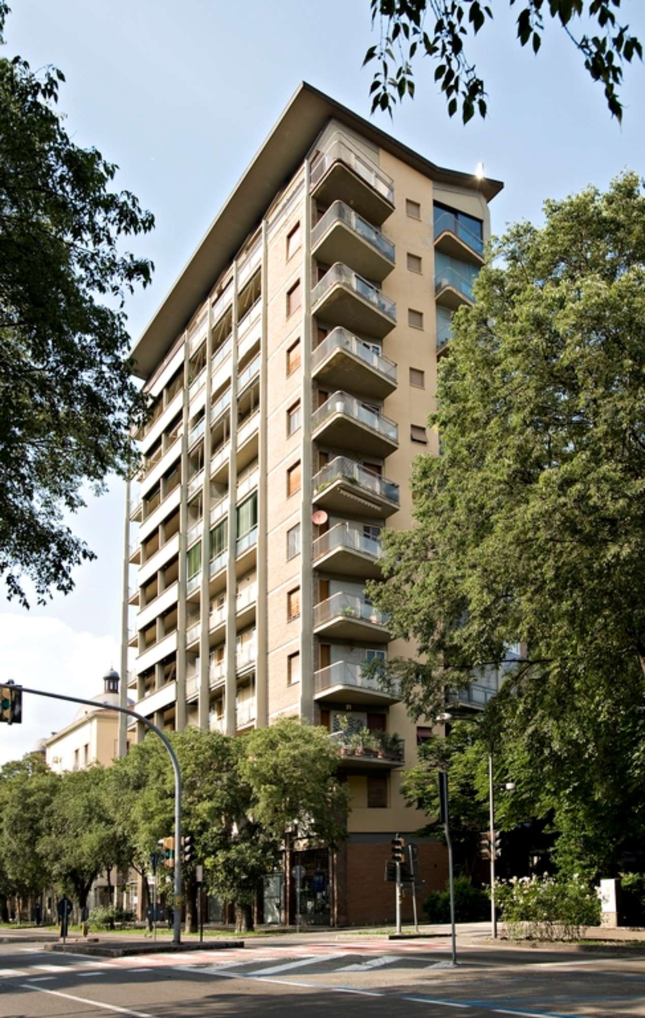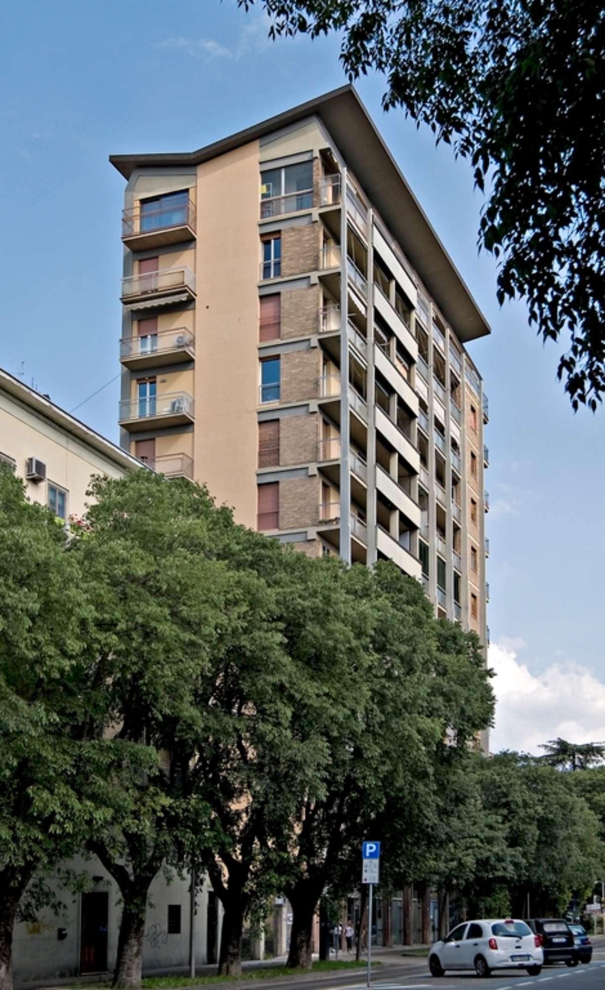 Con la torre ad appartamenti in viale Caduti in Guerra, Vinicio Vecchi prosegue una sperimentazione sul tema dell’edificio alto del tutto coerente con l’impostazione urbana codificata da Mario Pucci col piano regolatore del 1958. Oltre alla “città pubblica”, la cui caratterizzazione, attraverso una serie di infrastrutture strategicamente collocate, è affidata ad un linguaggio civile ben riconoscibile, è il tema del “grattacielo” ad acquisire un ruolo centrale nella costruzione di un ambiente urbano moderno e all’avanguardia. Sorgono così una serie di torri o complessi ad appartamenti disposti a corona attorno al centro storico, sulla circonvallazione dei viali su cui sono ancora presenti lotti disponibili o su cui, più frequentemente, vengono effettuate delle puntuali operazioni di sostituzione. Oltre al celebre edificio ad appartamenti ed uffici “Ponte della Pradella”, la torre di Viale Caduti in Guerra rappresenta un esempio evidente di raggiunta maturità, in cui il virtuosismo strutturale si combina magistralmente con raffinati giochi compositivi e linguistici. L’edificio si colloca su un lotto il cui affaccio sul viale ha un estensione piuttosto ridotta: l’ingresso è infatti collocato su via Muzzioli, nel corpo di minor altezza trattato come un volume indipendente. Il prospetto principale svetta al contrario sul tessuto circostante, caratterizzato da un edilizia a bassa densità ma soggetto nel dopoguerra a fenomeni di sostituzione e superfetazione. La fitta trama delle nervature verticali caratterizza il prospetto, inquadrando una serie di ampie logge affacciate verso i Giardini Pubblici. Esili solette dall’andamento trapezoidale costituiscono i balconi d’angolo, mentre le logge sul corpo basso, a conferma dell’assunzione di una visuale privilegiata verso il centro storico e i giardini pubblici, sono inclinate di trenta gradi e inserite anch’esse in un reticolo di elementi strutturali in calcestruzzo. Qui, ancor più che in altri edifici, è evidente il rimando di Vecchi ad alcuni stilemi dell’edilizia del dopoguerra, come il celebre Palazzo Ina di Franco Albini a Parma. Ma sono evidenti anche altre citazioni di professionisti affermati di questi anni, come sicuramente Ignazio Gardella. Il maggior elemento di caratterizzazione formale resta tuttavia il coronamento: all’ultimo piano le nervature si ritraggono e una sottile copertura a falde rovesciate sembra galleggiare sulla sommità, in evidente analogia con la casa Incis di via Dogali (1951-52), costruita durante la collaborazione con Pucci.