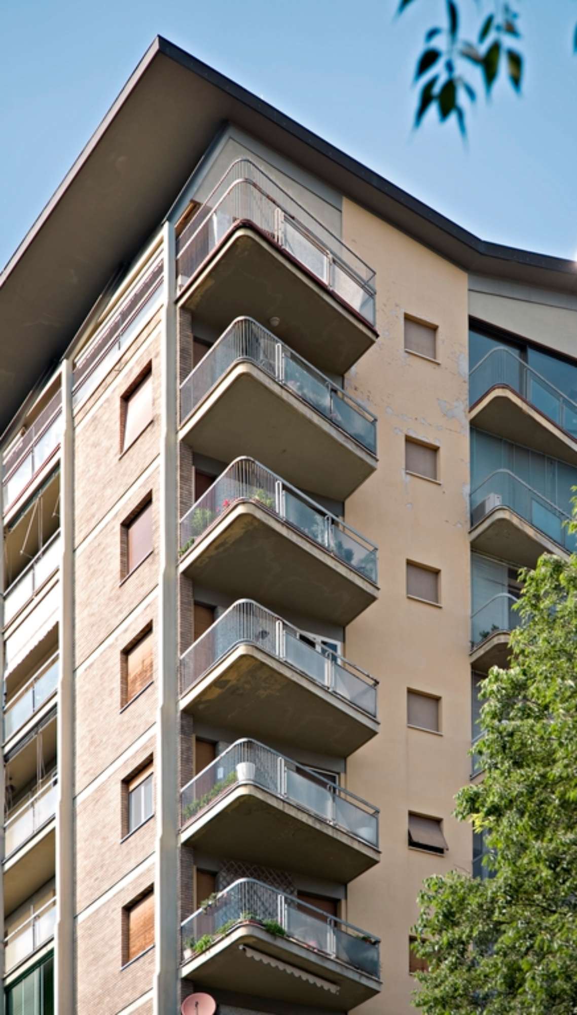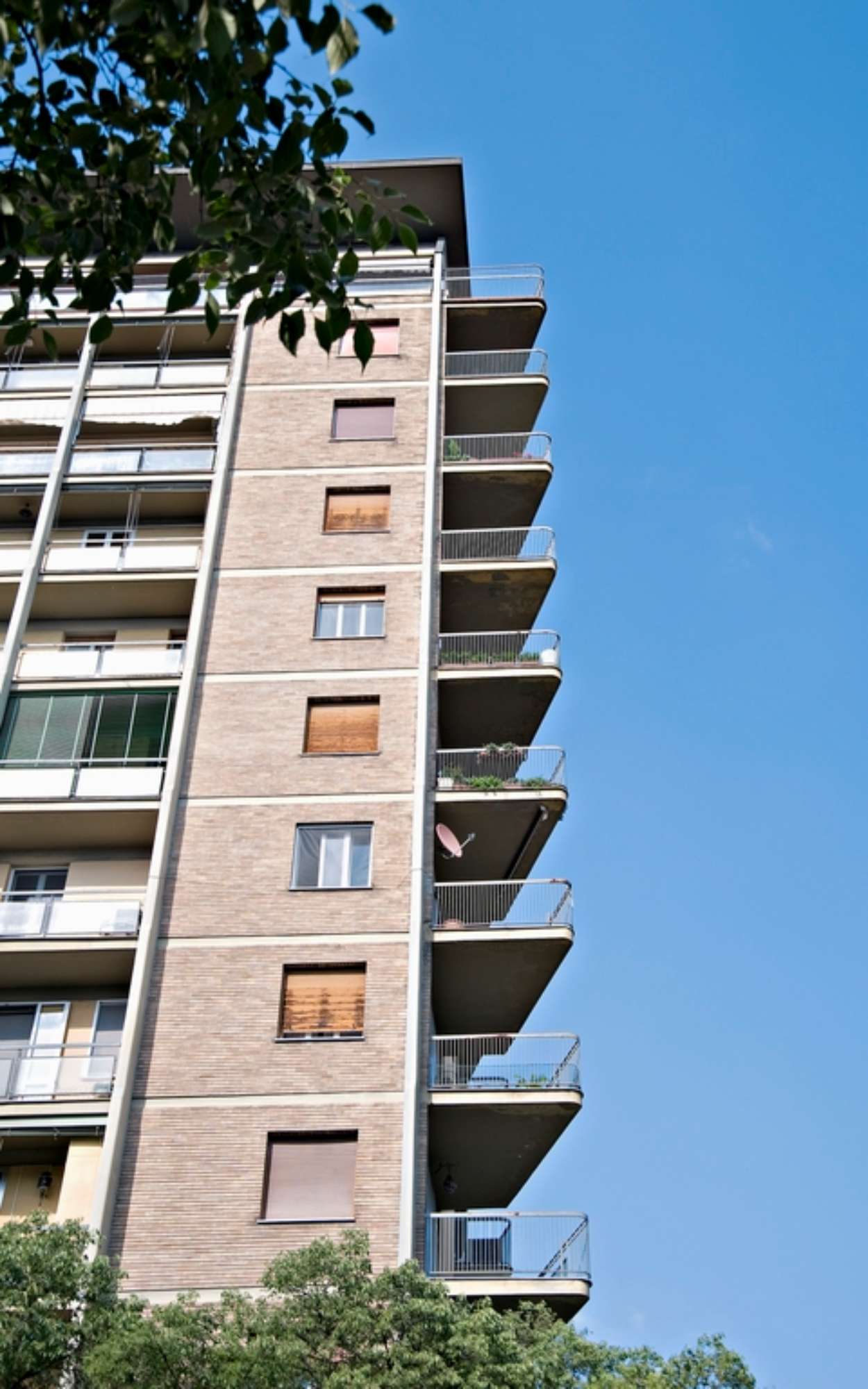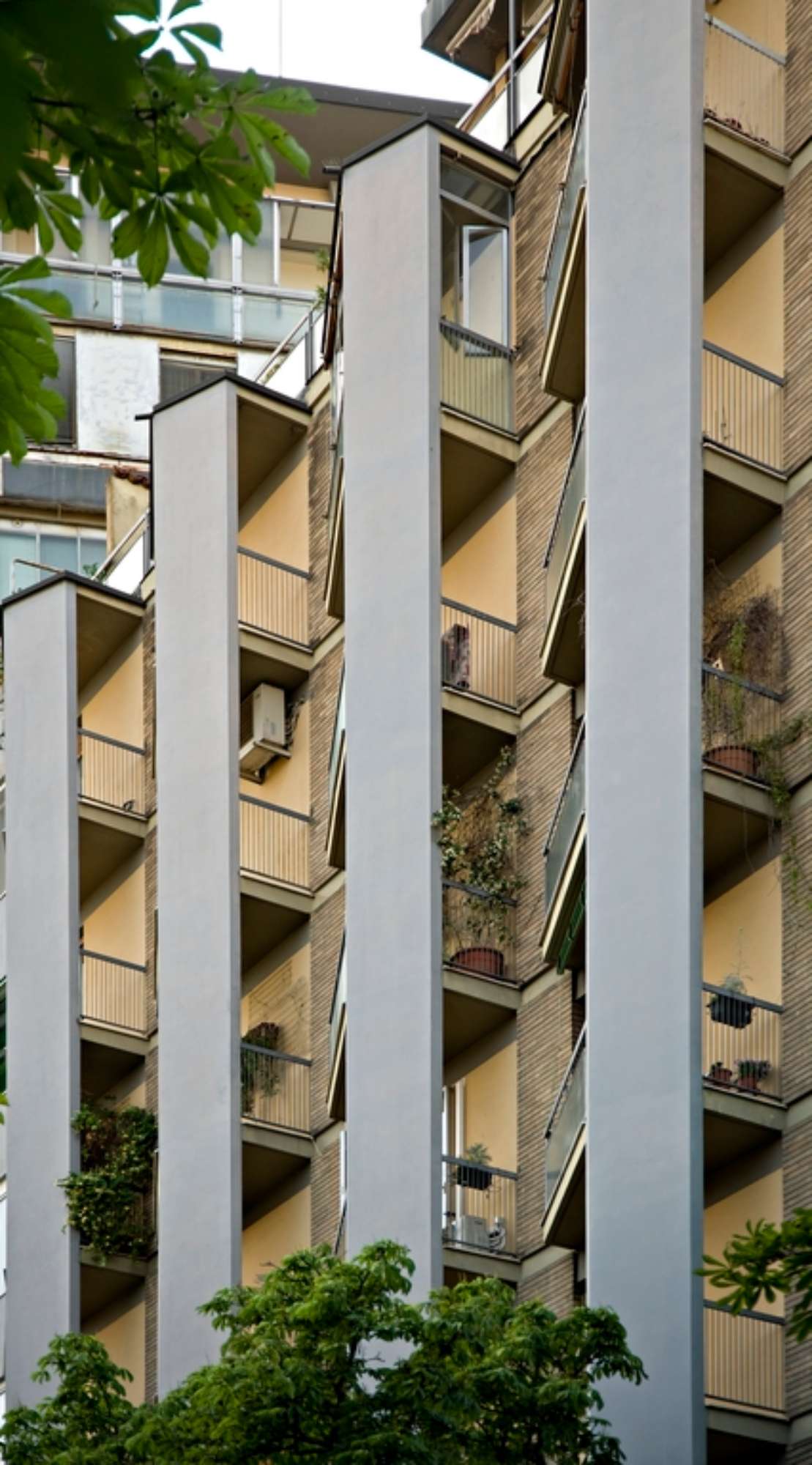 Con la torre ad appartamenti in viale Caduti in Guerra, Vinicio Vecchi prosegue una sperimentazione sul tema dell’edificio alto del tutto coerente con l’impostazione urbana codificata da Mario Pucci col piano regolatore del 1958. Oltre alla “città pubblica”, la cui caratterizzazione, attraverso una serie di infrastrutture strategicamente collocate, è affidata ad un linguaggio civile ben riconoscibile, è il tema del “grattacielo” ad acquisire un ruolo centrale nella costruzione di un ambiente urbano moderno e all’avanguardia. Sorgono così una serie di torri o complessi ad appartamenti disposti a corona attorno al centro storico, sulla circonvallazione dei viali su cui sono ancora presenti lotti disponibili o su cui, più frequentemente, vengono effettuate delle puntuali operazioni di sostituzione. Oltre al celebre edificio ad appartamenti ed uffici “Ponte della Pradella”, la torre di Viale Caduti in Guerra rappresenta un esempio evidente di raggiunta maturità, in cui il virtuosismo strutturale si combina magistralmente con raffinati giochi compositivi e linguistici. L’edificio si colloca su un lotto il cui affaccio sul viale ha un estensione piuttosto ridotta: l’ingresso è infatti collocato su via Muzzioli, nel corpo di minor altezza trattato come un volume indipendente. Il prospetto principale svetta al contrario sul tessuto circostante, caratterizzato da un edilizia a bassa densità ma soggetto nel dopoguerra a fenomeni di sostituzione e superfetazione. La fitta trama delle nervature verticali caratterizza il prospetto, inquadrando una serie di ampie logge affacciate verso i Giardini Pubblici. Esili solette dall’andamento trapezoidale costituiscono i balconi d’angolo, mentre le logge sul corpo basso, a conferma dell’assunzione di una visuale privilegiata verso il centro storico e i giardini pubblici, sono inclinate di trenta gradi e inserite anch’esse in un reticolo di elementi strutturali in calcestruzzo. Qui, ancor più che in altri edifici, è evidente il rimando di Vecchi ad alcuni stilemi dell’edilizia del dopoguerra, come il celebre Palazzo Ina di Franco Albini a Parma. Ma sono evidenti anche altre citazioni di professionisti affermati di questi anni, come sicuramente Ignazio Gardella. Il maggior elemento di caratterizzazione formale resta tuttavia il coronamento: all’ultimo piano le nervature si ritraggono e una sottile copertura a falde rovesciate sembra galleggiare sulla sommità, in evidente analogia con la casa Incis di via Dogali (1951-52), costruita durante la collaborazione con Pucci.