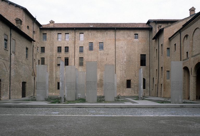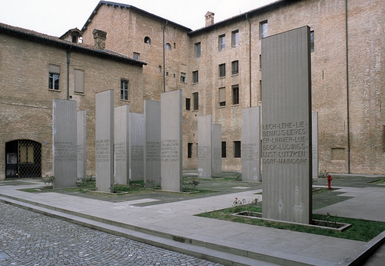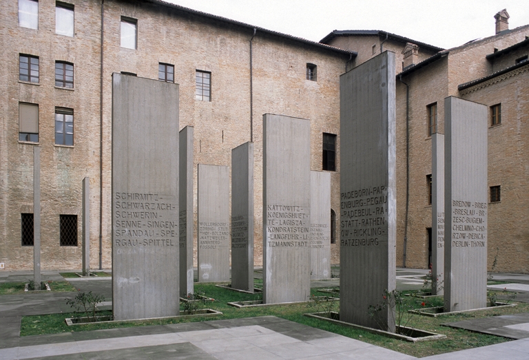 L’intensità di questi ambienti trova un momento di decantazione, senza tuttavia perdere la carica comunicativa, nel cortile all’aperto, dominato da sedici stele di cemento alte sei metri ciascuna, emergenti da fosse scavate nel terreno piantumato a roseto, recanti i nomi dei luoghi dello sterminio incise.