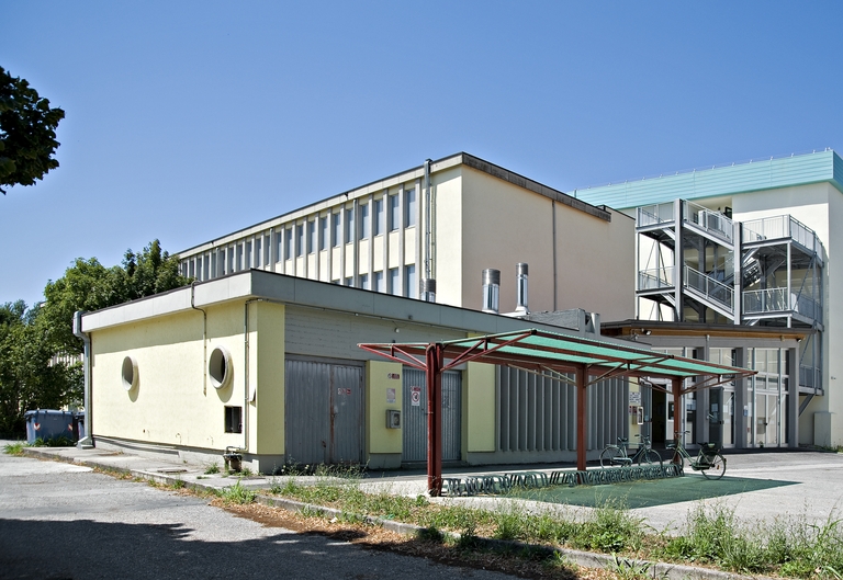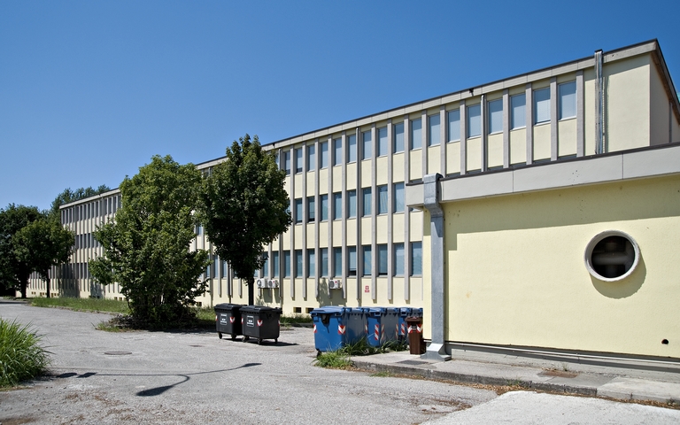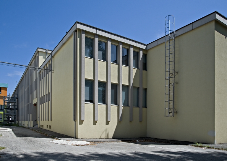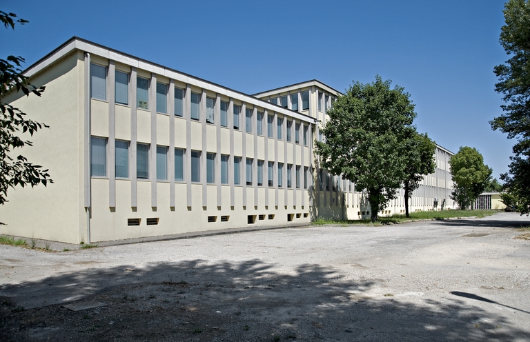 In particolare, gli edifici sul fronte nord condensano alcuni tratti distintivi dell’architettura di Vecchi per scelte costruttive e formali, materiali, dettagli e cromie: le falde invertite, il porticato con pilotis, la “cornice” di cemento che racchiude la facciata scandita da lame verticali in cemento, intonaci dai colori vivaci, rivestimenti in lastre di pietra – anche negli interni, tesserine di mosaico greificato. Un pannello scultoreo di Luciano Ceschia, artista udinese che interviene anche all’Istituto Corni di Modena (1952), impreziosisce l’edificio basso destinato alle attività collettive, mentre il profilo modellato della copertura richiama la casa-officina Della Casa (1954).