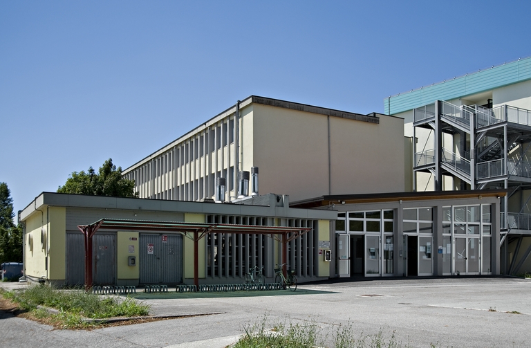 Il complesso, articolato in una serie di corpi diversi per volumetrie e soluzioni formali, si sviluppava in profondità sull’intera area, con accesso principale dal basamento gradonato su via del Mazzone fino alla parallela via Barozzi. Un percorso coperto (demolito post sisma) conduceva alla palestra: un edificio quadrato (ad oggi agibile), con una singolare orditura di capriate in ferro che ne movimenta la copertura e permette di creare grandi aperture vetrate in facciata.