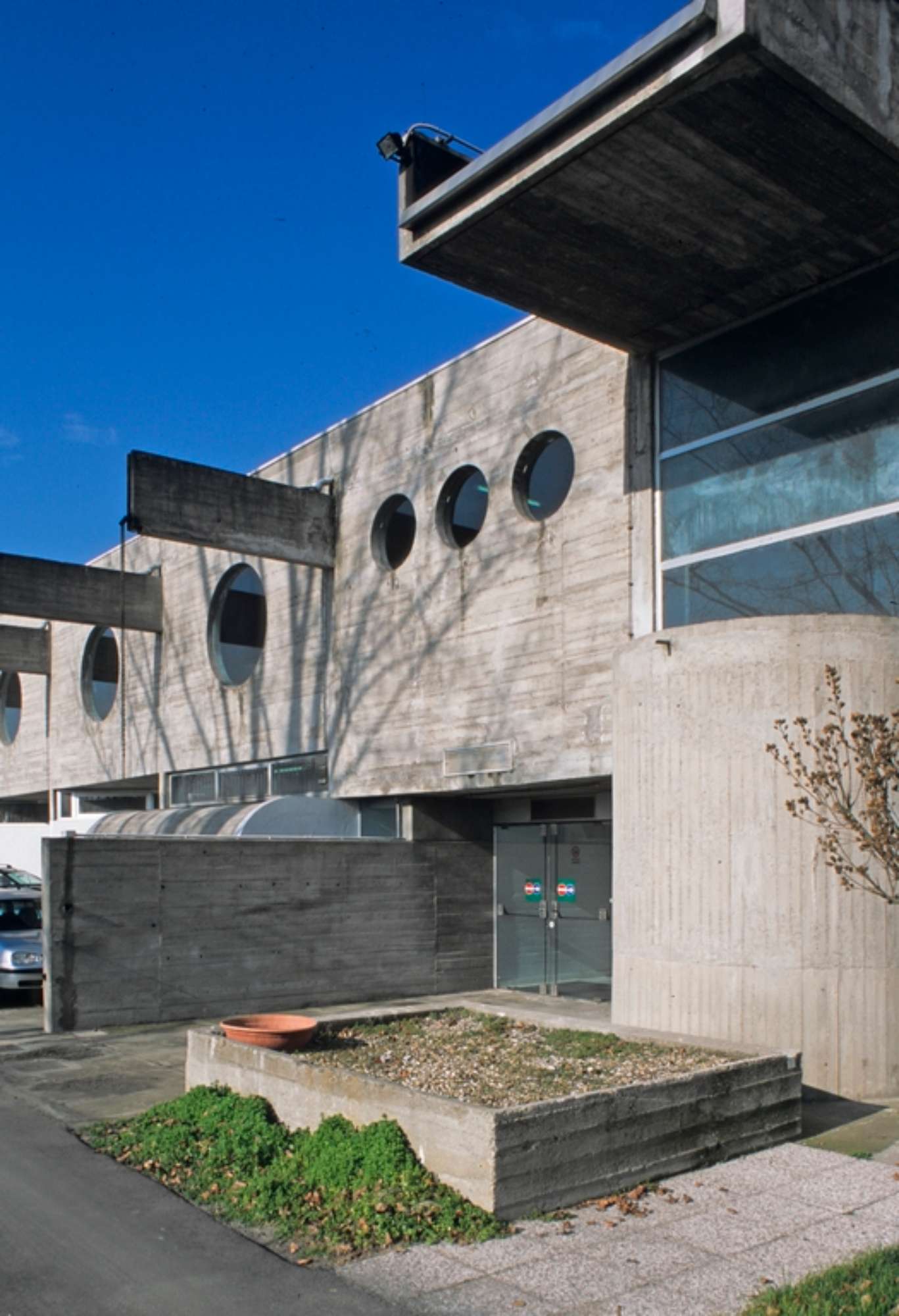 L’amministrazione individua un’area periferica a sud-ovest del centro abitato in cui realizzare alcuni impianti sportivi dei quali verrà poi costruito solo il centro natatorio. Pur utilizzando come unico materiale il cemento armato a vista, il volume delle piscine coperte è un’architettura aperta, trasparente, dove lo spazio interno è in continuità visiva con le vasche all’aperto e con il paesaggio della pianura circostante attraverso ampie pareti finestrate, ulteriormente alleggerito dai grandi oblò vetrati al livello superiore. Qui trovano sede le parti serventi quali spogliatoi, i servizi e le tribune ai quali si accede tramite due gruppi di scale simmetrici sulla testata ovest.
