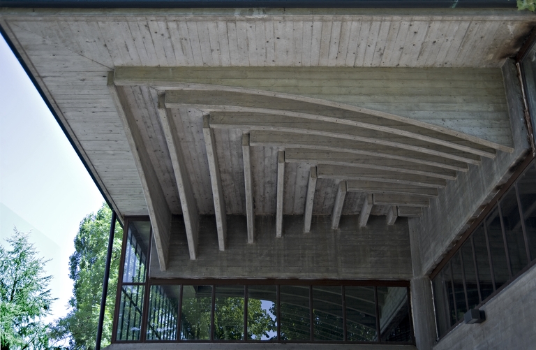 La copertura, tutta realizzata in opera, è sostenuta da quattro pilastri circolari di 65 cm di diametro che sostengono un’orditura di travi ortogonali in cemento armato, tamponata con mensole nervate anch’esse in cemento, leggermente curvilinee all’intradosso e completate all’estradosso di un getto di 12 cm.