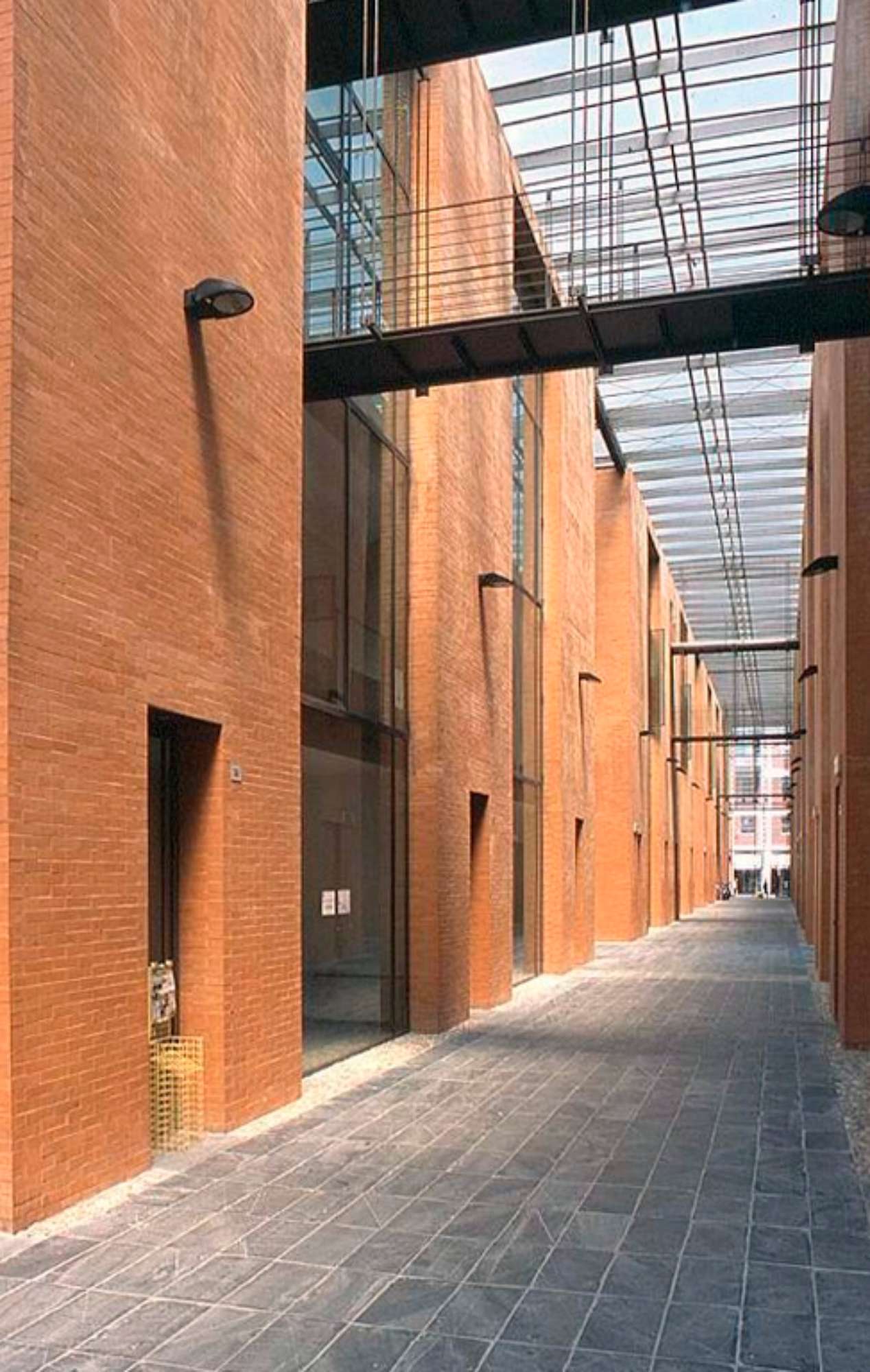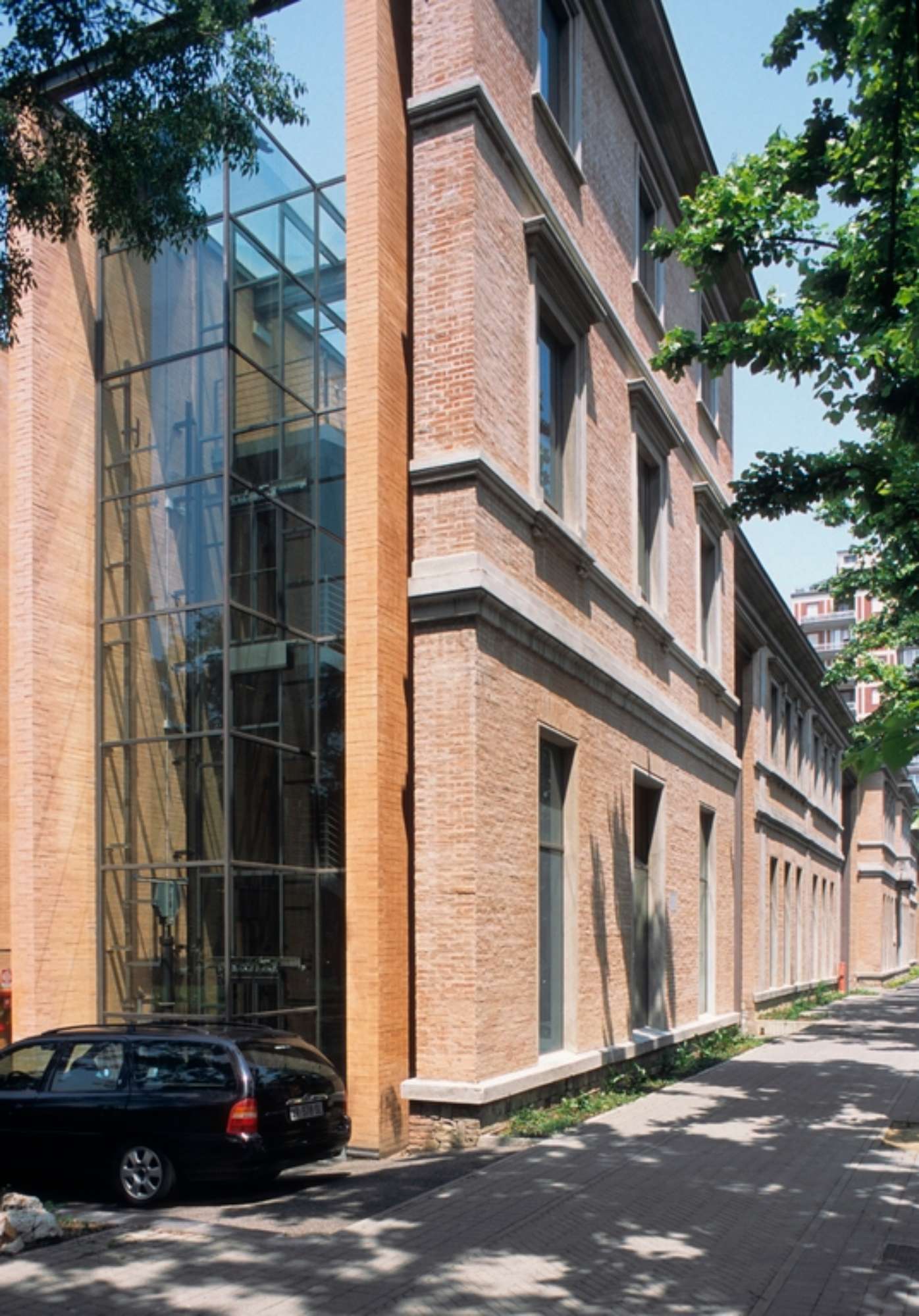 L’aggancio tra il nuovo edificio e il muro superstite sembra voler accentuare la discontinuità tra le due fasi costruttive, e con essa la sostanziale bidimensionalità della facciata, intesa quasi come quinta scenografica. A ricomporre questa dicotomia interviene in prima analisi il trattamento delle superfici esterne del complesso, realizzate con ampi setti rivestiti in laterizio a vista (alla pari della preesistenza) intercalati da vetrate a tutta altezza intelaiate in acciaio. Lo stesso dialogo tra materiali differenti è riprodotto in facciata, dove quattro portali in vetro trasparente sono ritagliati nella serrata sequenza di ampie finestre su due livelli; di questi portali, i due più centrali hanno si sostituiscono all’ accesso sul lato Est, mentre il vecchio ingresso è oggi chiuso da una vetrata che lascia trasparire l’articolazione del corpo scala collocato all’interno.