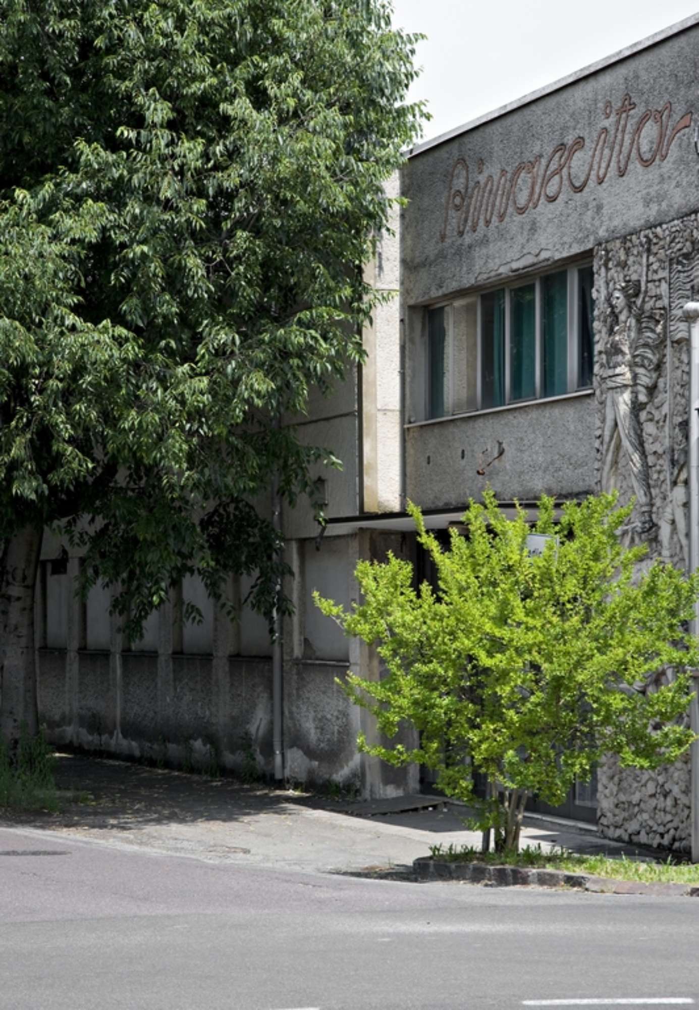 Il punto di raccordo tra le due parti è costituito dalla porzione del prospetto principale destinato all’ingresso, posto lateralmente, interamente dominato dalle grandi aperture vetrate sui entrambi i piani che culminano con la grande scritta “Rinascita” e dal grande bassorilievo realizzato dallo scultore Valdo Vecchi, già autore di numerosi interventi negli edifici del fratello Vinicio.