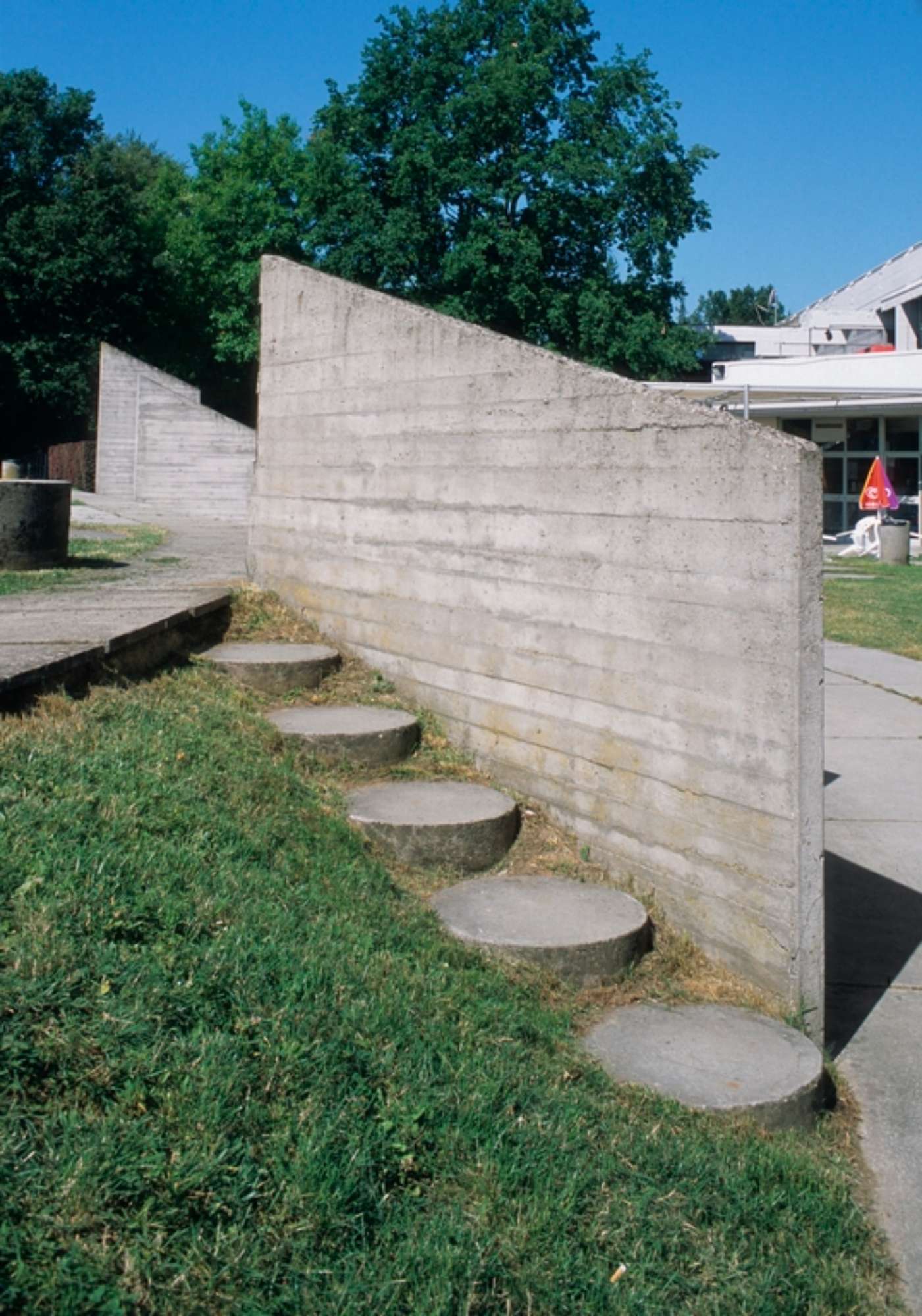 L’edificio è collocato nel settore est del paese, meno edificato, circondato da aree verdi e terreni agricoli. Da una veduta aerea appare quasi un oggetto ‘alieno’ rispetto all’intorno per scala e forma: un grande cerchio in copertura metallica che si apre a ventaglio per condurre al patio centrale circolare. Questa soluzione permette di ricavare due accessi indipendenti per la materna e il nido. Lo spazio interno si organizza secondo anelli concentrici: esternamente, alle due estremità si collocano le aule della materna (comunicanti) e gli spazi per le attività del nido, mentre la parte centrale, rientrante, ospita atelier, cucine, dispensa e lavanderia; l’anello interno è concepito come uno spazio ibrido di circolazione, destinato ad attività collettive e pranzo, che media il passaggio tra le aule e il patio interno. L’andamento scalettato dei solai in sezione permette di creare lunghe strisce finestrate a garantire l’illuminazione naturale degli spazi.