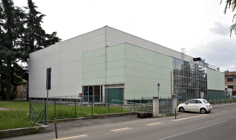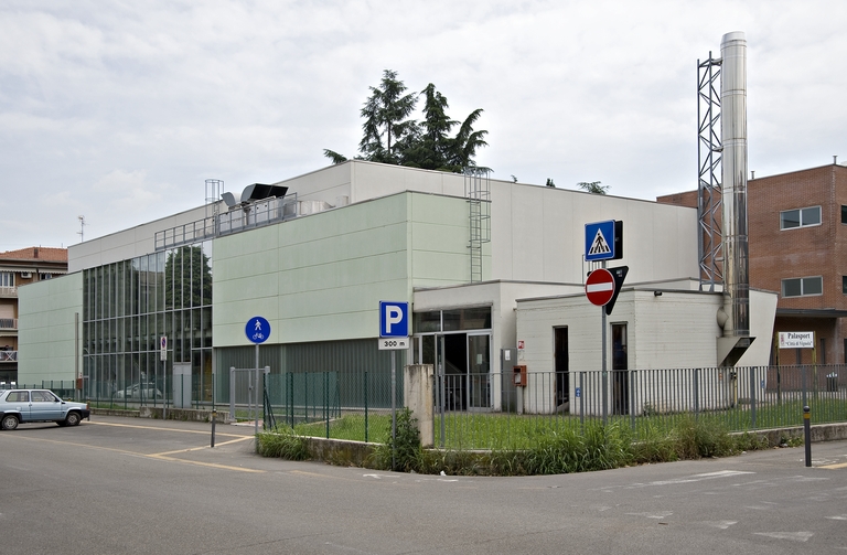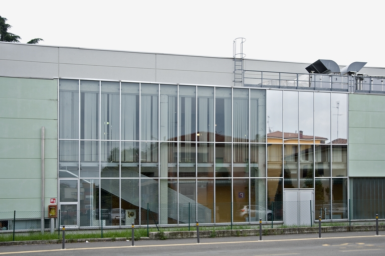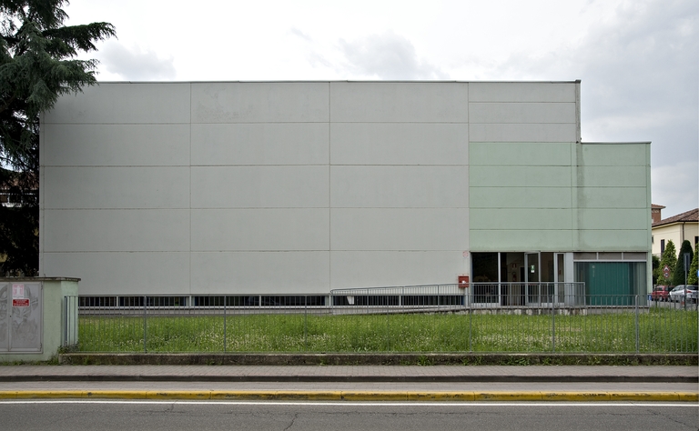 La palestra esistente non viene demolita ma diventa aula magna e mensa. Il Palasport si sviluppa nel lotto libero adiacente, completando la testata dell’isolato. La struttura è realizzata tramite un sistema prefabbricato di pilastri in cemento precompresso, travi gettate in opera, tegoli TT in copertura e pannelli prefabbricati in cemento come rivestimento esterno.