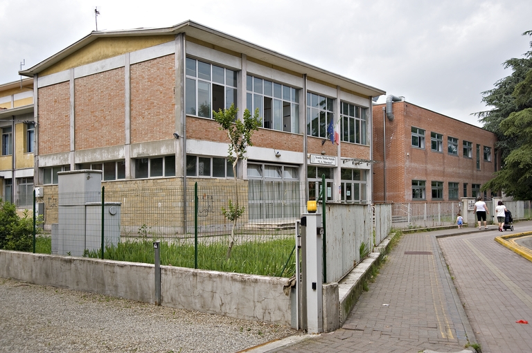 Il progetto nasce dalla richiesta di dotare la scuola – un edificio degli anni ’60 in cemento armato e muratura – di alcune nuove aule, laboratori e di una nuova palestra che diventi anche il Palasport cittadino. I nuovi blocchi si accostano alla struttura mantenendo una distanza di rispetto da essa, un gesto che distingue il ‘nuovo’ dalla preesistenza e crea un’intercapedine funzionale all’inserimento di rampe, uscite di sicurezza e impianti di ventilazione. Il blocco accanto all’entrata (sei laboratori su due livelli) e quello a sud (spogliatoi a piano terra, aule e servizi al primo) recuperano l’uso della muratura a faccia vista privilegiando un impaginato più libero con bucature puntuali.