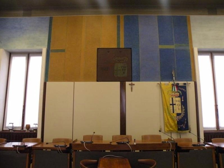 Profondamente danneggiata dai bombardamenti alleati, la sede della Provincia di Parma viene completamente ricostruita nel dopoguerra ad opera dell’architetto Carlo Scarpa, chiamato espressamente dal pittore Armando Pizzinato che, nel 1953, vince il concorso per la realizzazione degli affreschi nella Sala consiliare.