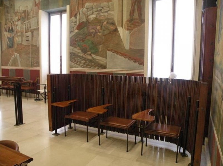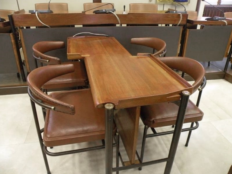 Al lato opposto della sala si trovano i banchi per la presidenza; questi ultimi danno le spalle al pannello con lo stemma bronzeo fronteggiando, invece, le postazioni consiliari. Esse sono disposte a lisca di pesce, in modo da ricavare lo spazio necessario per consentire la visione dell’intera sala da ogni posto, al pari di una disposizione classica a semicerchio, rispetto alla quale presenta, però, il vantaggio di occupare uno spazio minore. I banchi sono sorretti dalla medesima struttura a tubolari metallici che caratterizza tutto l’arredo della sala, in particolare delle sedute della segreteria e del pubblico, che presentano una struttura con elementi tubolari metallici, con base rettangolare e schienale semicircolare. Lo scheletro metallico sostiene i rivestimenti in pelle che completano le poltrone, lasciando a vista la struttura retrostante. L’altezza delle sedute è poi studiata per permettere di riporre le poltrone perfettamente in adiacenza al banco, in modo da consentire un passaggio più agevole tra le file di banchi.