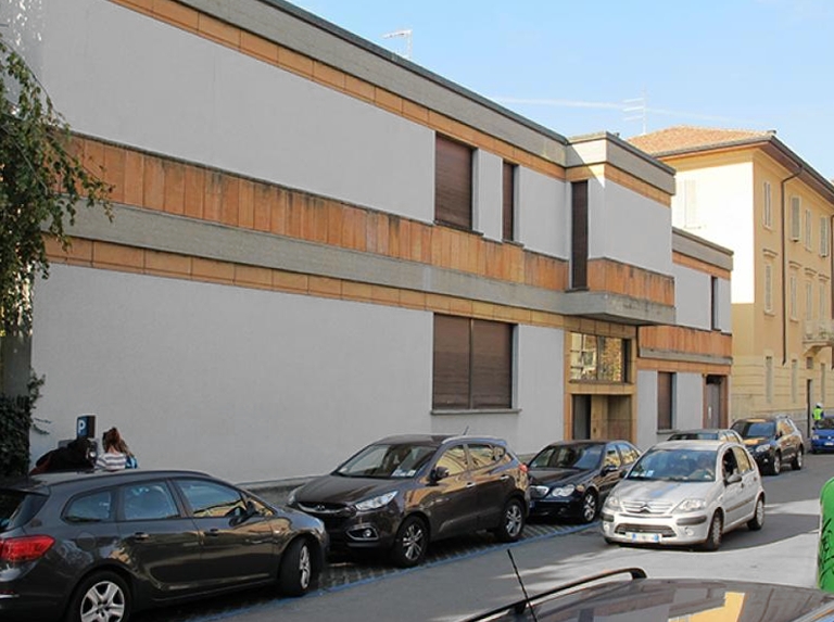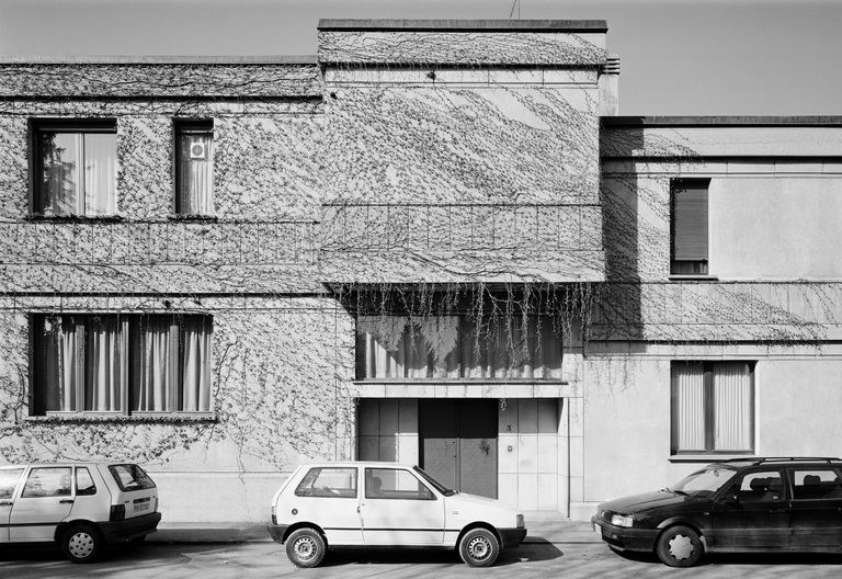 Come in numerosi progetti di Albini, dalle Terme di Salsomaggiore, all’edificio di via Solferino, per restare nell’ambito parmense, il comporre per trabeazioni sovrapposte, quasi un ricordo degli ordini architettonici, diventa l’occasione per concludere il motivo lineare che governa tutto lo sviluppo formale della casa.