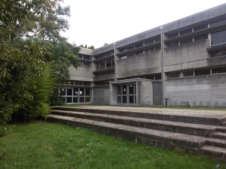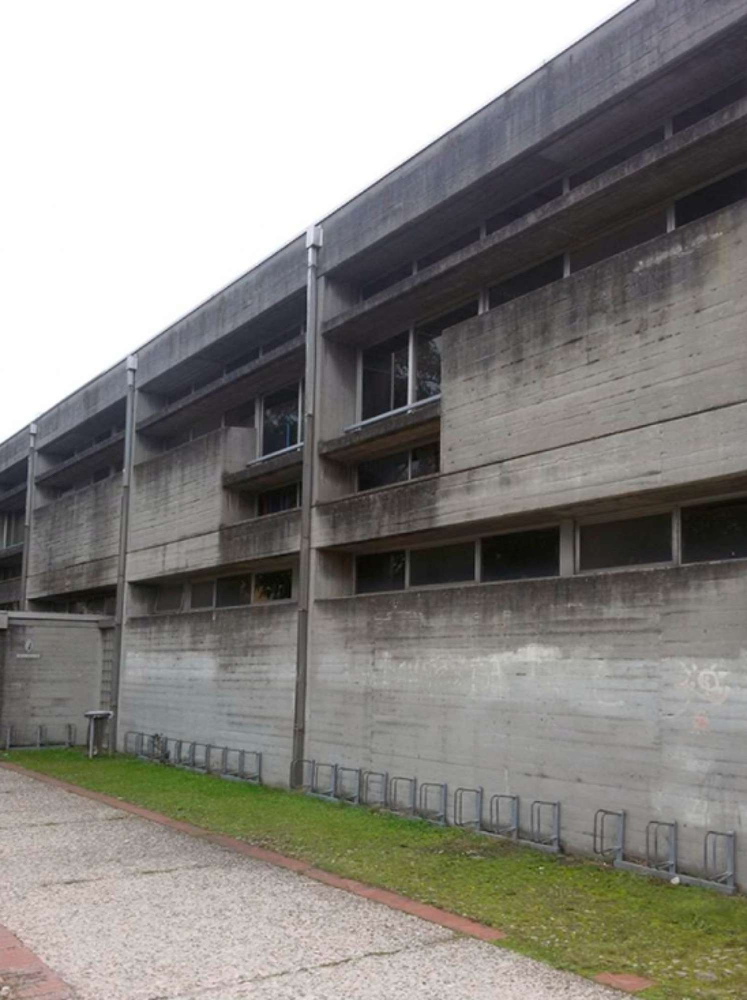Il linguaggio pienamente "brutalista" si esalta nei massici blocchi delle palestre, in cui si accatastano ordinatamente le tracce dei casseri lignei sulle facciate. Questo viene però temperato dalla articolazione degli affacci delle aule e dei percorsi, dove il disegno delle facciate si sgrana con il ricorso anche ad elementi in vetrocemento.