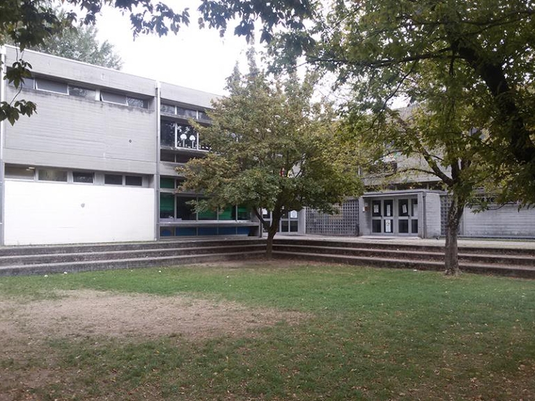 La scuola elementare trova luogo al piano inferiore sul retro. Qui le aule si inseguono, aprendosi sugli spazi aperti dei giardini, definiti dagli stessi moduli a “L” a un unico piano; dal fronte principale si apre un affaccio ritirato e protetto. Sulla strada altri corpi edilizi a pianta rettangolare si innestano ortogonalmente al sistema modulare. Questi articolano altimetricamente il complesso, presentando un piano superiore che ospita la scuola media e gli uffici. La scansione tra anditi nascosti e i corpi delle aule, risulta piacevole.