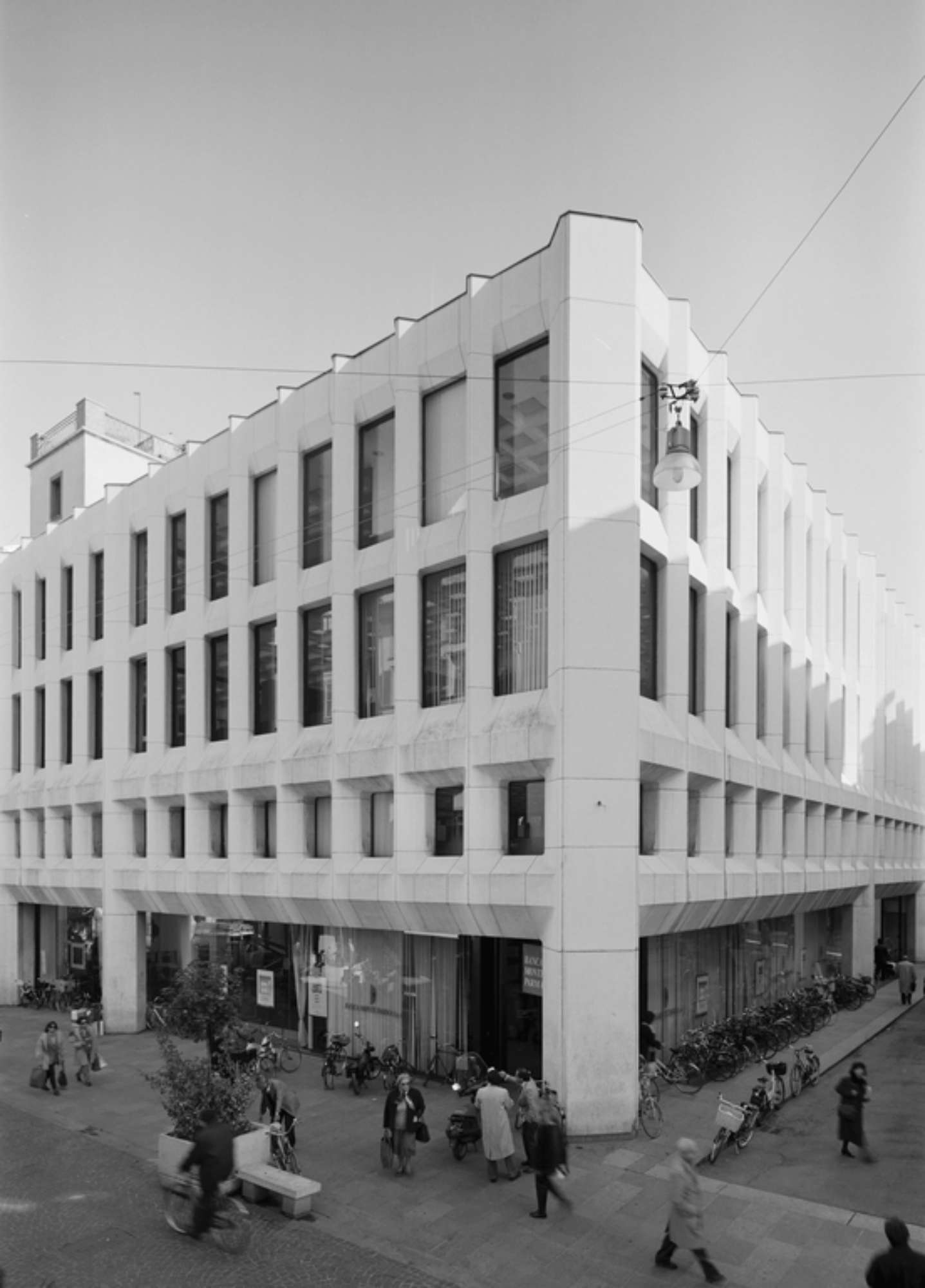 La modulazione dello spazio interno, impostata su dimensionamenti standard delle attrezzature e degli impianti necessari agli spazi per uffici, si riflette anche esternamente, determinando la netta scansione delle facciate.