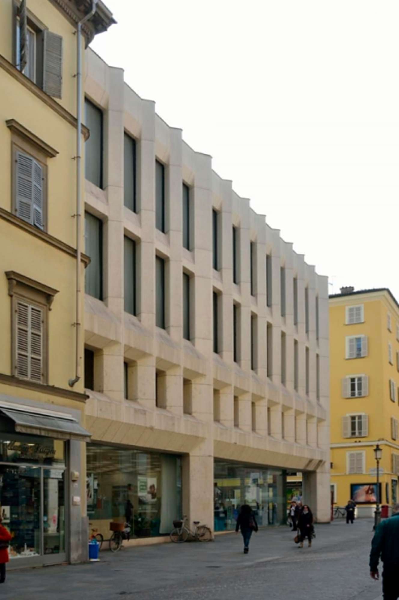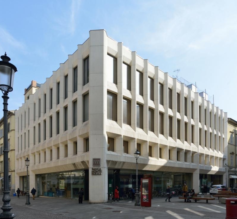 Situato nel centro storico in prossimità di Piazza Garibaldi, all’interno di un’area soggetta a profonda trasformazione nel corso del Secondo Dopoguerra, l’edificio sostituisce la precedente sede della banca del Monte, realizzata nei primi anni del Novecento in stile Liberty.