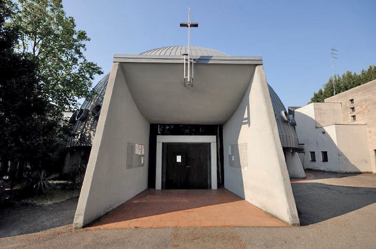 Ad ovest un corpo a forma di parallelepipedo realizzato nella seconda metà degli anni '80 contiene il salone per l'oratorio e varie aule e servizi per le opere di pastorale della comunità.