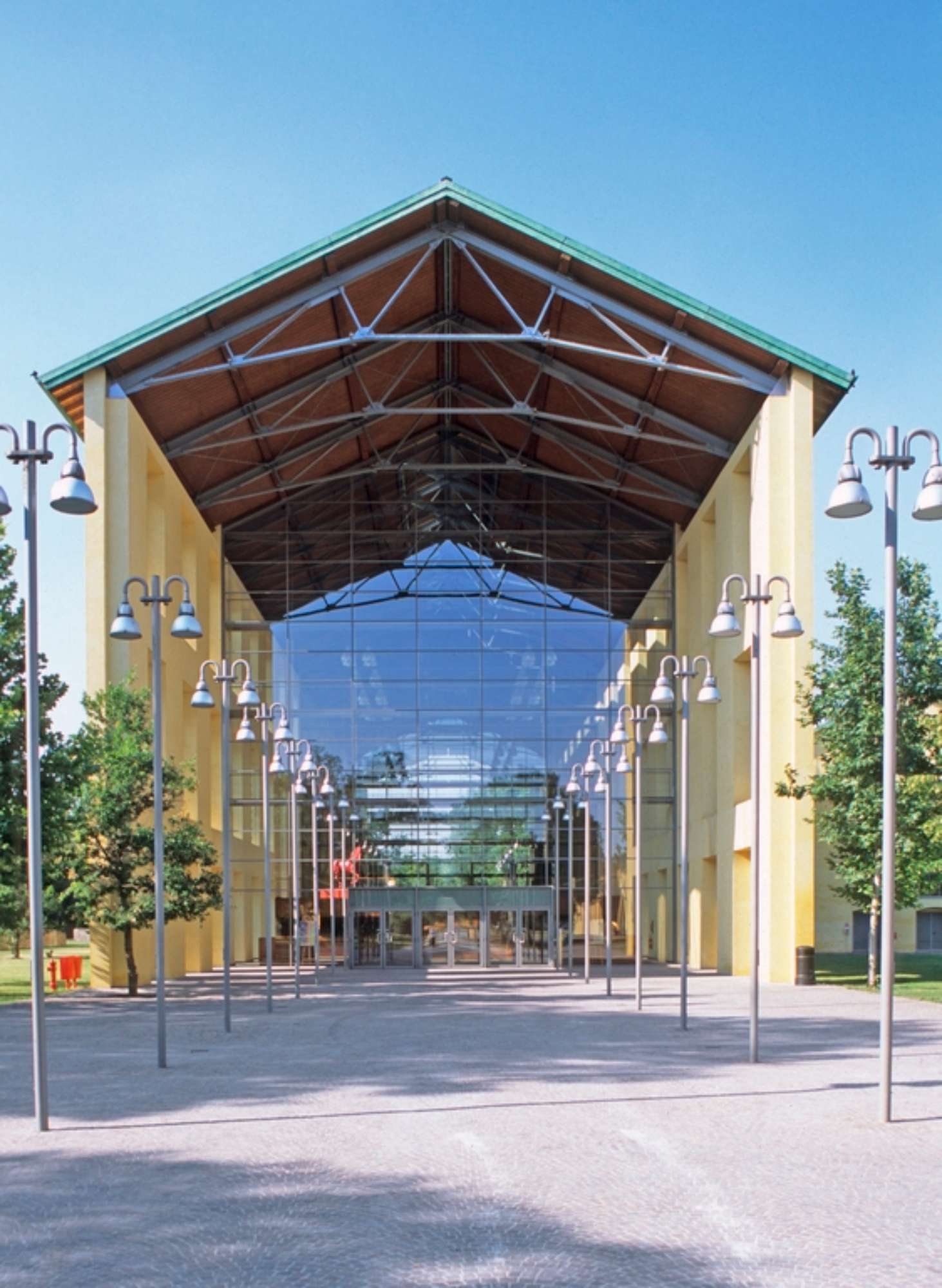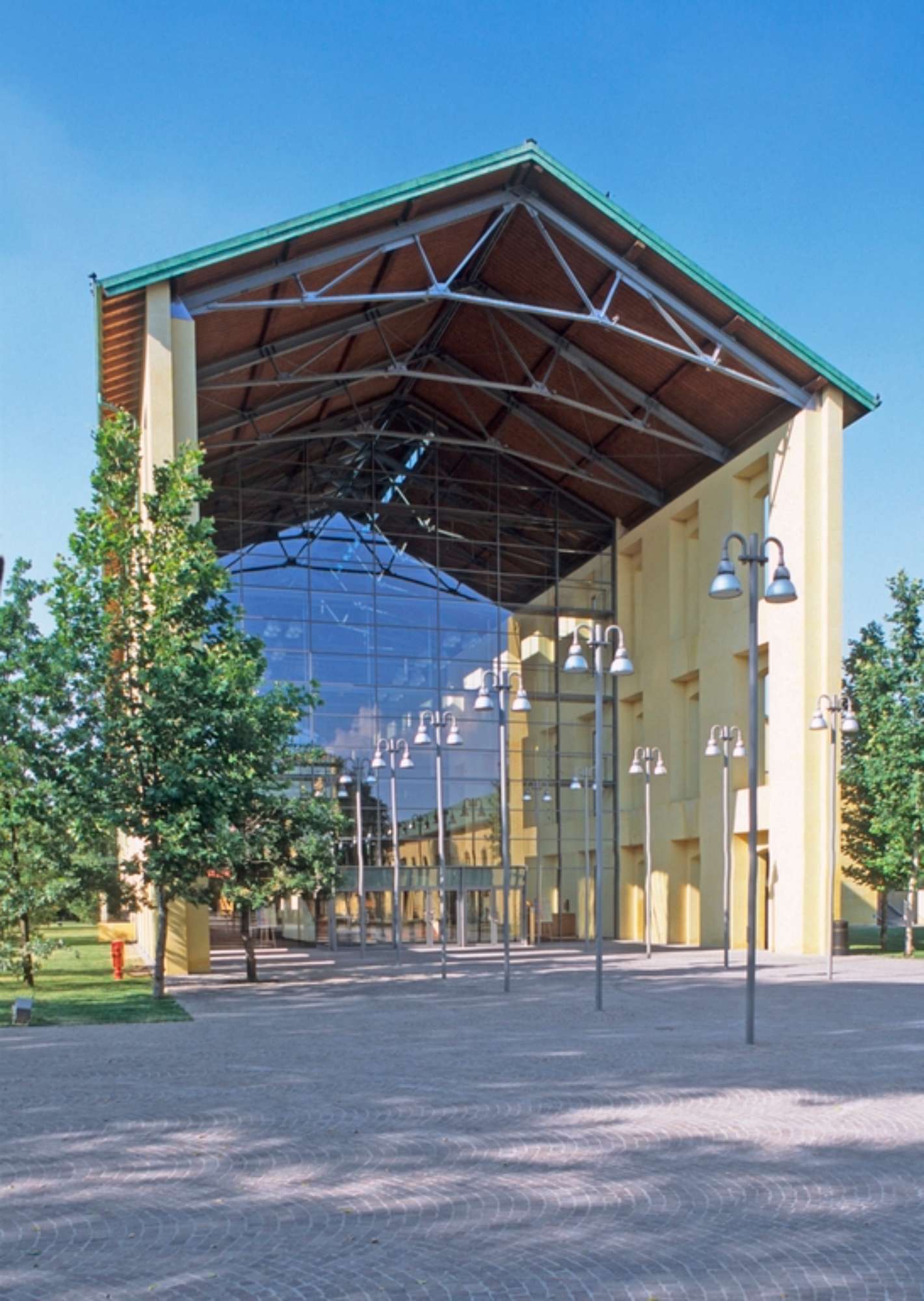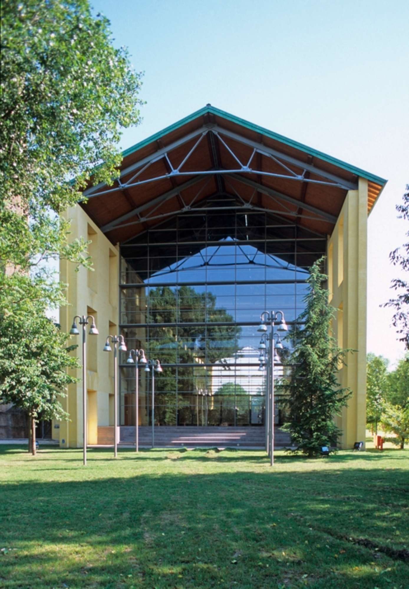 Il progetto prevede la conservazione, oltre che della ciminiera, memoria del passato industriale del complesso, dell’involucro del fabbricato principale, lungo ottanta metri e coperto da capriate in acciaio, privato, tuttavia, dei tamponamenti trasversali in modo da “aprire” l’edificio e ottenere un “effetto cannocchiale”, che grazie alla sostituzione delle pareti nord e sud con ampie vetrate, consente di fare entrare la natura del parco circostante all’interno dell’edificio, ponendosi come quinta di fondo dei prospetti.