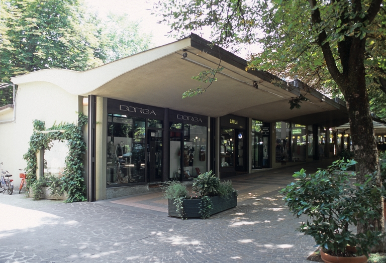 L'area è situata ad est di viale Berenini, lungo il quale i progettisti pensano di realizzare in portico alto un piano in ferro e cemento, da cui si accede ai negozi, ciascuno dei quali si compone di una sala principale per la vendita con affaccio sul viale e di un locale più piccolo per i servizi, con accesso sul retro. La copertura della sala per la vendita è costituita dall’altra metà della struttura del porticato, che all’esterno si protrae in avanti in un movimento a onda in direzione della piscina. Il locale sul retro è dotato di una copertura piana più bassa rispetto a quella del porticato; questa differenza di quota permette l’inserimento di una finestra a nastro su lato sud che consente l’illuminazione diretta della sala grande.