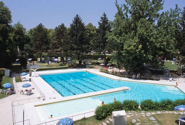 Il progetto prevede, inoltre, la realizzazione di una piscina per l’albergo e il collegamento al parco nel Grand Hotel des Thermes, per il quale si rendono necessari grandi opere di movimento terra e di messa a dimora di alberi ad alto fusto che creano, insieme alla pavimentazione in beola, i percorsi di attraversamento interni. La sistemazione del parco ha consentito che la piscina venisse posta alla base di un anfiteatro naturale, formato da piani degradanti; i diversi livelli permettono di regolare l’affluenza del pubblico degli spettacoli a bordo vasca.