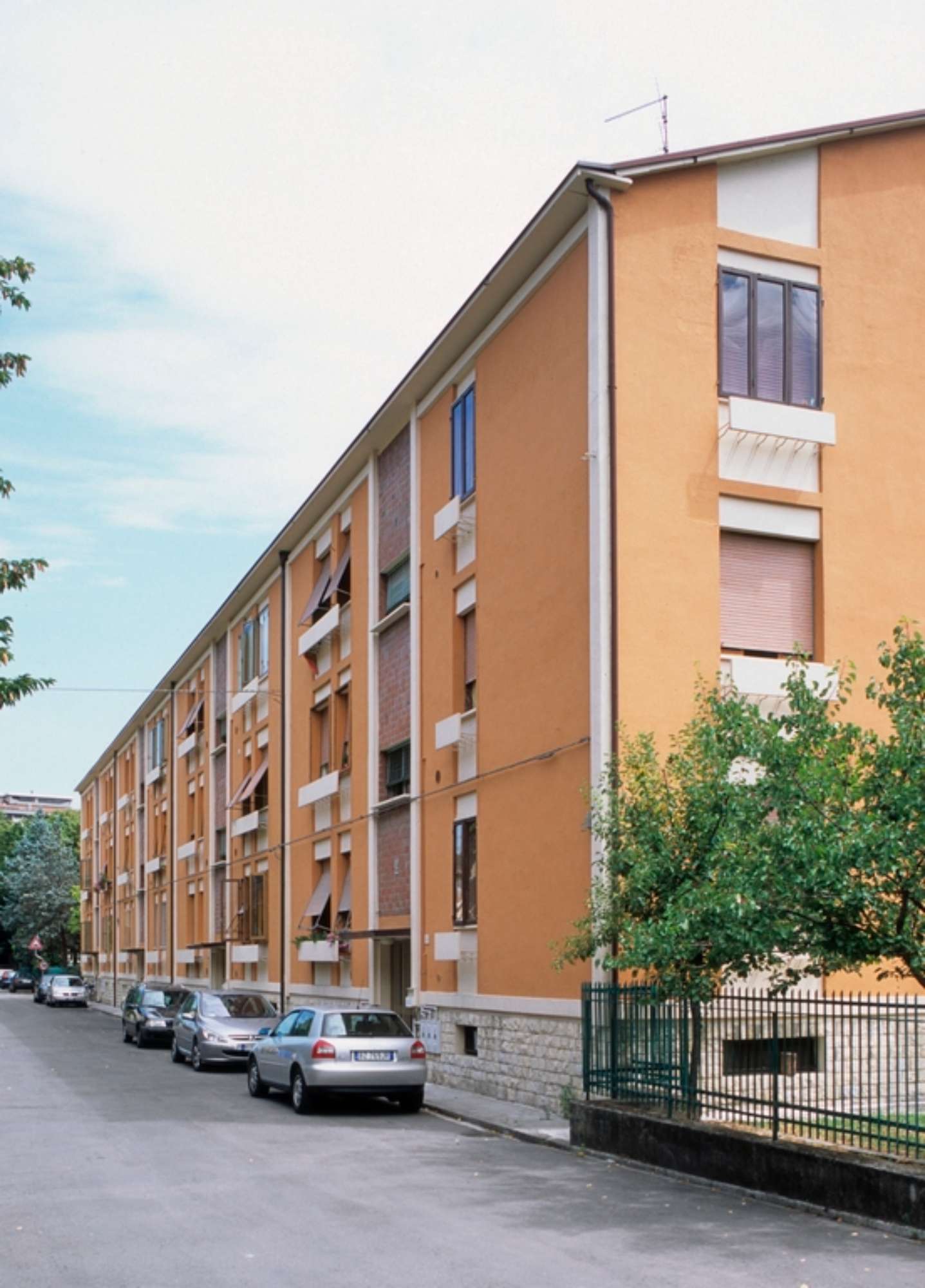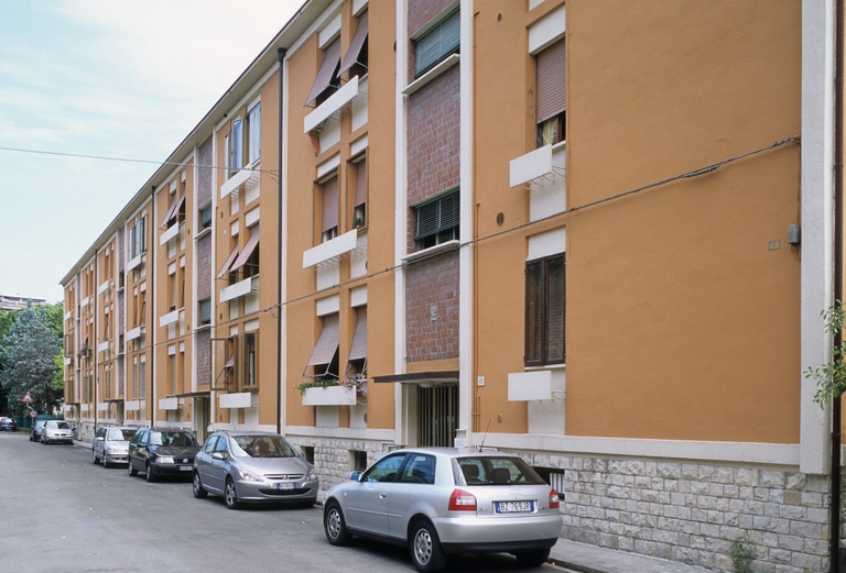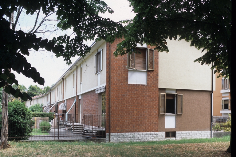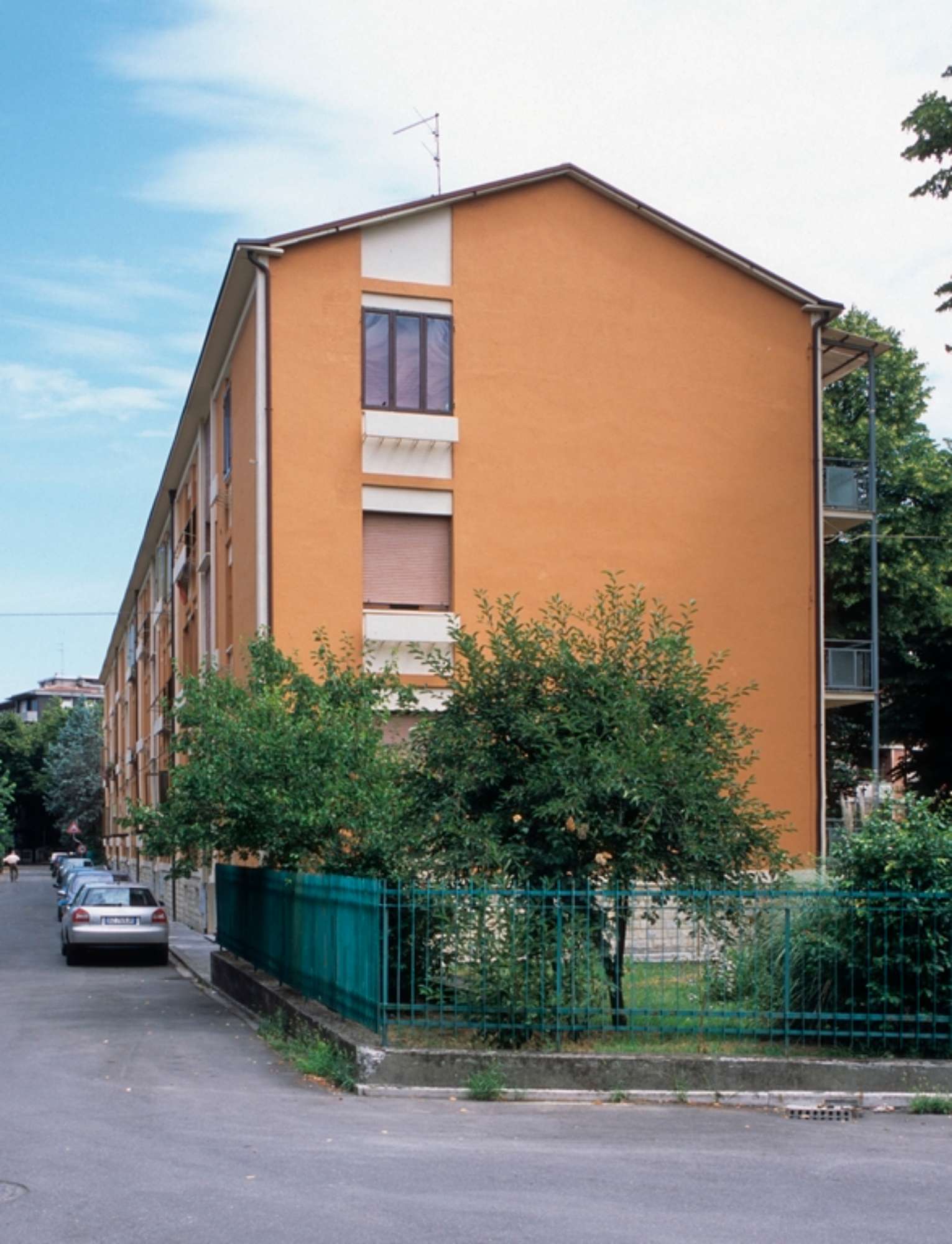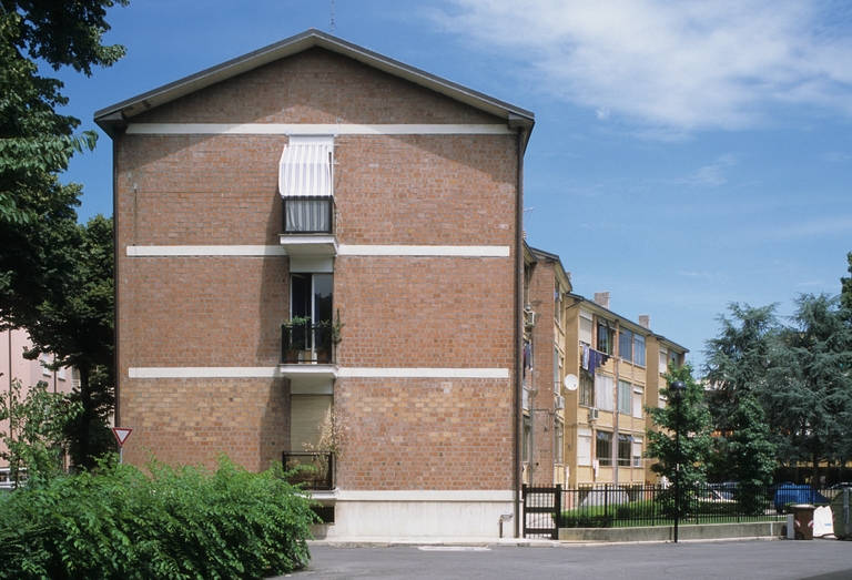Il complesso residenziale è realizzato da Magistretti immediatamente dopo la realizzazione delle case per i Reduci al quartiere QT8 di Milano. Rispetto a questo, i blocchi edilizi dell’intervento piacentino si caratterizzano per una maggiore rigidità, legata in gran parte alla diversa tipologia, composta da corpi in linea di tre piani più uno rialzato, con due appartamenti di tre vani ciascuno per livello, serviti da vano scala senza ascensore. L’ingresso è posto sul lato ovest in prossimità dei soggiorni, su cui affacciano le cucine. Il lato opposto su cui affacciano le camere, è caratterizzata da uno scarto di una porzione del setto murario che ospita un piccolo balcone, unico elemento di rottura volumetrica dei blocchi edilizi. Rispetto alle abitazioni milanesi, in cui la ricerca di un linguaggio moderno contaminato da elementi della tradizione costruttiva locale si manifesta nei profili di copertura e nella composizione dei fronti, qui la necessità di realizzare alloggi a basso costo, si traduce nella scelta di un aspetto ultra-popolare ed essenziale, conferito dalla regolare sporgenza degli aggetti e dal solo intonaco di rivestimento, la cui uniformità è interrotta dagli inserti in cemento armato martellinato dei davanzali e del basamento del piano seminterrato.