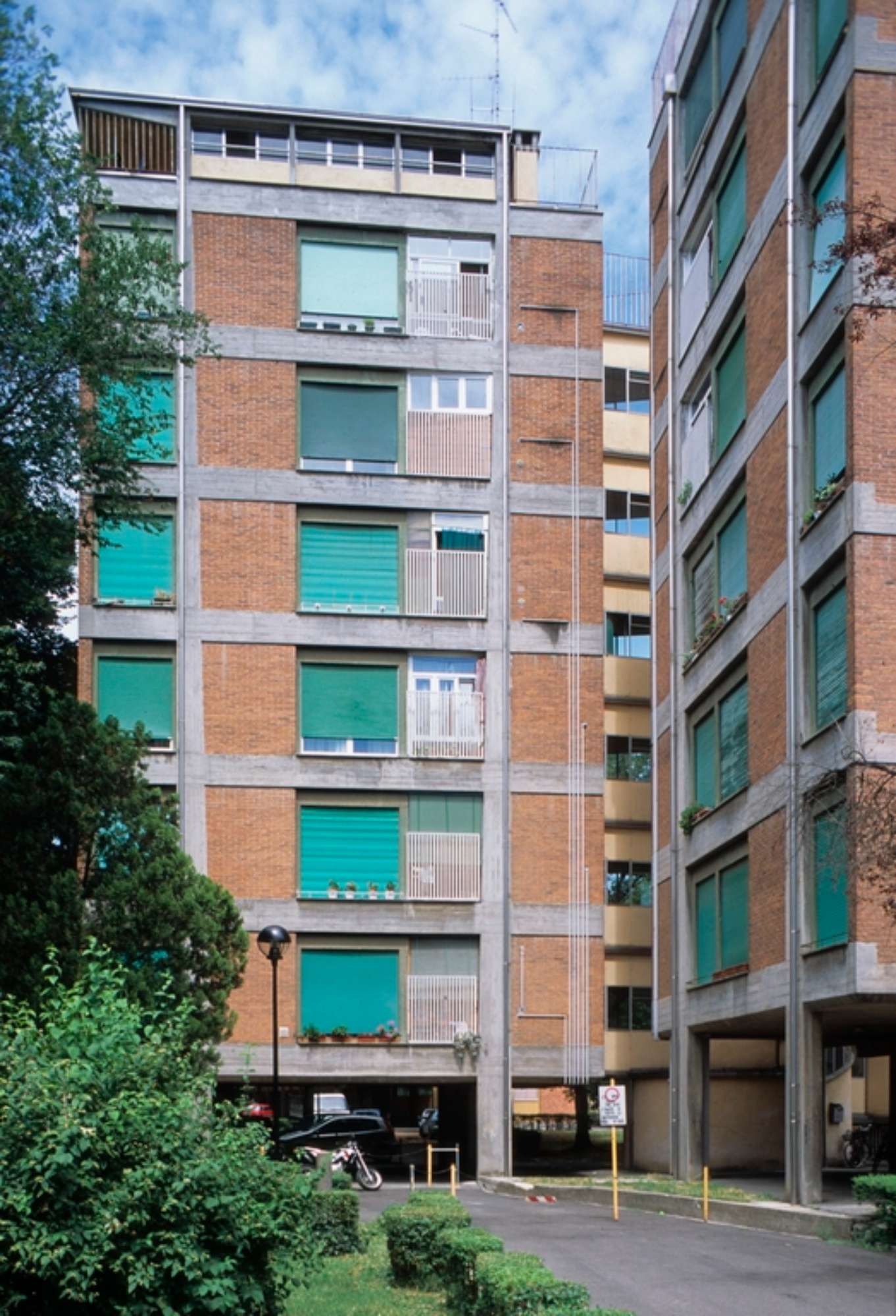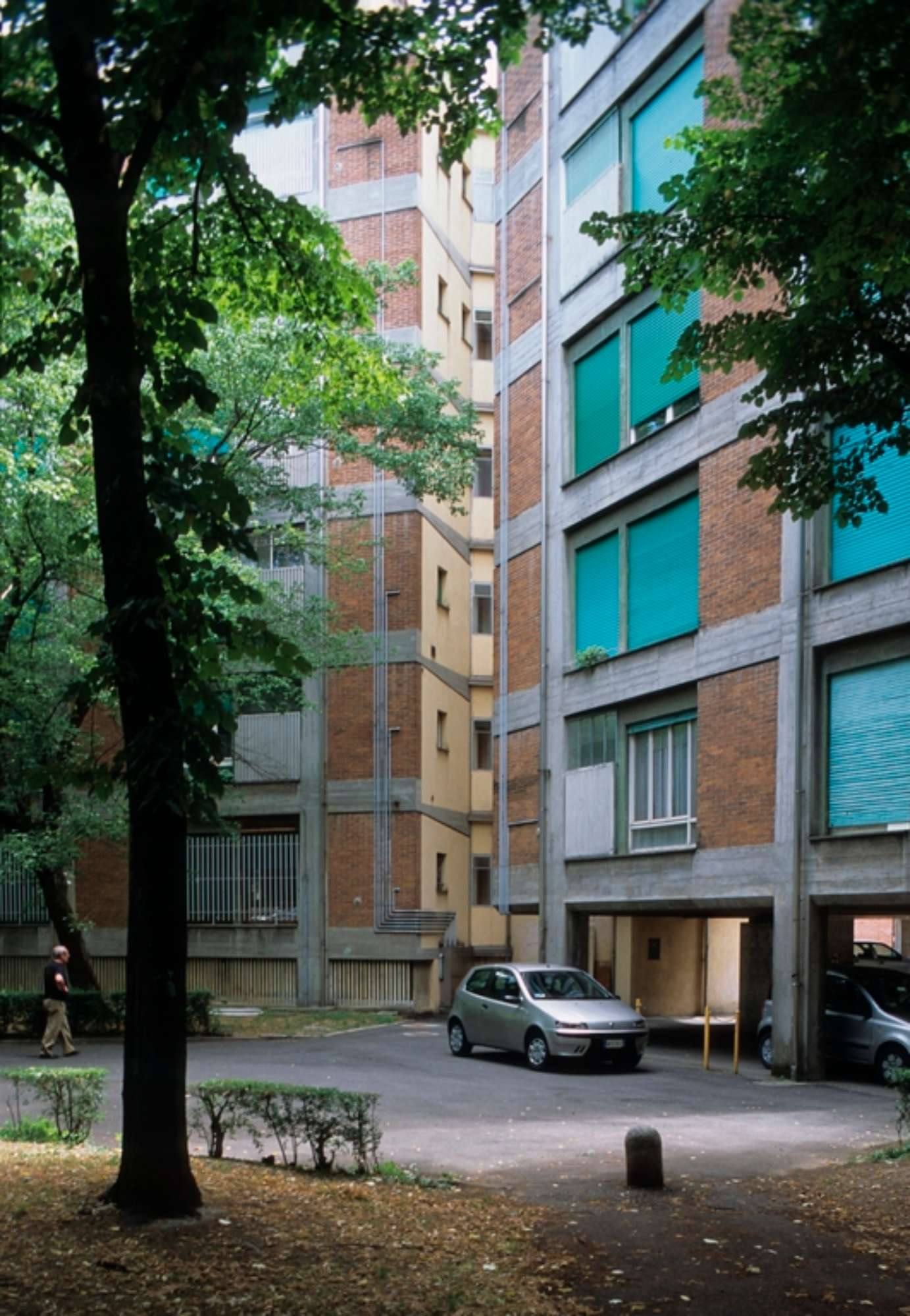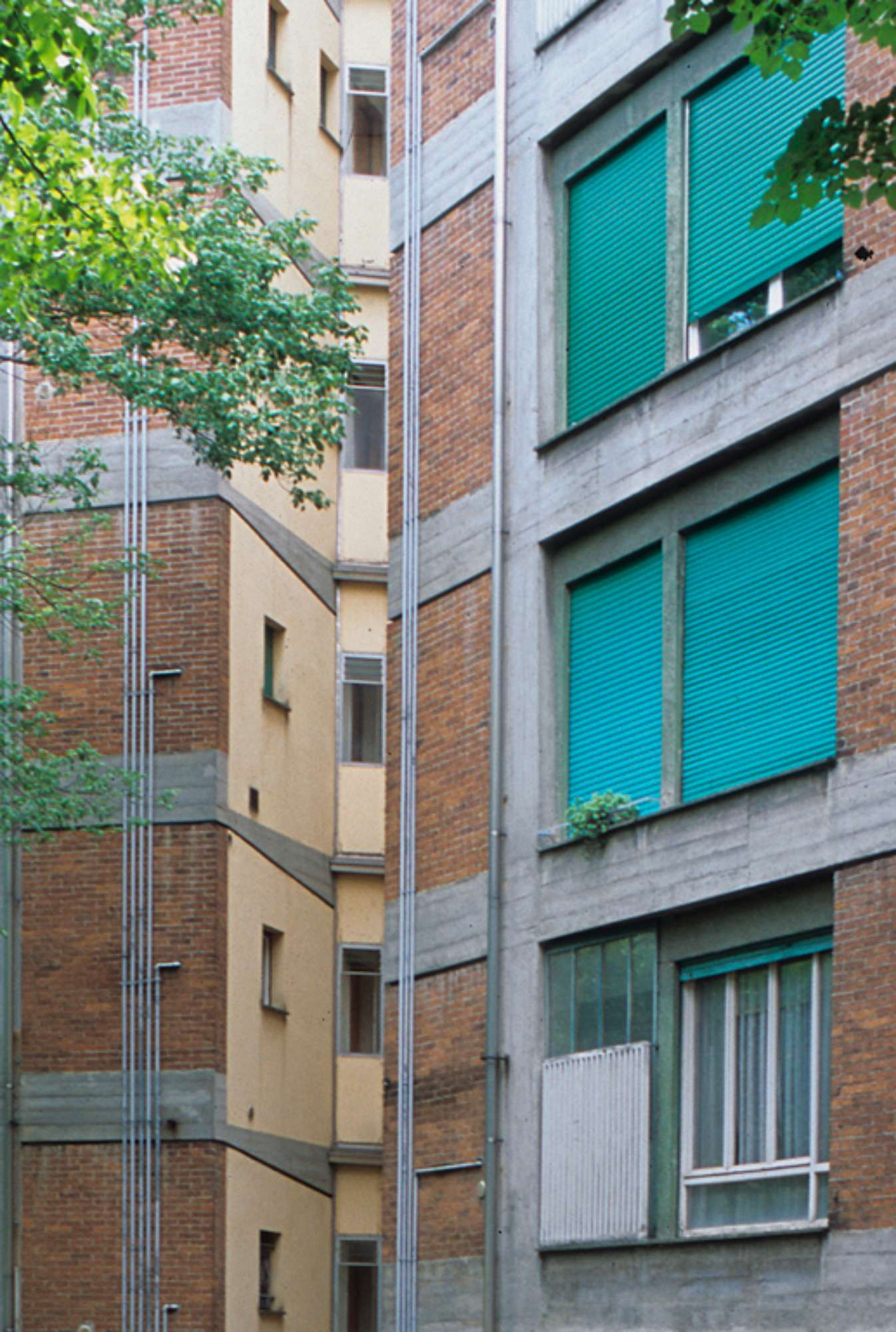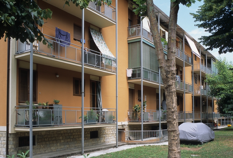 Il complesso residenziale è realizzato da Magistretti immediatamente dopo la realizzazione delle case per i Reduci al quartiere QT8 di Milano. Rispetto a questo, i blocchi edilizi dell’intervento piacentino si caratterizzano per una maggiore rigidità, legata in gran parte alla diversa tipologia, composta da corpi in linea di tre piani più uno rialzato, con due appartamenti di tre vani ciascuno per livello, serviti da vano scala senza ascensore. L’ingresso è posto sul lato ovest in prossimità dei soggiorni, su cui affacciano le cucine. Il lato opposto su cui affacciano le camere, è caratterizzata da uno scarto di una porzione del setto murario che ospita un piccolo balcone, unico elemento di rottura volumetrica dei blocchi edilizi. Rispetto alle abitazioni milanesi, in cui la ricerca di un linguaggio moderno contaminato da elementi della tradizione costruttiva locale si manifesta nei profili di copertura e nella composizione dei fronti, qui la necessità di realizzare alloggi a basso costo, si traduce nella scelta di un aspetto ultra-popolare ed essenziale, conferito dalla regolare sporgenza degli aggetti e dal solo intonaco di rivestimento, la cui uniformità è interrotta dagli inserti in cemento armato martellinato dei davanzali e del basamento del piano seminterrato.