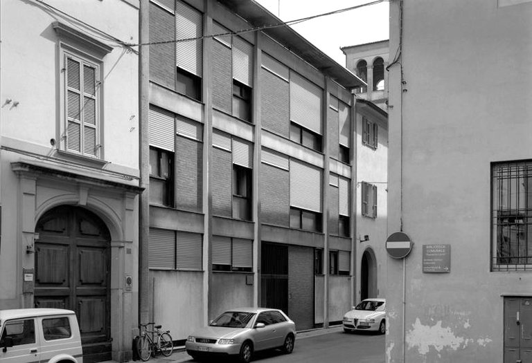 Il primo progetto prevede l’elevazione dei piani destinati a residenze in duplex, su una parete cieca a memoria del muro che recintava il giardino dell’ottocentesco edificio posto a fianco. Il fronte mantiene la linea di gronda dell’edificio di destra mentre l’altezza dei parapetti delle finestre del secondo piano, media le altezze delle cornici delle finestre di quello di sinistra. La fascia di finestre orizzontali poste sotto il solaio del primo piano, determina la netta divisione della parte destinata ad uffici, da quella destinata ad abitazioni, le cui aperture seguono dimensionamenti e proporzionamenti autonomi, legati alla funzione.