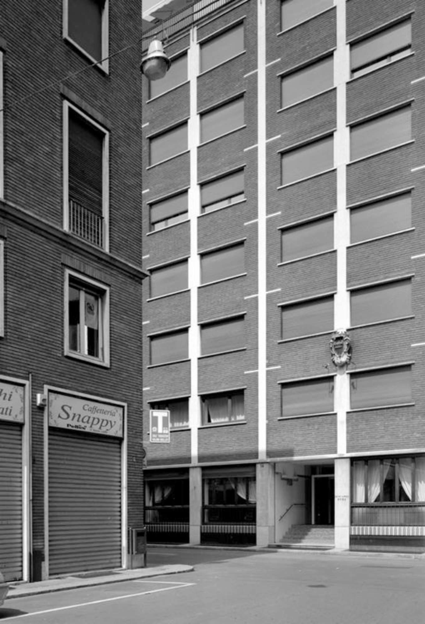 La soluzione finale procede nella direzione di una chiara regolarizzazione della composizione del fronte, senza aggetti e scandito dalla sequenza dei pilastri bianchi che disegnano nettamente, sul fondo in mattoni faccia a vista che caratterizza tutti i sei piani tipo, elementi lineari alternati: segmenti perpendicolari a partire dall’angolo, alternati a un ispessorimento della larghezza del rivestimento del pilastro ad occupare il vuoto delle finestre orizzontali, tutte allineate e disposte a bandiera a bandiera a destra e a sinistra del montante.