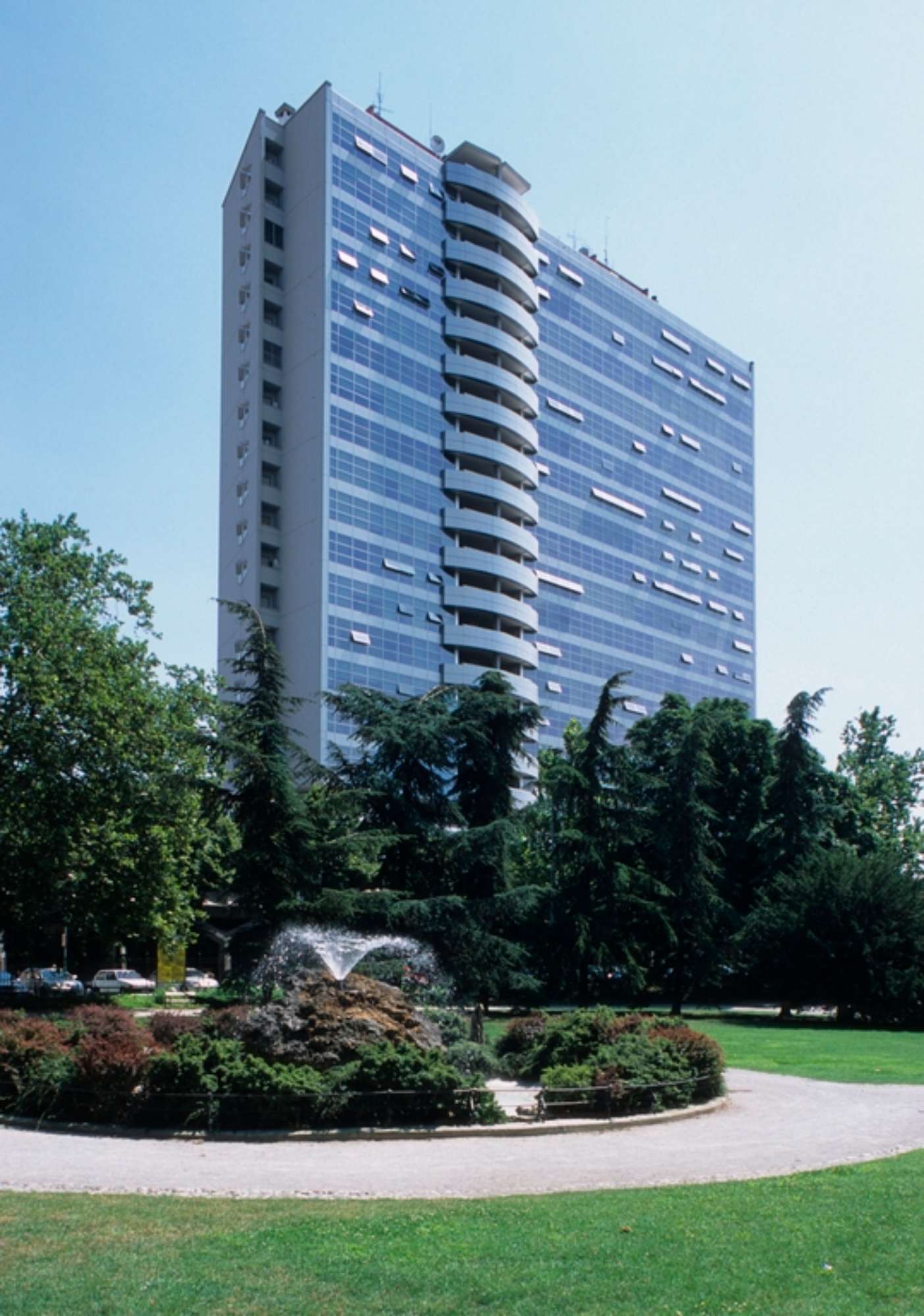 L’edificio sorge sul sedime dell’ex Molino Rebora, in un’area contigua alla stazione ferroviaria e ai giardini pubblici. Con i suoi 65 metri di altezza che sviluppano 22 piani fuori terra (due sono interrati), il grattacielo è la più alta costruzione della città. Il primo progetto, poi non realizzato, è redatto dall’architetto Ranzani di Milano, e prevedeva un edificio a torre, di forma poligonale irregolare, con volumi sporgenti su tutti i lati, sfalsati da piano a piano, in modo da conferire un forte movimento alle masse, unitamente allo sviluppo in verticale.
