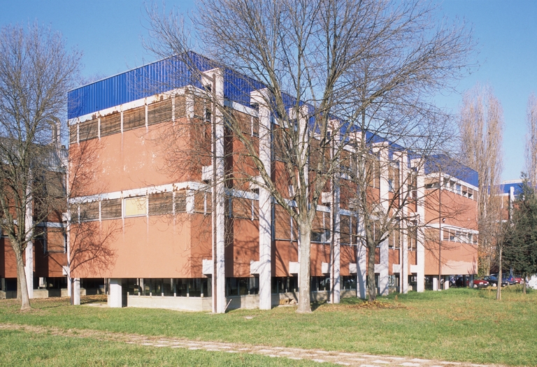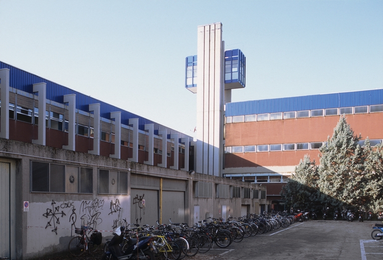 Il progetto dell’Istituto è datato 1961, ma sarà realizzato per parti: l’ingresso e il corpo adibito alle aule nel 1962-1964, a seguire i laboratori, nel 1964-1968, poi le officine nel 1970-1978 e, infine, la palestra nel 1981. L’aula magna prevista nel progetto iniziale su viale Marconi non fu mai realizzata.