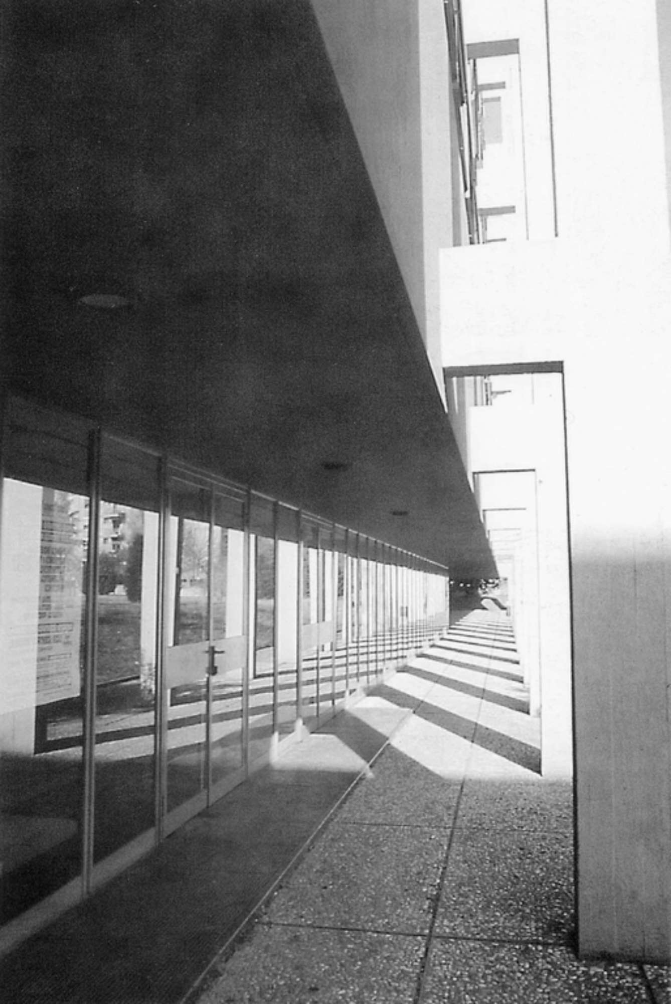 La struttura in cemento armato emerge con forza nell’intera composizione. I pilastri infatti sono portati all’esterno della parete, non per un motivo formale, ma per garantire una maggiore funzionalità all’intero complesso. In questo modo gli impianti avrebbero potuto correre ininterrottamente sotto alle finestre a nastro, senza essere intralciati in nessun modo da elementi verticali.
