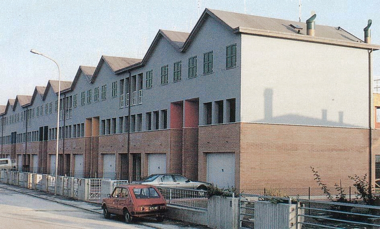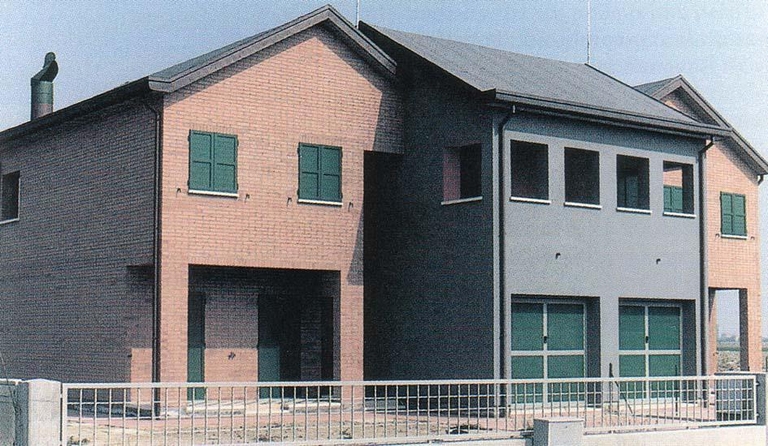 Questo complesso residenziale è costituito da sei case bifamiliari e da un edificio a schiera comprendente 14 alloggi. Il luogo in cui sorge è la frangia di confine tra un piccolo borgo formato da case unifamiliari in prossimità della basilica di S. Apollinare in Classe e il territorio agricolo verso Ravenna. L’aspetto di questa zona è quello di una periferia urbana con caratteristiche decisamente “umane”, sia per le dimensioni delle residenze, sia per la presenza in ognuna di esse di piccoli giardini privati, sia per i campi coltivati che la circondano. Il concetto di disegnare un’intera strada e quindi un pezzo di città ci ha guidati nella progettazione. La tipologia, origine del progetto è stata indicata dalla committenza. Si è cercato di costruire con un tipo scelto, una tipologia data e normative esistenti, una forma urbana che potesse essere riconoscibile attraverso la compiutezza. Essa è data dalla forma complessiva dell’intervento che, pur nella ripetizione e nella diversa composizione degli stessi elementi, assume il luogo come determinante. La nuova strada è costituita da un lato dalla stecca delle case a schiera che definisce la fine del borgo e dall’altro, con il suo omologo più frazionato ( le case abbinate), il limite tra la parte urbana e la campagna. La riconoscibilità è data dall’assemblaggio e ripetizione di alcuni elementi che da quelli del tipo scendono alla microscala dei materiali, dei particolari costruttivi, dei colori. Tutti questi assieme, nessuno escluso, costituiscono l’architettura, decidendo, senza trucchi, il risultato del passaggio tra il disegno e la costruzione. Tutti gli alloggi dell’intervento hanno un giardino privato sul fronte e sul retro. I materiali della costruzione sono quelli tradizionali, vale a dire il mattone a faccia a vista, gli infissi in legno verniciato, il tetto in rame, l’intonaco.